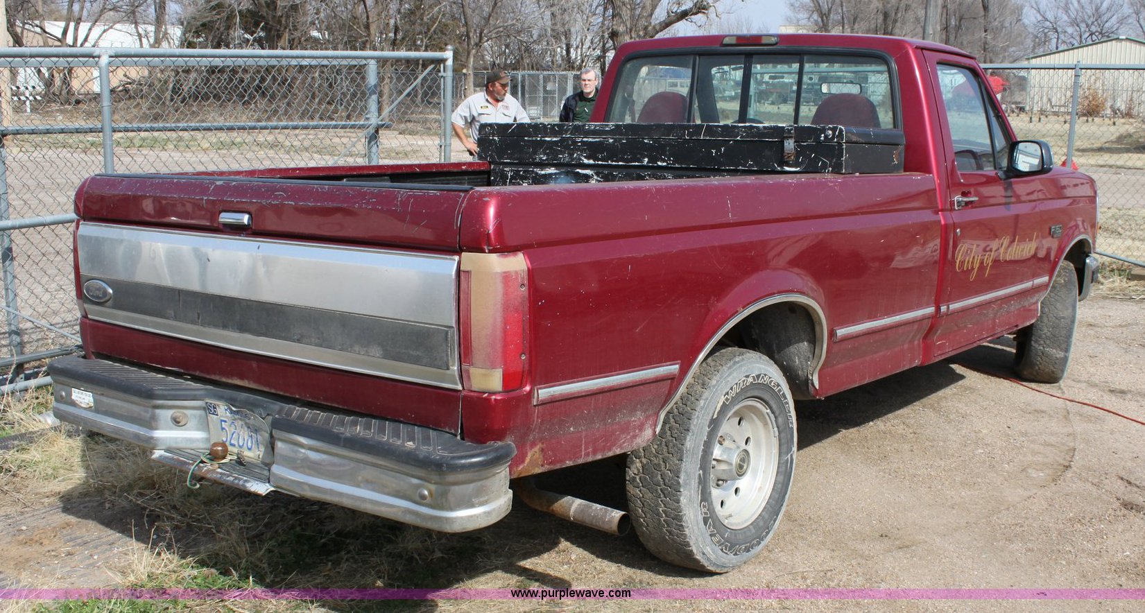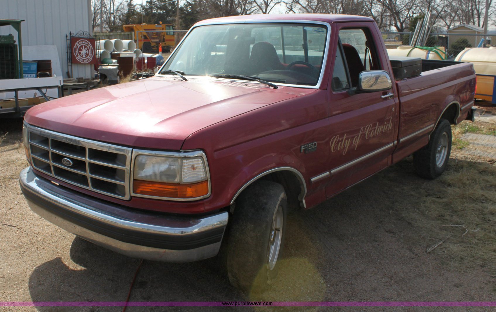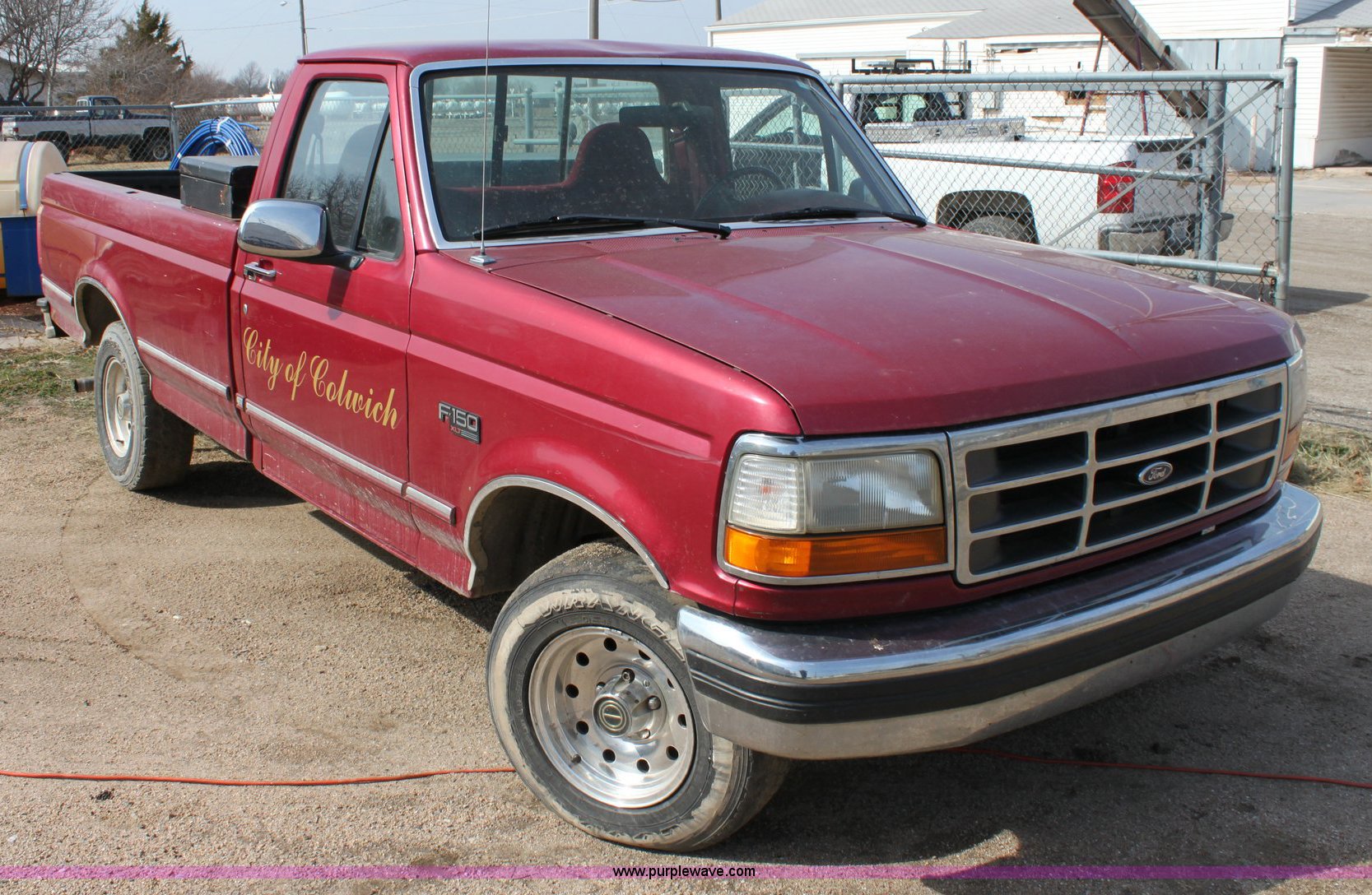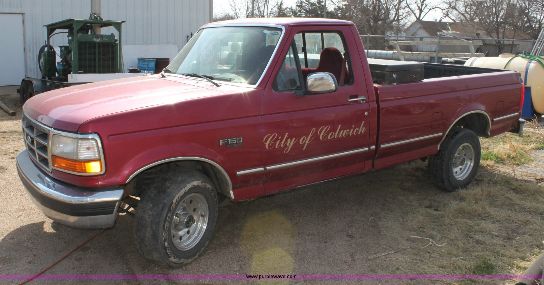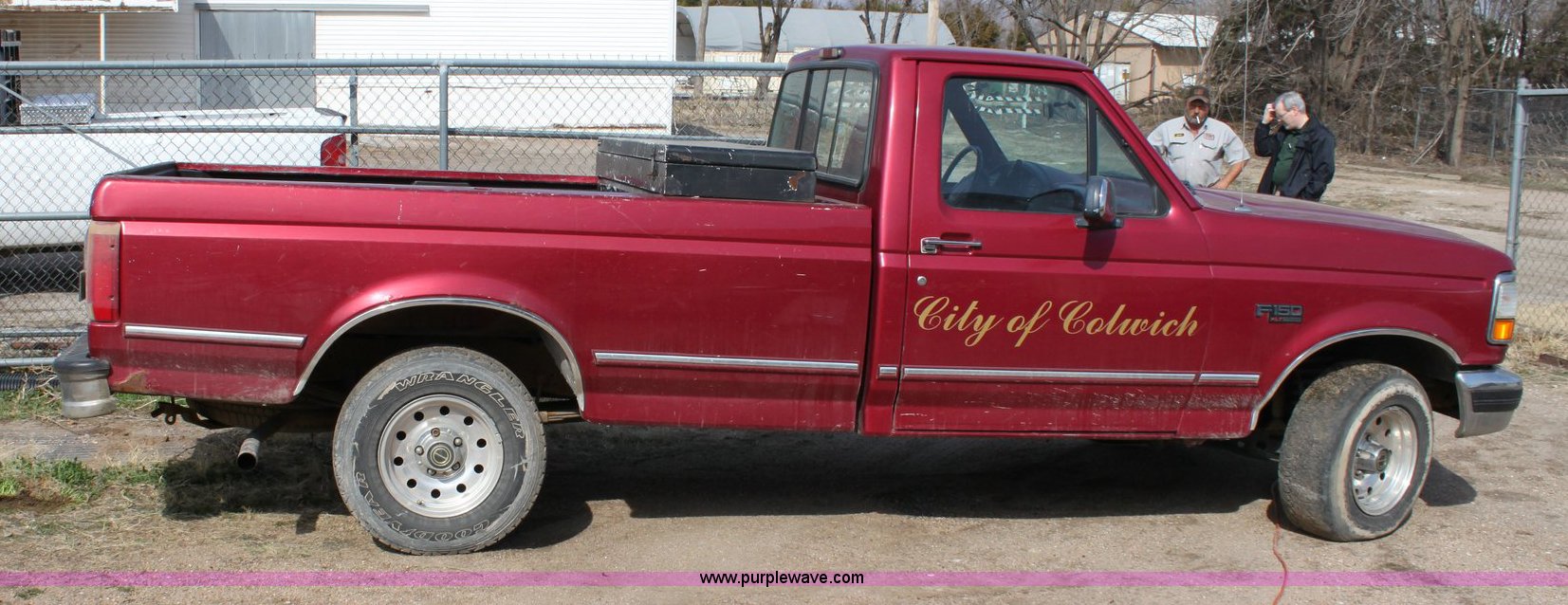 1995 Ford F150 XLT pickup truck. 123,440 miles on odometer, 5.0L V8 EFI gas engine, Automatic transmission, Two wheel drive, AC and heat, Tit, Cruise, AM/FM/Cassette, Power windows, locks, and seats, Pickup bed, Cross bed toolbox, 235/75R15 tires, Driver's inside door handle broken. Formerly salvage title. 1FTEF15N0SLC04281. City of Colwich. 115 N Third. Colwich, KS 67030