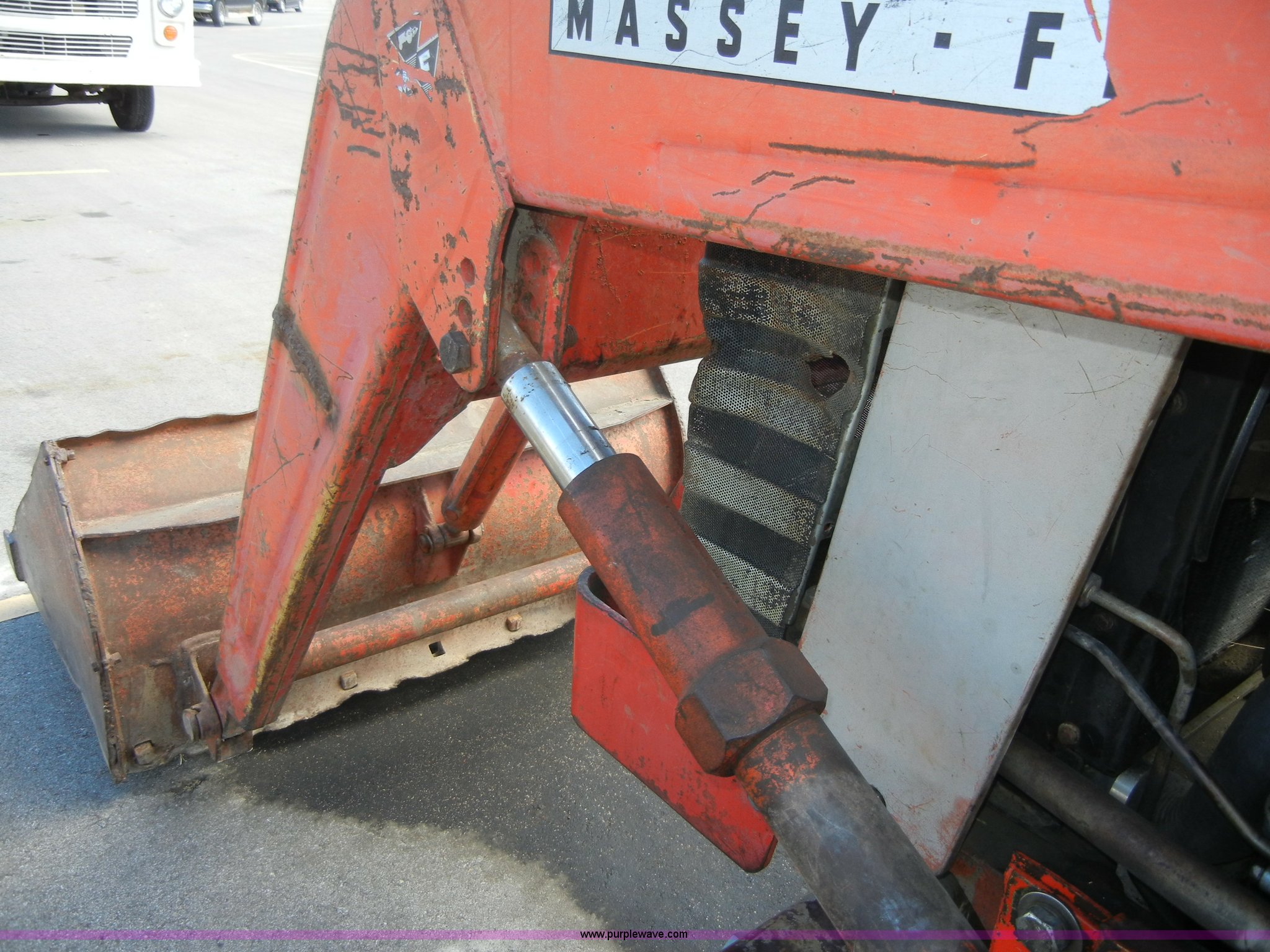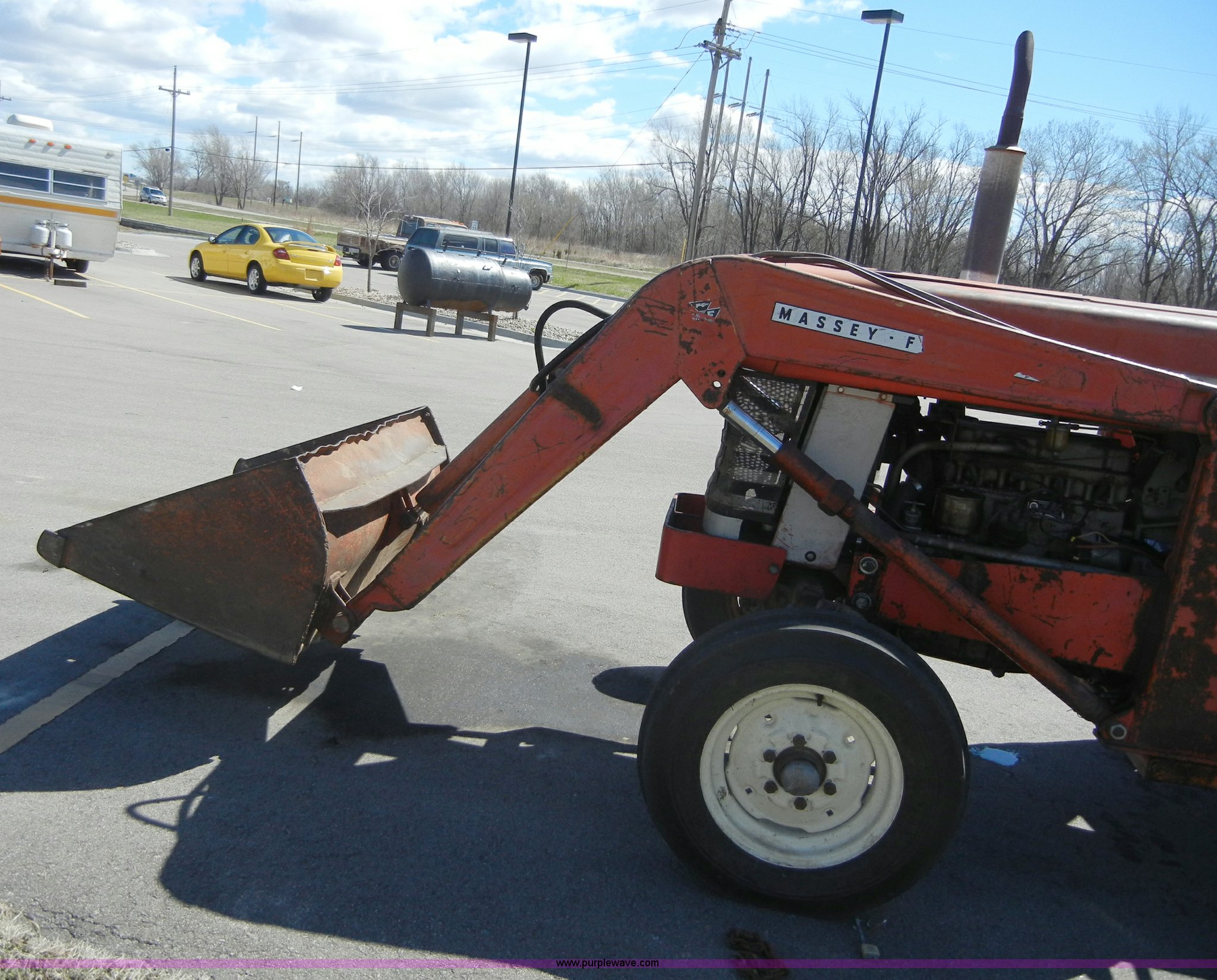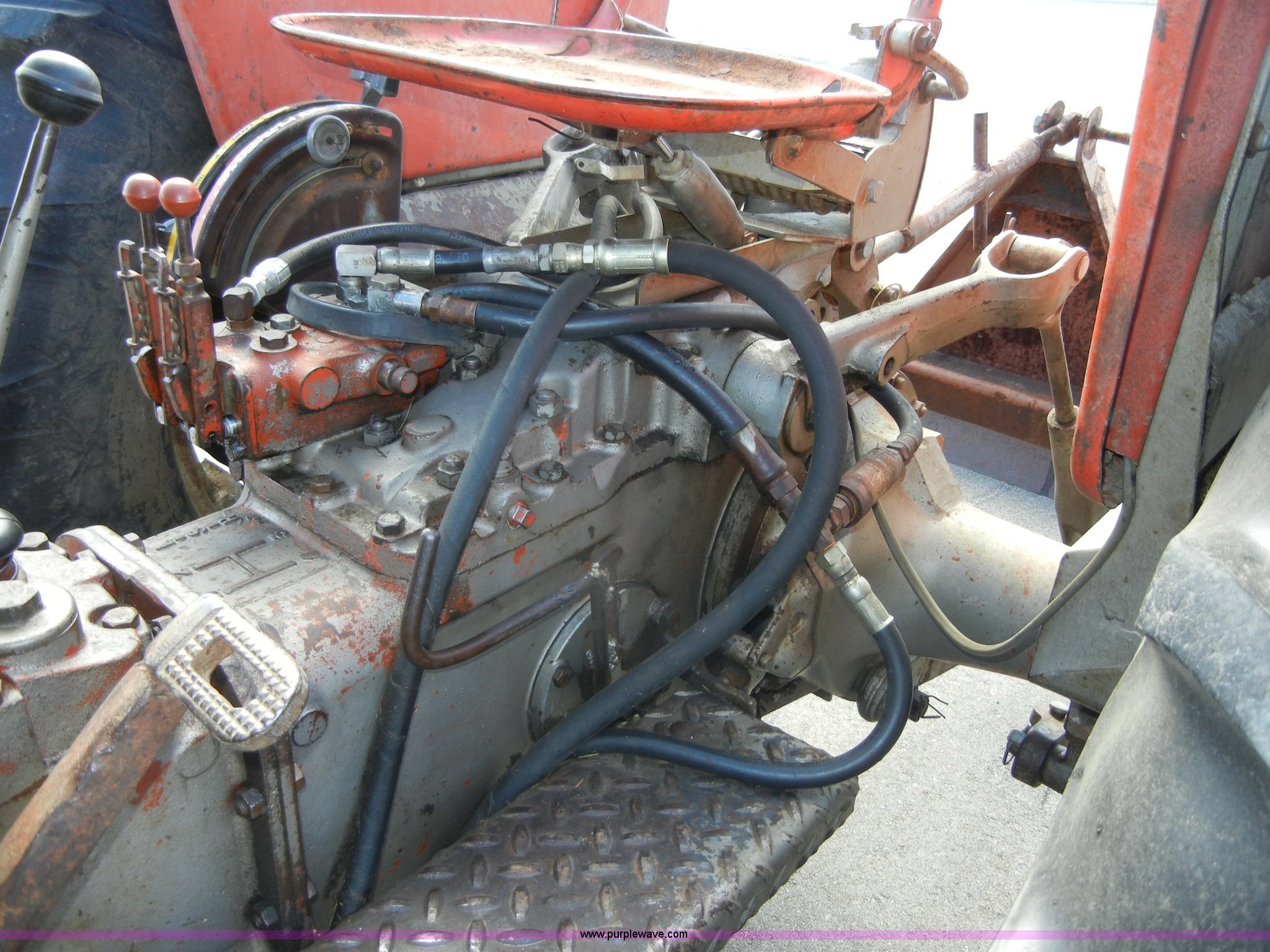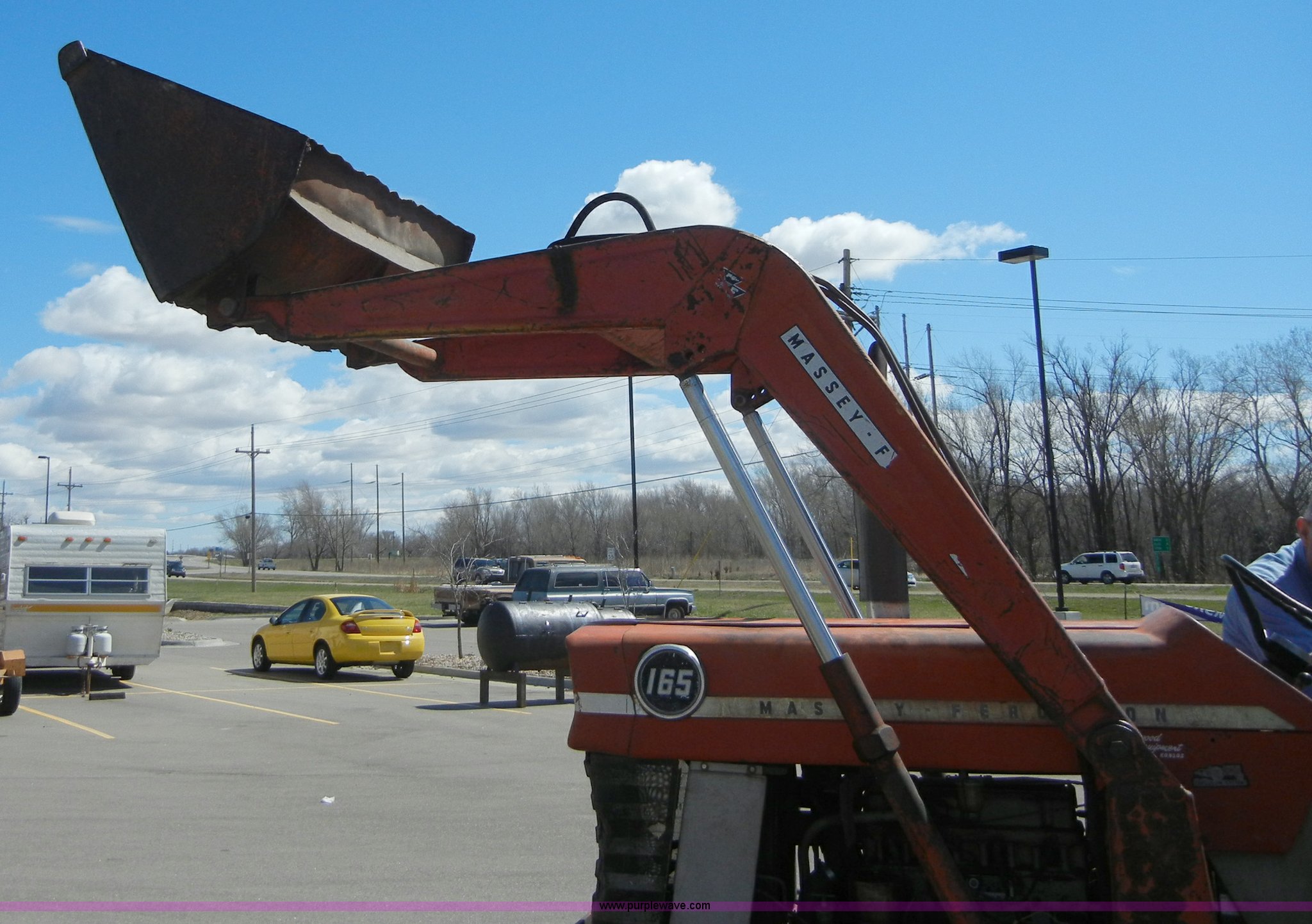 Purple Wave is selling a used Tractor in Kansas. This item is a 1972 Massey-Ferguson 165 tractor with loader with the following: 3433 hours on meter, Four cylinder gas engine, Serial G17633115, Six speed transmission with two reverse gears, Three point, Draw bar, Loader, 47" x 31" x 22" bucket, Two lever control, 95" rear blade, Model MF226, Series 2666, Serial 4627, 6.00-16 front tires, 14.9-28 rear tires, Leaks oil, about 1 quart every four to five hours, Choke rod broken, Serial S6W643007596