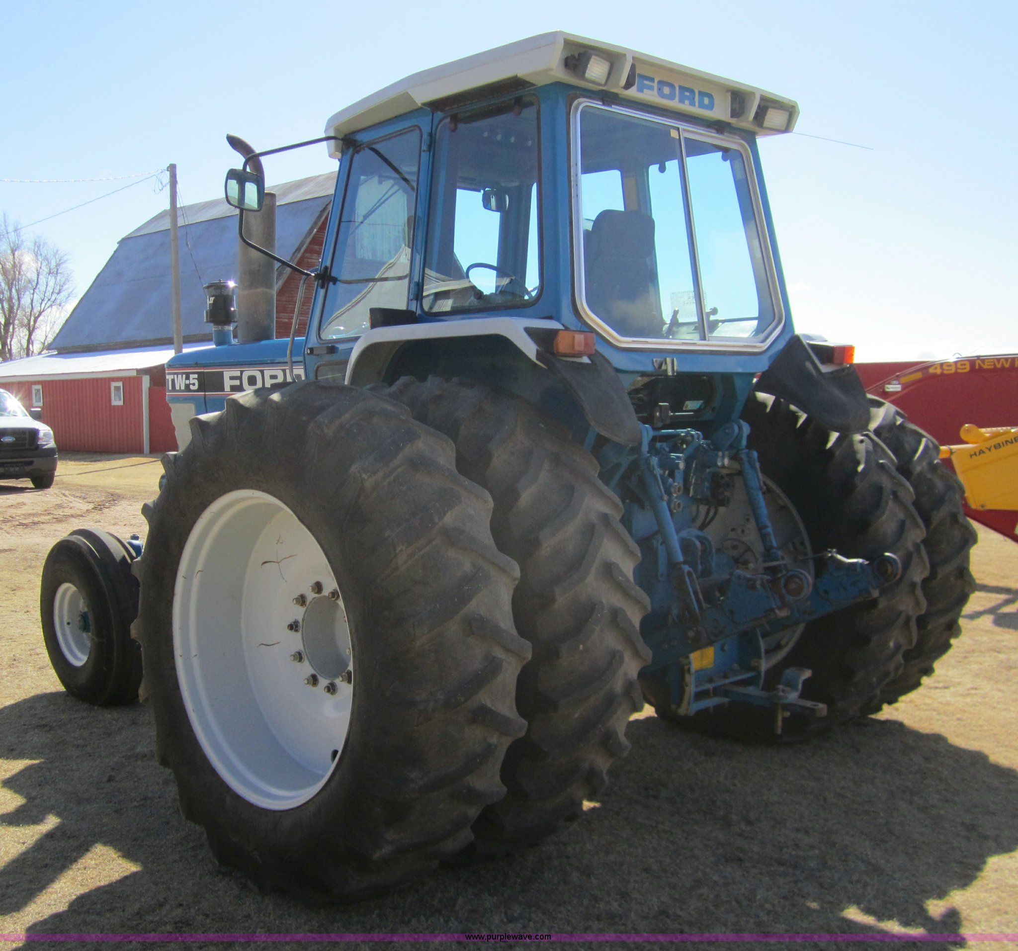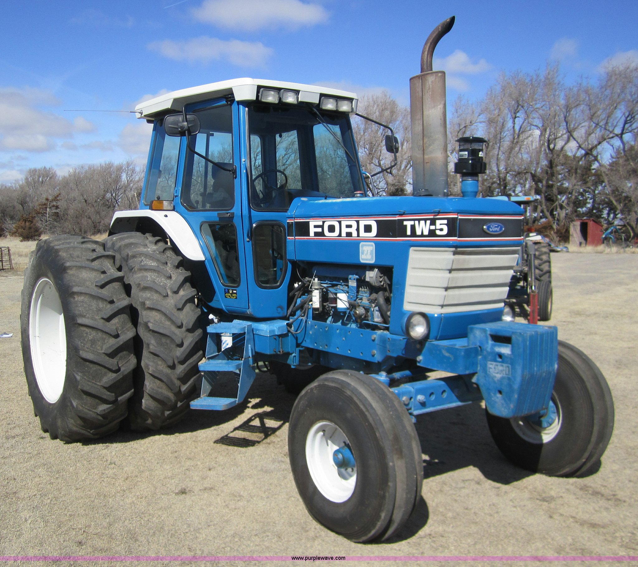 Purple Wave is selling a used Tractor in Kansas. This item is a 1989 Ford TW5 tractor with the following: 6,418 hours on meter, Ford six cylinder diesel engine, Dual Power transmission, 16 forward gears, Four reverse gears, AC and heat, Spring ride seat, AM/FM, Clock, Visor, Three point, Draw bar, Interchangeable 540 and 1000 PTO, (3) rear hydraulic remotes, (7) suitcase weights, Work lights, Recently replaced battery, Rear duals, 18.4-38 rear tires, 11.00-16 front tires, Serial A923686