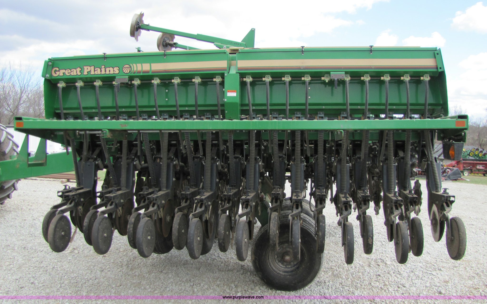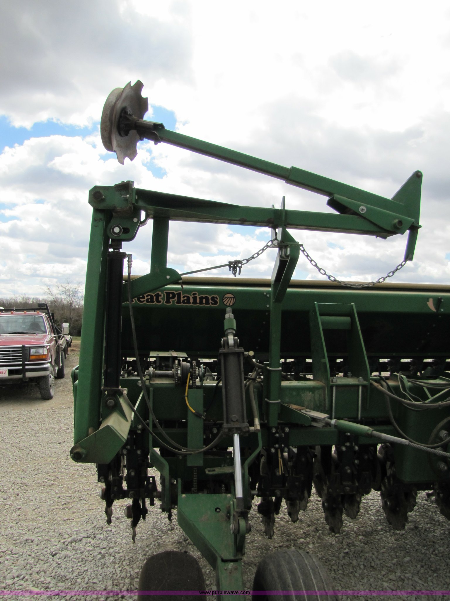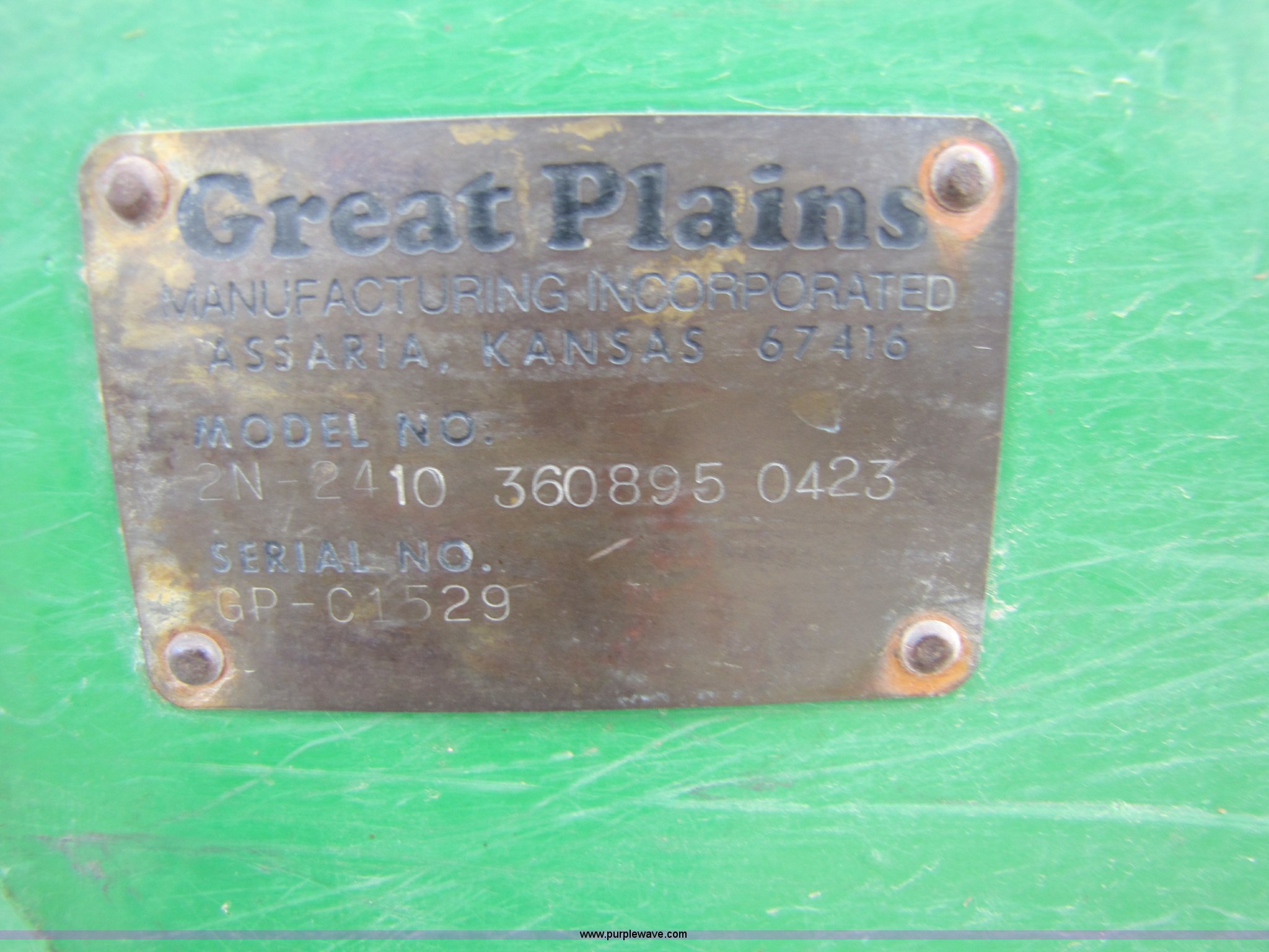 Purple Wave is selling a used Grain Drill or Seeder in Kansas. This item is a 1995 Great Plains 2N-2410 no-till drill with the following: No till 15" coulters, No-till markers, 13" seed disk, 2" x 13" press wheels, 8" spacing, Seed firmers every other row, Plugs every other row, Alfalfa seeder, Monitor, Parts book and operators manual, Serial GP-C1529