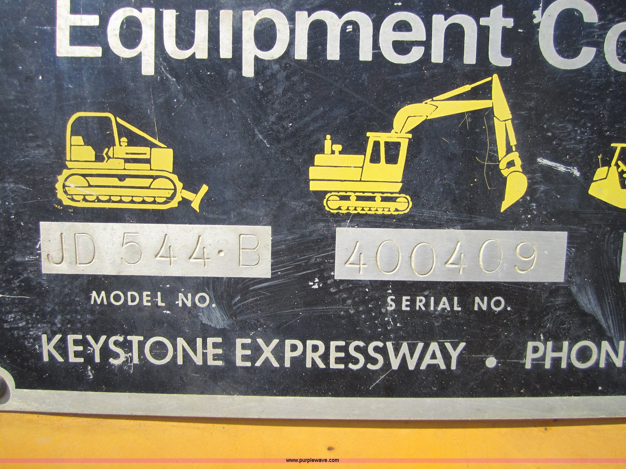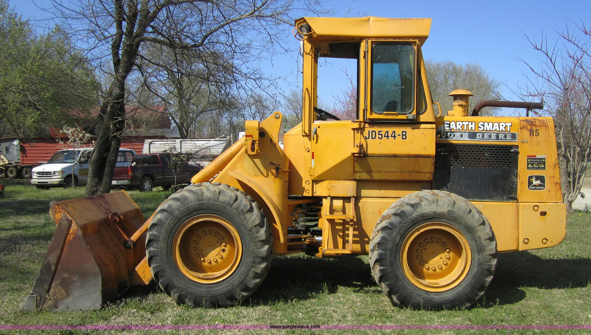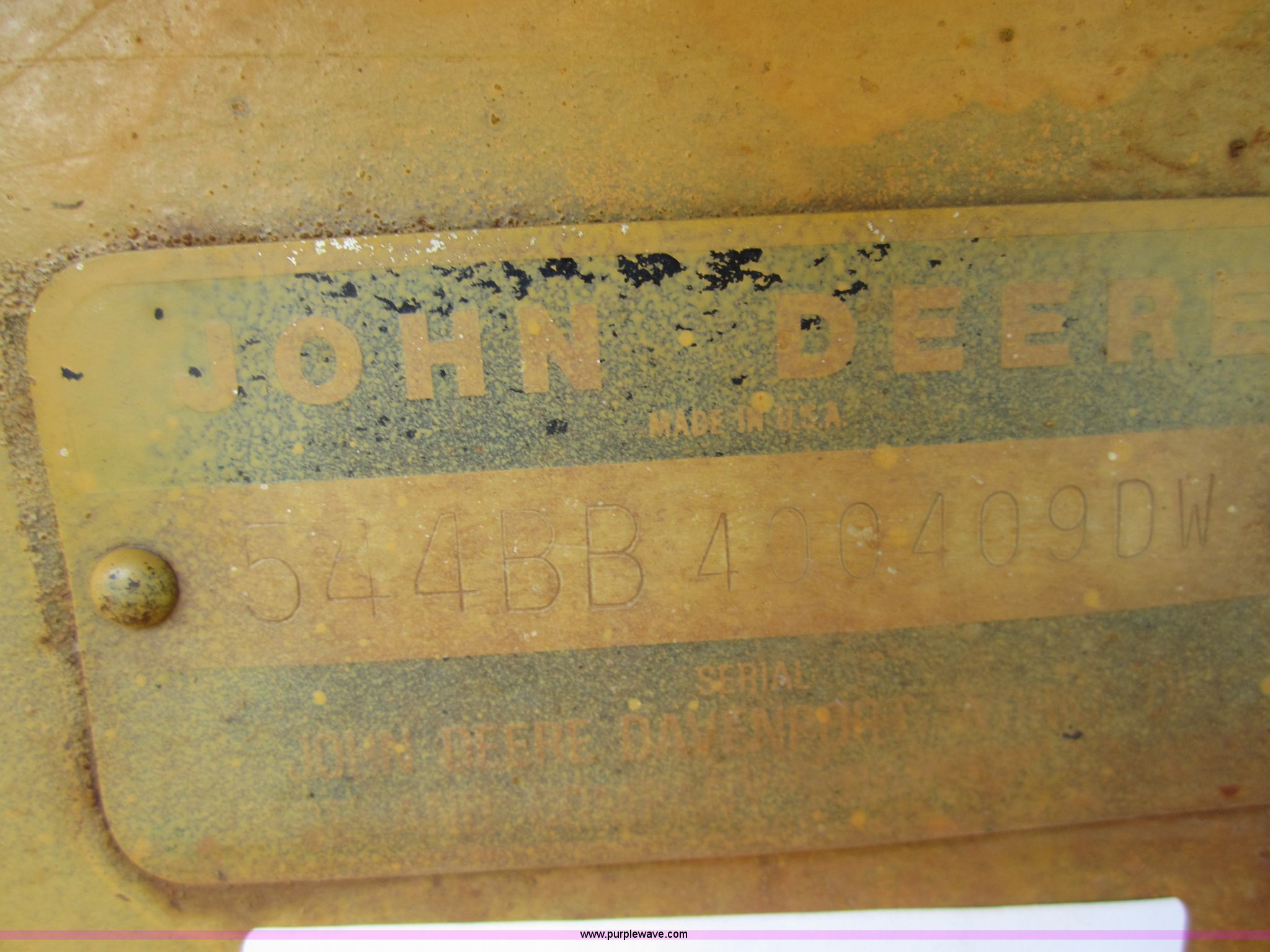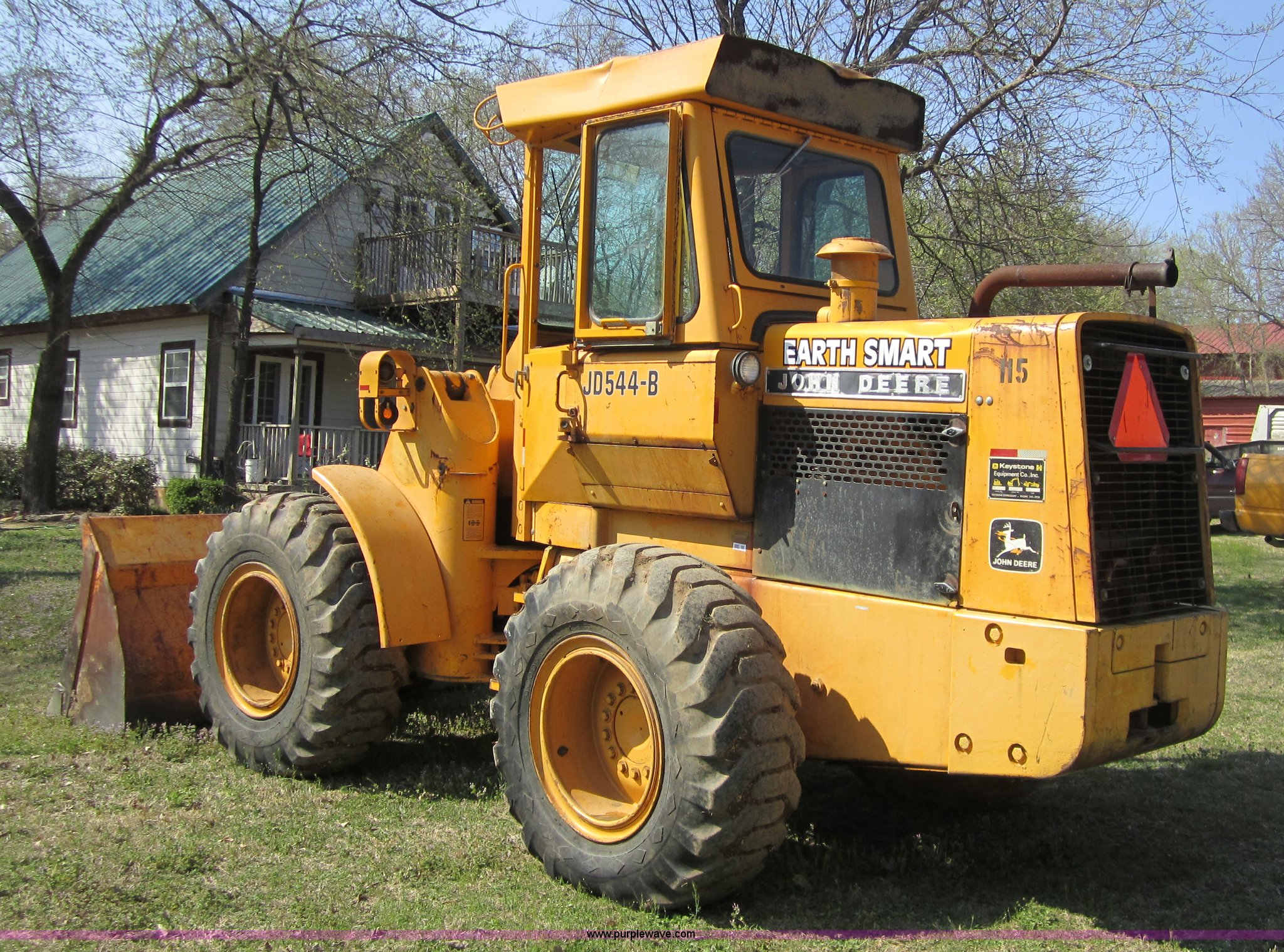 Purple Wave is selling a used Wheel Loader in Oklahoma. This item is a 1983 John Deere 544B wheel loader with the following: 3,888 hours on meter, John Deere 639T six cylinder turbo diesel, 105 HP, Transmission, Two forward gears, One reverse gear, High gear does not engage, Enclosed ROPS cab, Heater, Single stick loader controls, Two yard GP bucket, 17.5-25 tires, 18,361 lbs. base operating weight, Serial 544BB400409DW