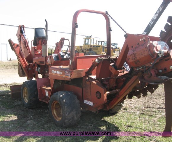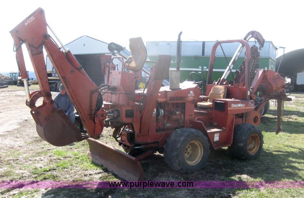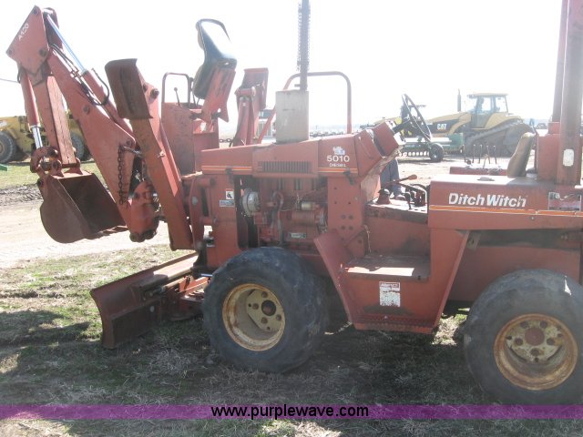 Purple Wave is selling a used Trencher or Rock Saw in Kansas. This item is a 1987 Ditch Witch 5010-DD trencher/backhoe with the following: 2,175 hours on meter, Deutz three cylinder diesel engine, 50 HP, Four speed transmission, Four wheel drive, 72" six-way blade, A420 backhoe attachment, 18" bucket with four teeth, A450 plow and trencher attachment, 5' max trenching depth, 2'6" plow depth, Serial 6D0477