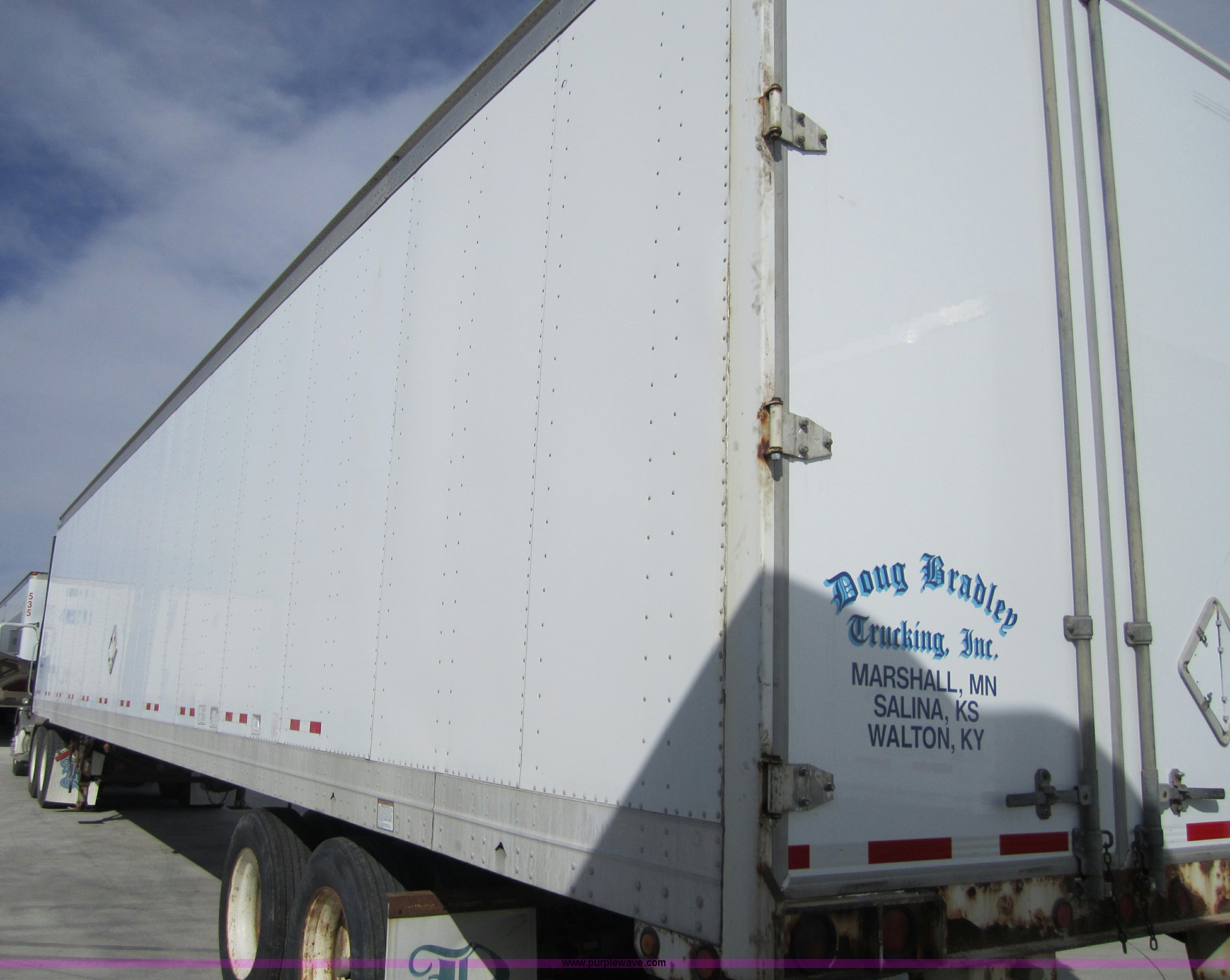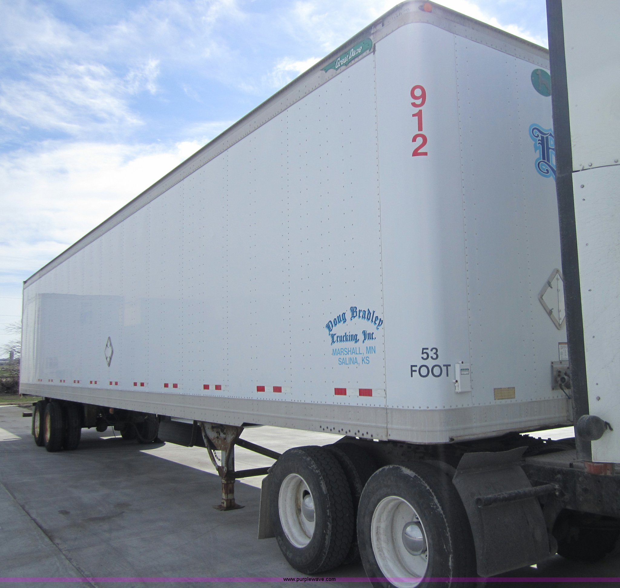 Purple Wave is selling a used Dry Van Trailer in Kansas. This item is a 1999 Great Dane 53' dry van trailer with the following: Tandem sliding axle, Air brakes, Air ride suspension, Wood floor, Translucent roof, 65,000 lbs GVWR, 102"W, 275/80R24.5 tires, Unit number 912