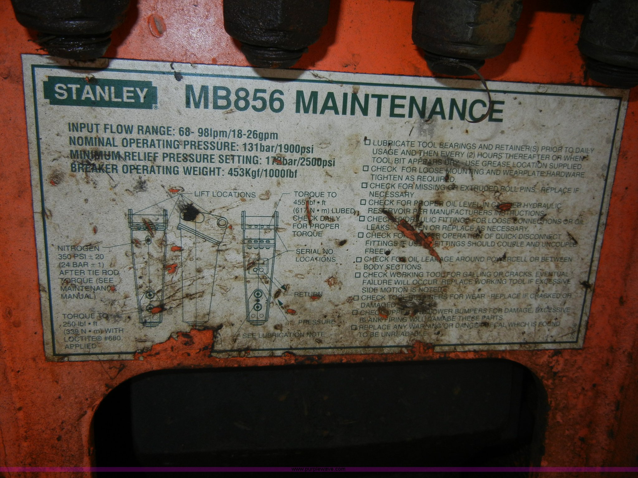 Stanley MB856 hydraulic hammer has sold in Tonganoxie, Kansas for $4070. Item 2183 sold on April 21st, 2011.