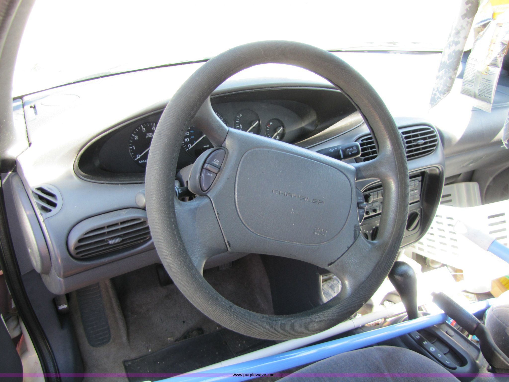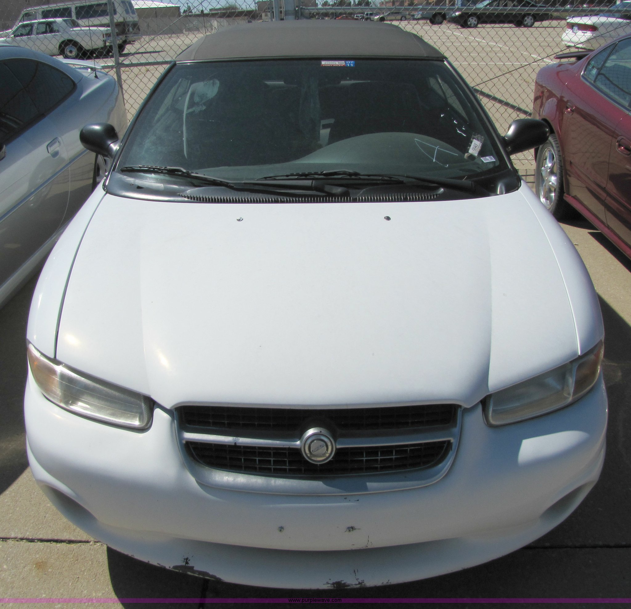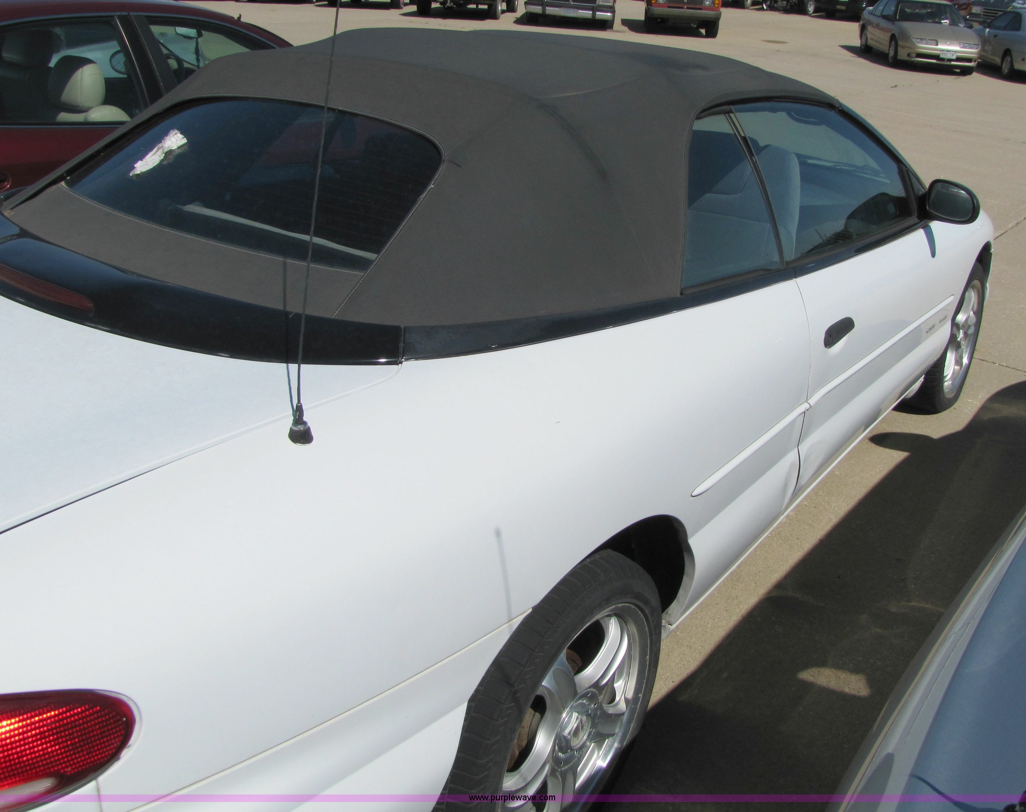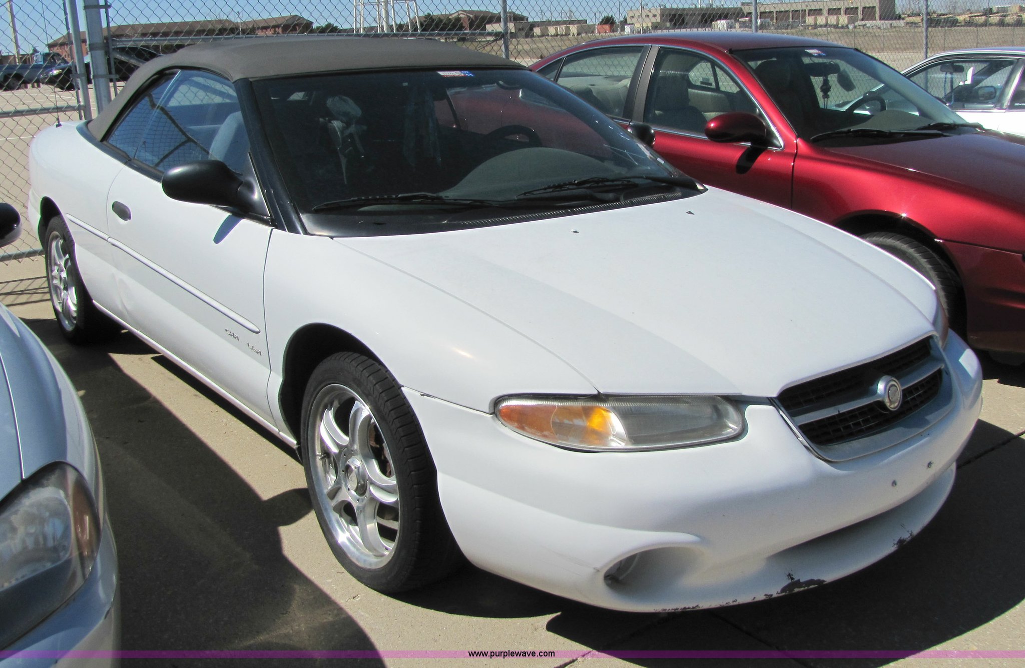 Purple Wave is selling a used Passenger Vehicle in Kansas. This item is a 1996 Chrysler Sebring JX convertible with the following: Unknown mileage, 2.5L V6 SFI engine, Automatic transmission, AC and heat, Tilt, Cruise, AM/FM, Power windows, locks, mirrors, and seats, Rear defrost, Cloth interior, 205/50R17 tires, Flat tires, Exterior and interior cosmetic damage, No keys, AV# 0043