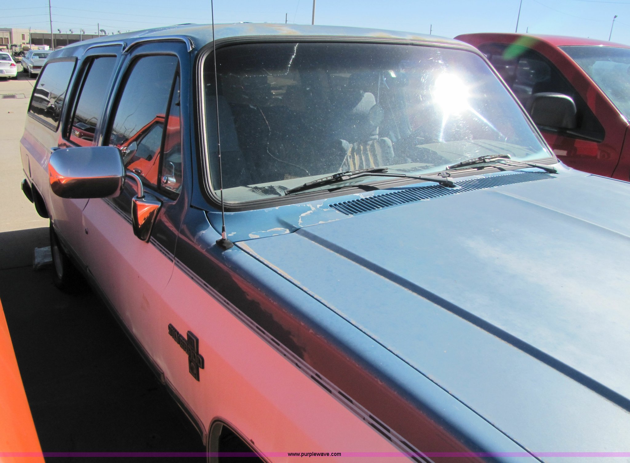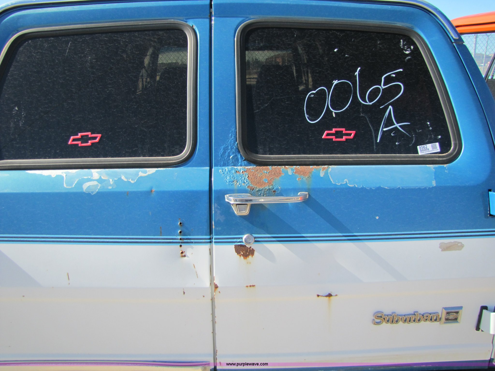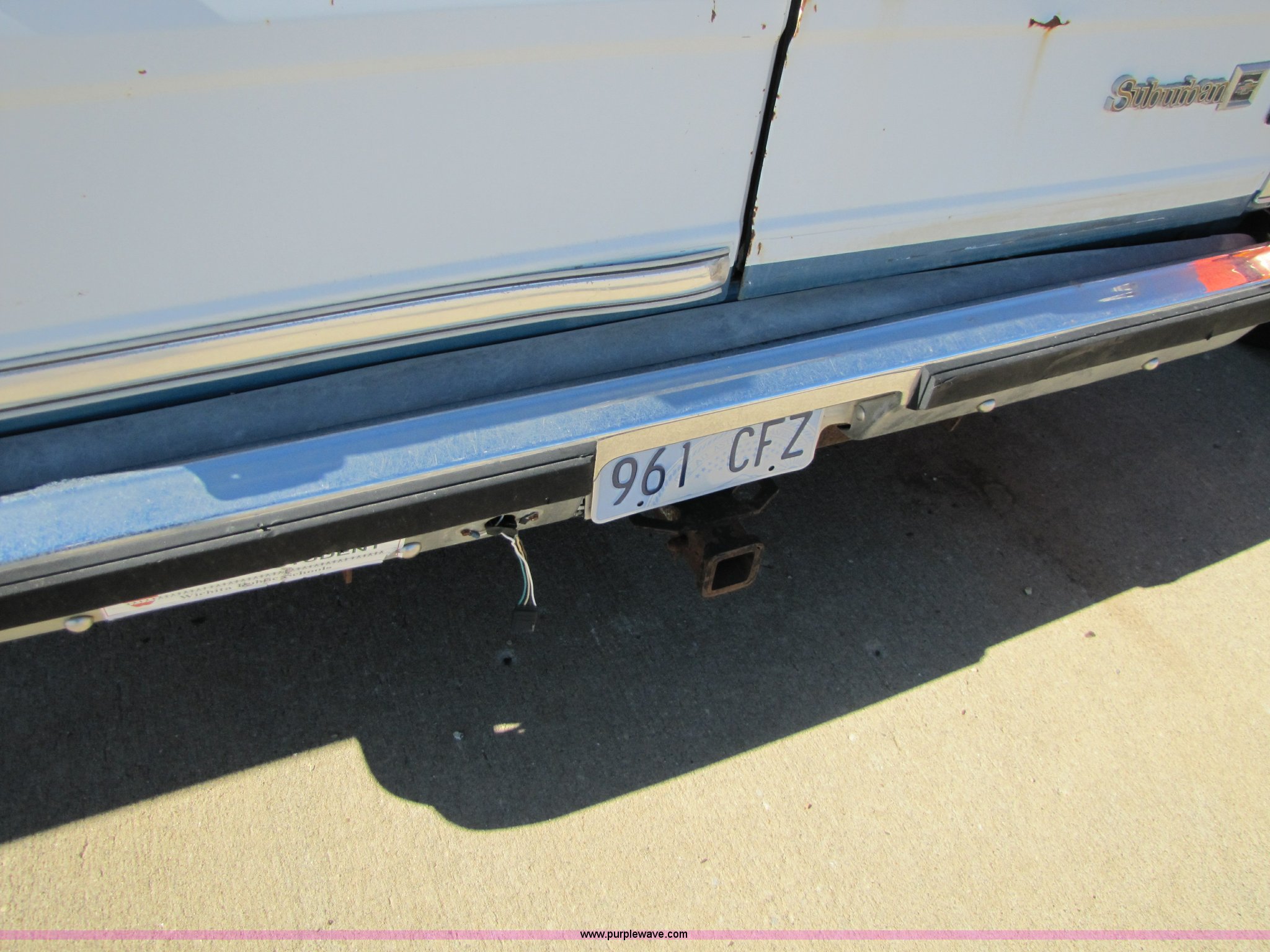 Purple Wave is selling a used Passenger Vehicle in Kansas. This item is a 1988 Chevrolet Suburban SUV with the following: 43,749 miles on odometer, 5.7L V8 TBI engine, Automatic transmission, Four wheel drive, AC and heat, Tilt, Power window passenger side, Power locks, Cloth seats, damaged, Receiver hitch, Trailer wiring, 235/75R15 tires, Flat tires, No keys, Exterior and interior cosmetic damage, Stereo missing, Cracked windshield, Cracked driver rear window, AV# 0065
