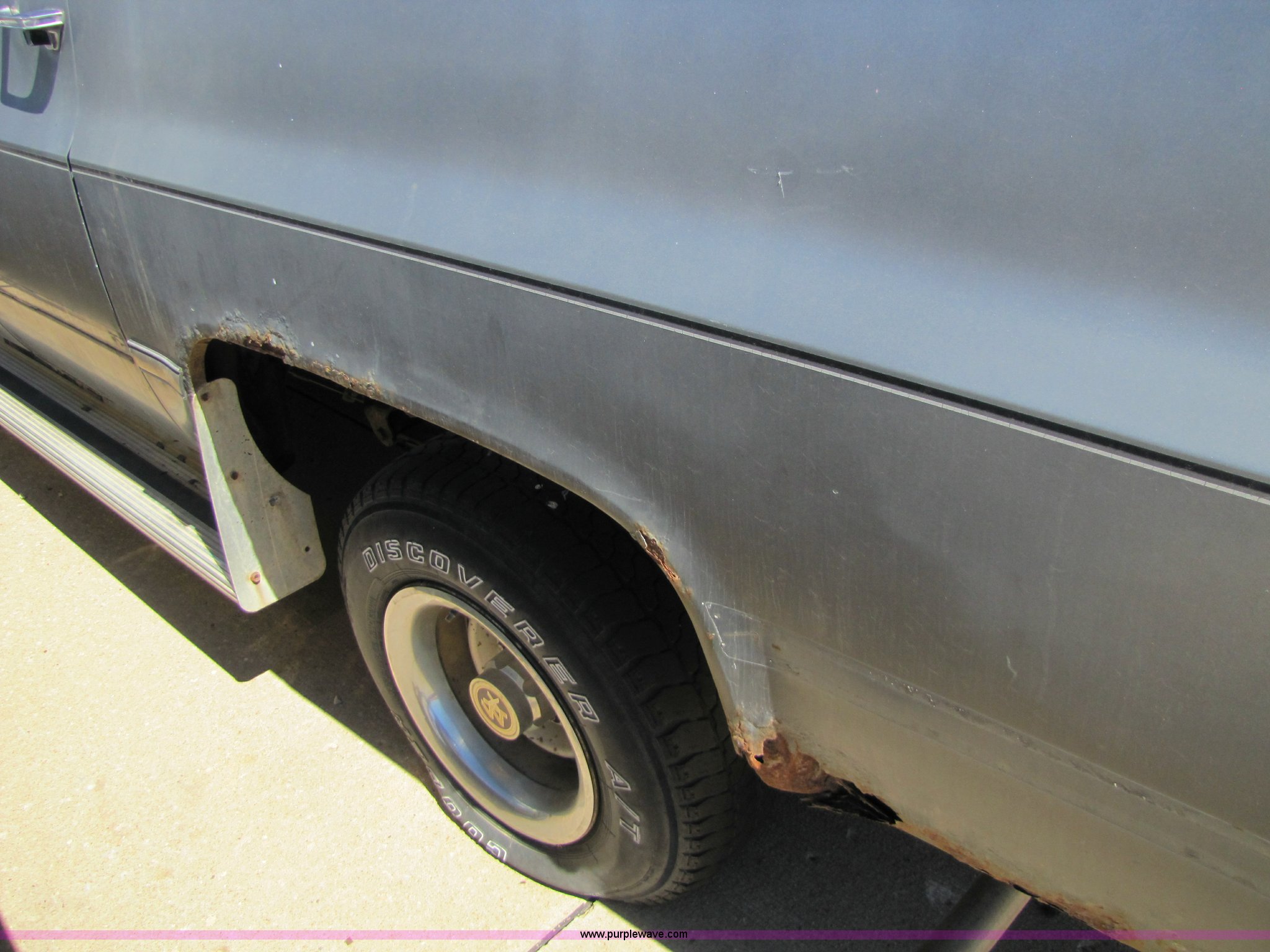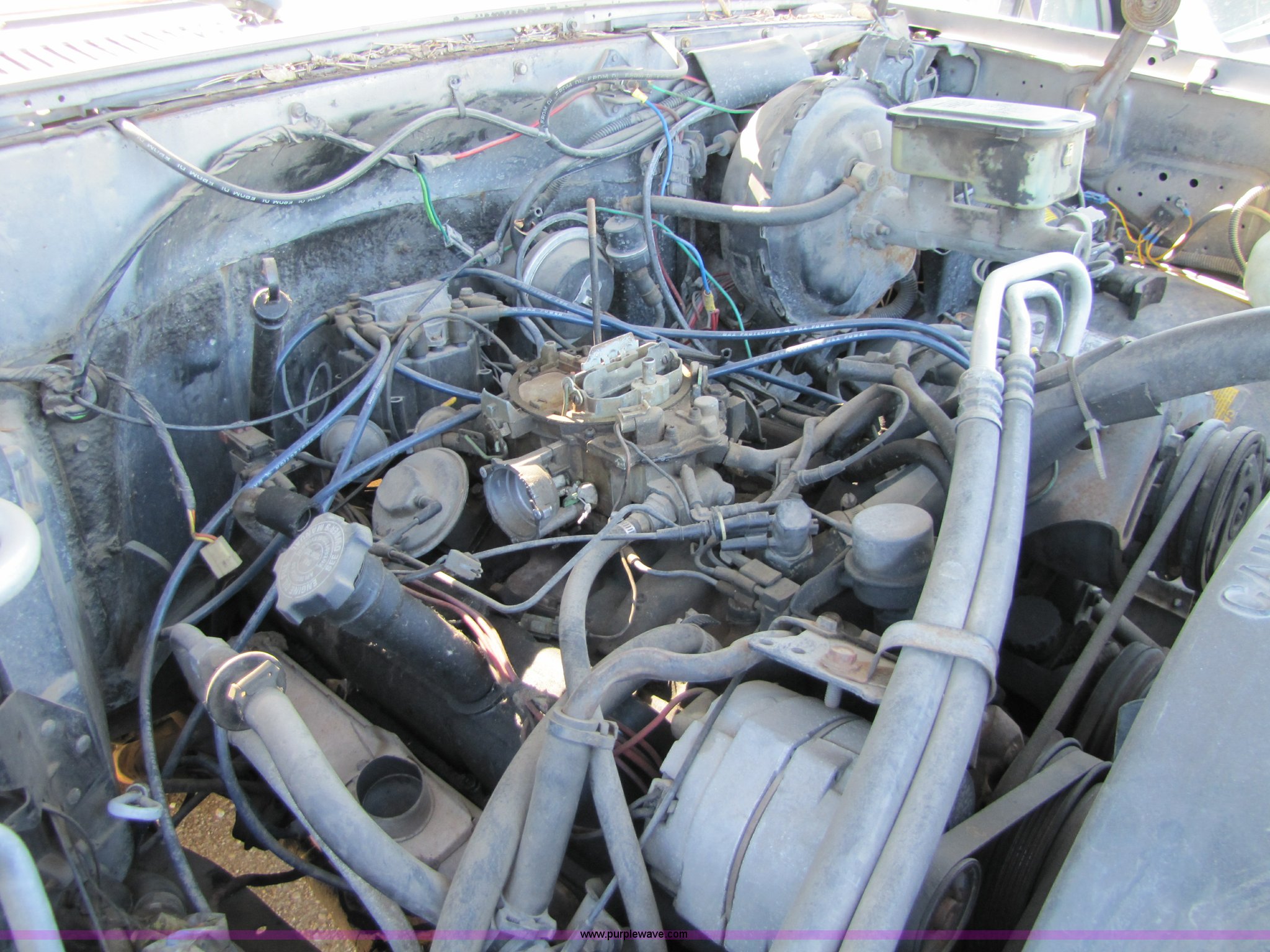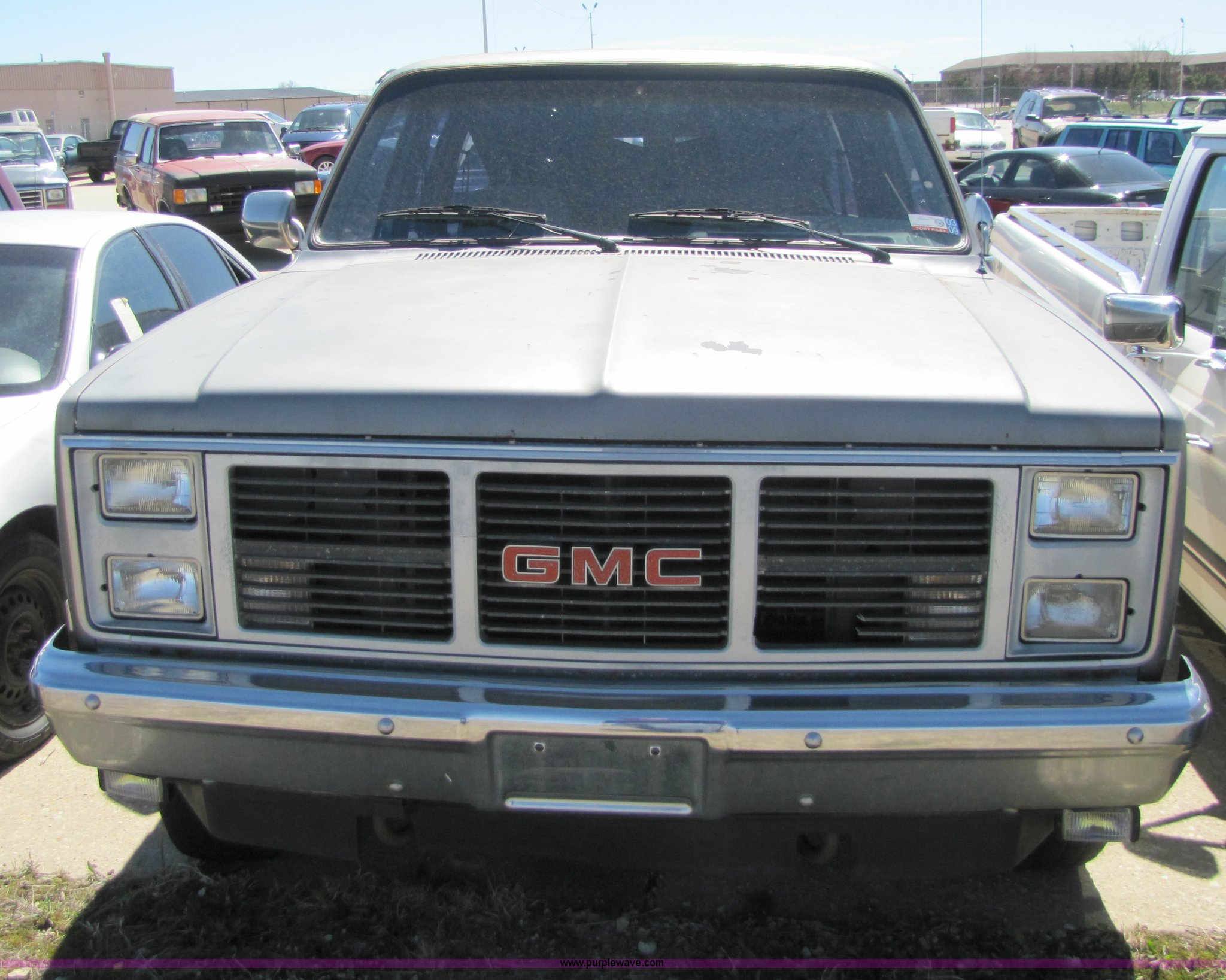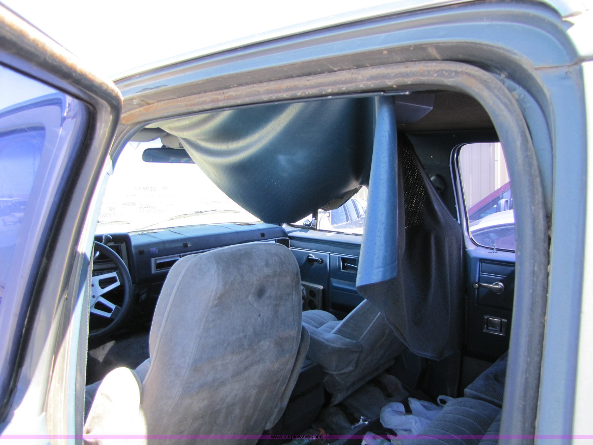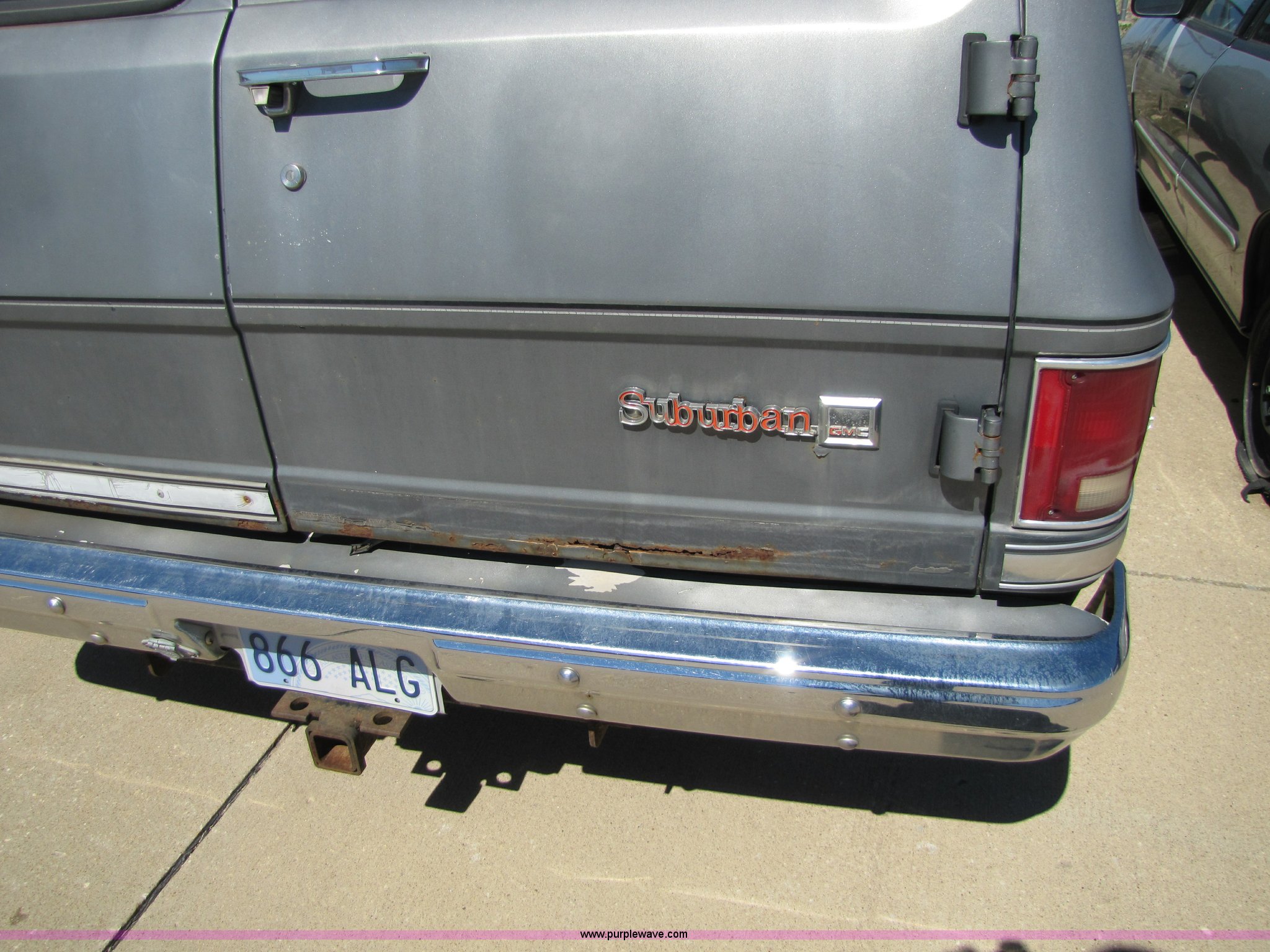 Purple Wave is selling a used Passenger Vehicle in Kansas. This item is a 1986 GMC Suburban K1500 SUV with the following: 91,607 miles on odometer, 5.7L V8 4BBL engine, Partially disassembled, unknown condition, Automatic transmission, Four wheel drive, Heater, Tilt wheel, Manual windows and locks, Receiver hitch, LT235/75R15 tires, No keys, Rust, Cracked windshield, Interior and exterior cosmetic damage, AV# 0002