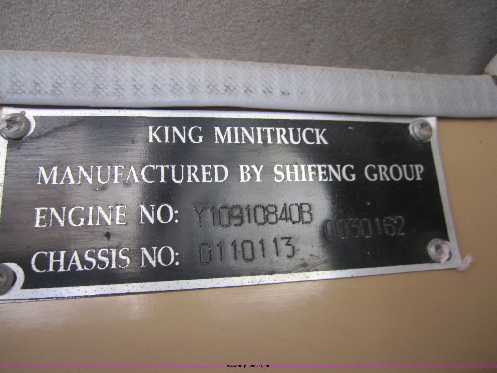 Purple Wave is selling a used Compact Pickup or Van in Oklahoma. This item is a 2001 King mini truck with the following: 1,001 miles on odometer, Four cylinder diesel engine, Three speed manual transmission, Heater, 9' hydraulic dump bed, Folding bed sides, P205-70R14 tires, Chassis# 0110113