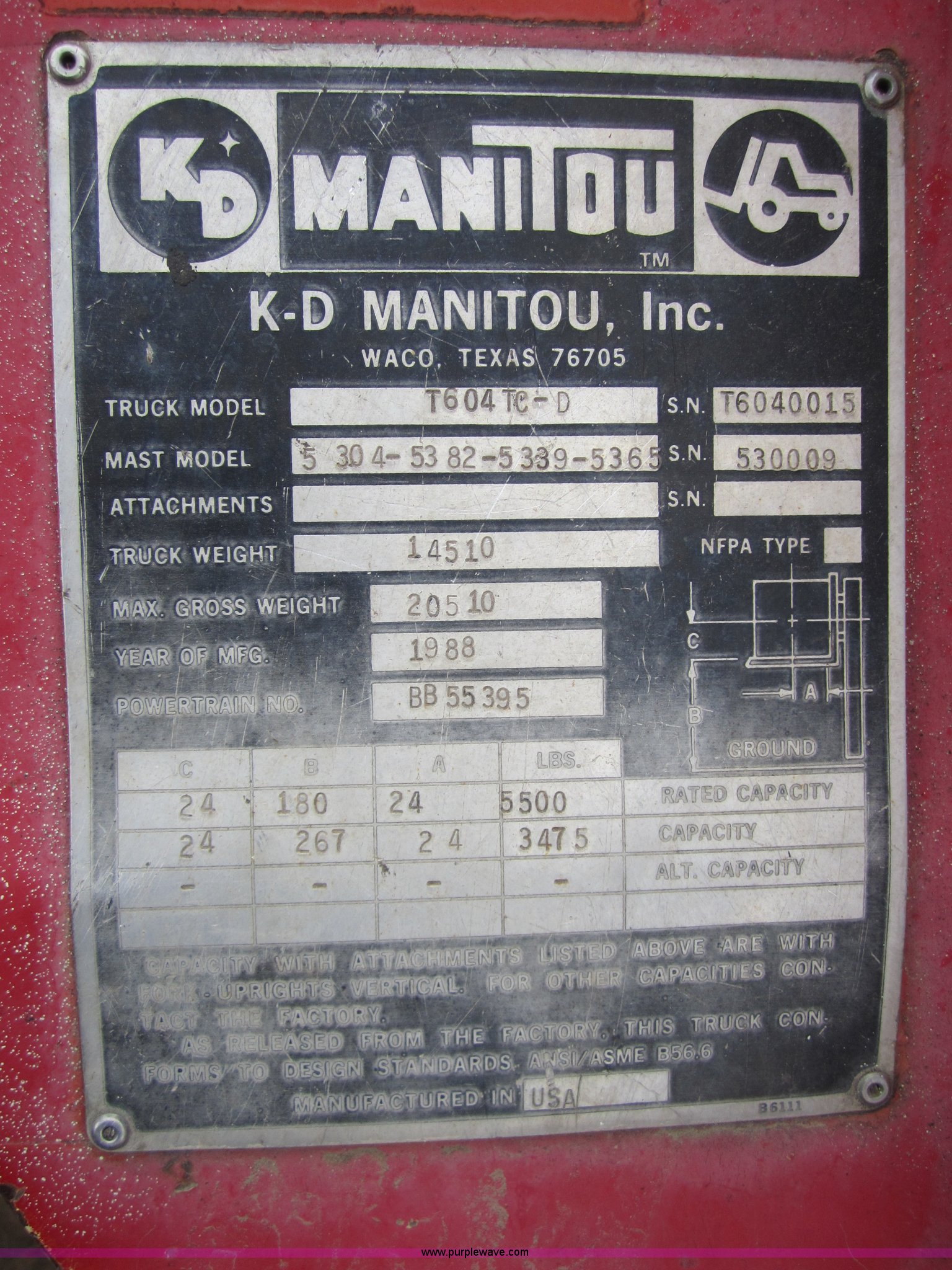 Purple Wave is selling a used Strt. Mast Rough Terr. Forklift in Kansas. This item is a 1988 Manitou rough terrain forklift with the following: 7,742 hours on meter, Three cylinder diesel engine, 22'3" lift height, 5,500 lb lift capacity, 14,510 lbs. base operating weight, 20,510 lb max gross weight, Three stage mast, 46" forks, Side shift, Forward tilt, Does not move