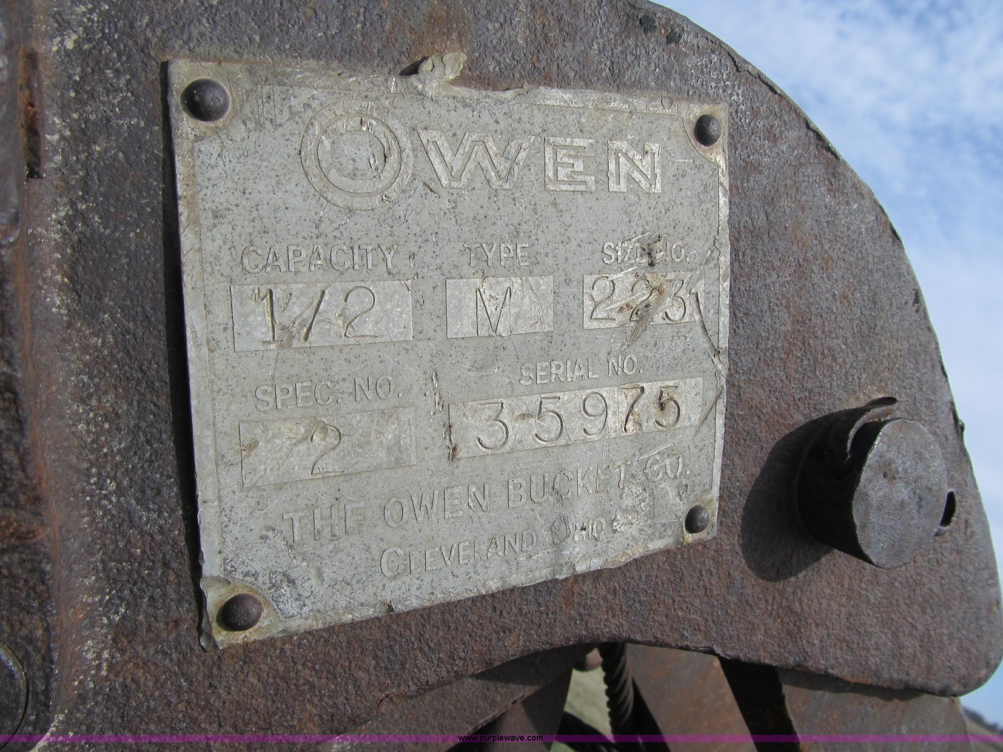 Purple Wave is selling a used Crane Attach. in Iowa. This item is a Owen clamshell bucket with the following: 1/2 ton capacity, Serial 3-5975