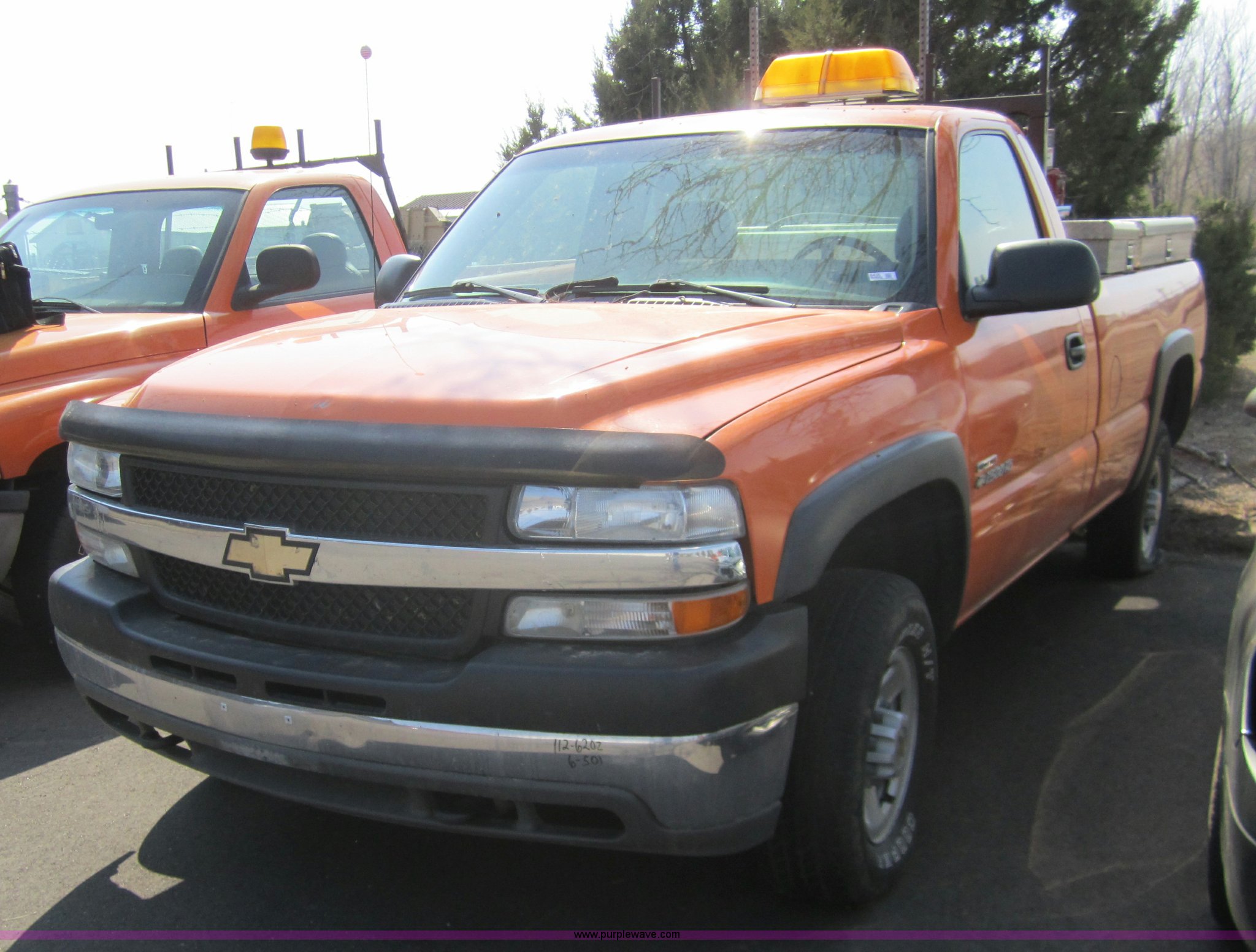 Purple Wave is selling a used Passenger Vehicle in Kansas. This item is a 2002 Chevrolet Silverado C2500HD pickup truck with the following: 182,272 miles on odometer, 6.6L V8 DI diesel engine, Automatic transmission, AC and heat, Tilt, Cruise, AM/FM, Manual windows and locks, Pickup bed, Receiver hitch, Cross bed toolbox, (2) side toolboxes, Fuel tank with Fill-Rite transfer pump, P245/75R16 tires, One tire leaks, Paint faded and scratched, Low oil pressure, Injector pump leaking in crankcase, KDOT ID 112-6202