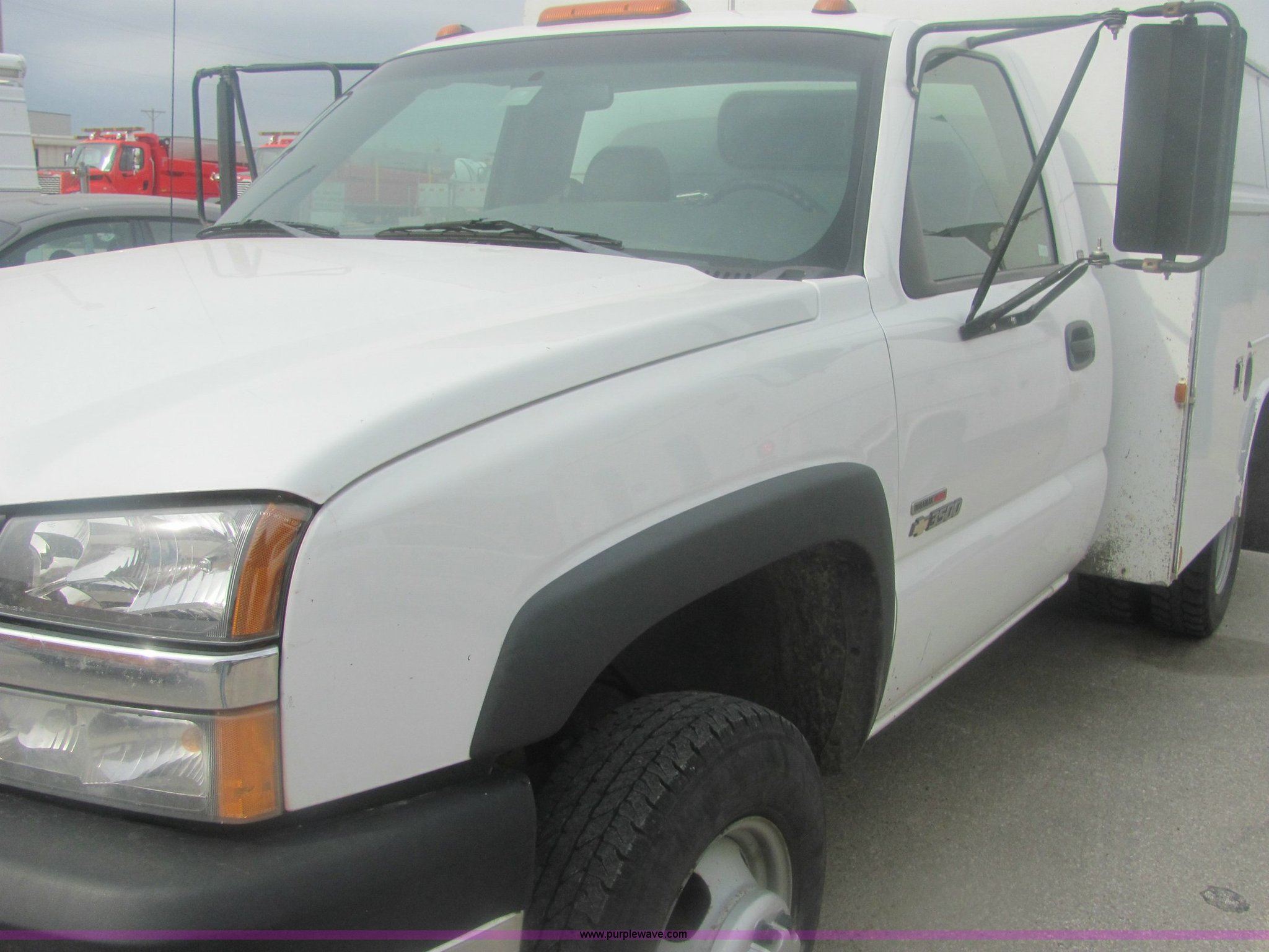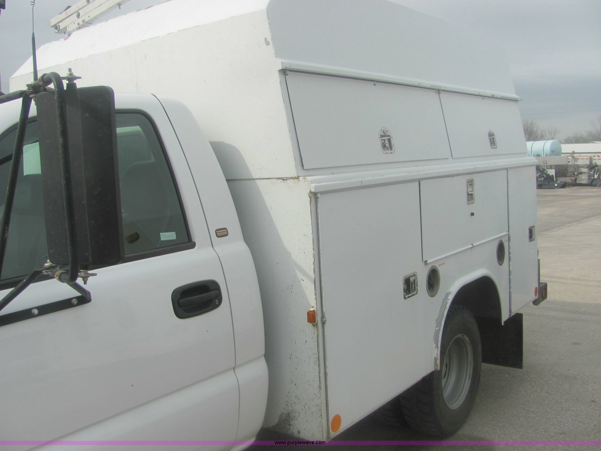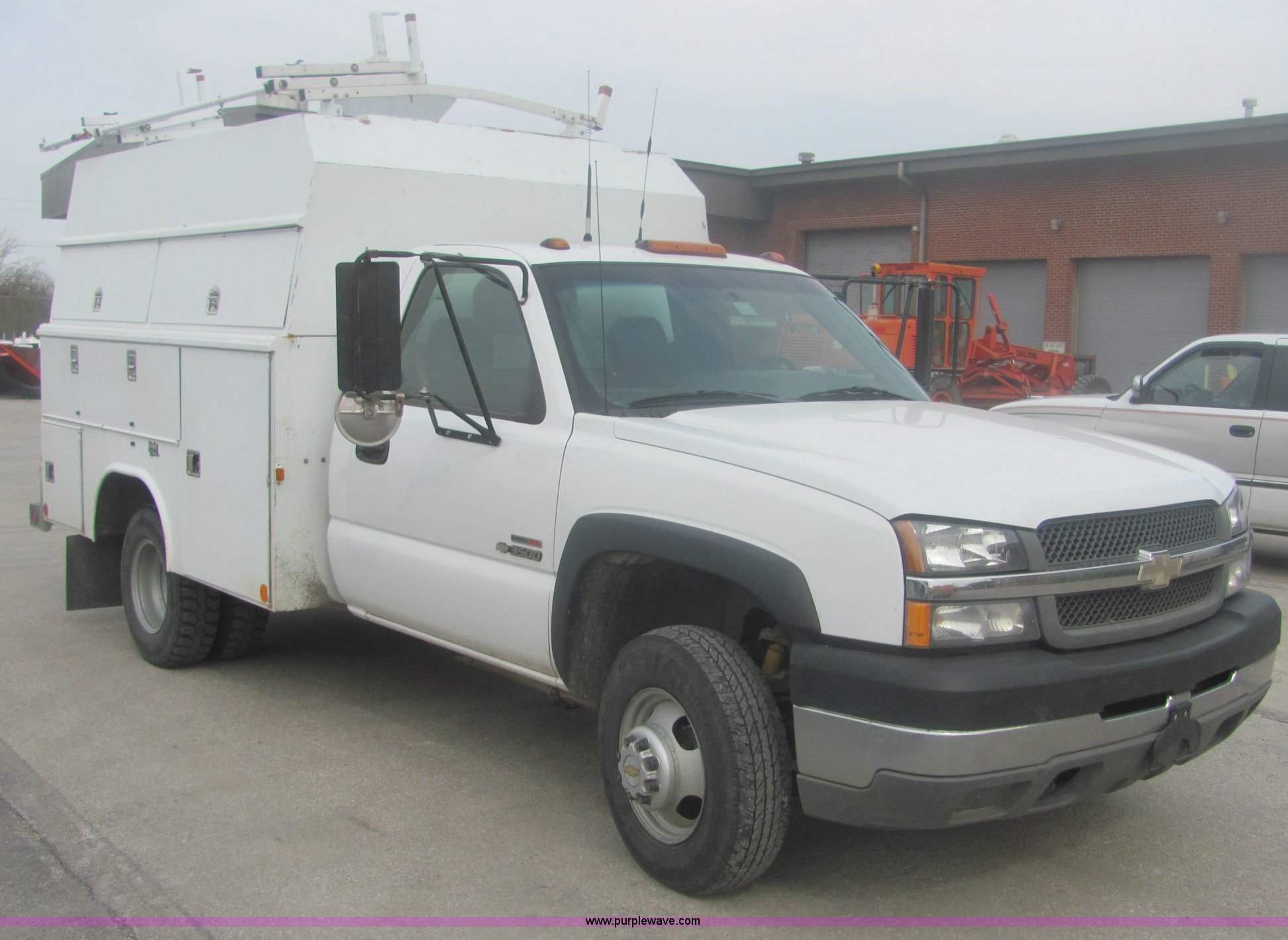 Purple Wave is selling a used Service Truck in Kansas. This item is a 2003 Chevrolet C3500 Silverado pickup truck with the following: 195,722 miles on odometer, Duramax 6.6L V8 diesel engine, Automatic transmission, Reading utility bed, Dually, Paint faded and scratched, Hood dented, KDOT ID 152-0013