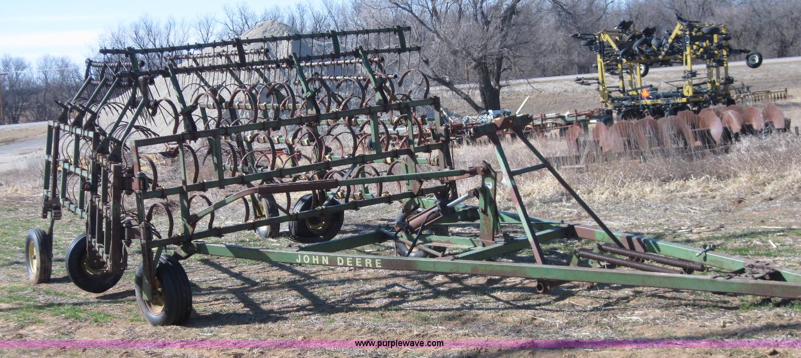Purple Wave is selling a used Tillage Other in Kansas. This item is a John Deere 55' folding spring tooth with the following: Two bar coil tine harrow, Gauge wheels flat, Missing one fold cable