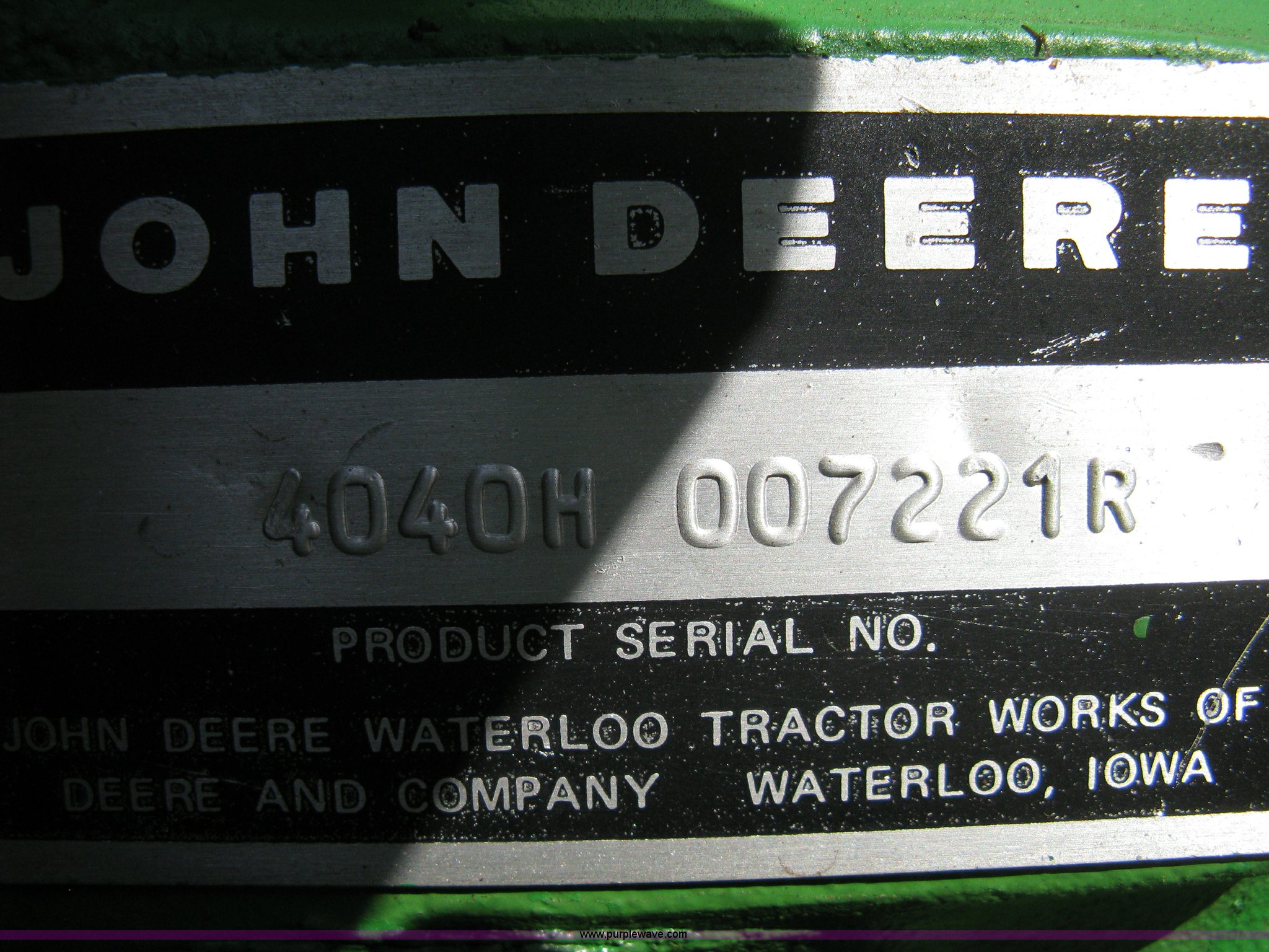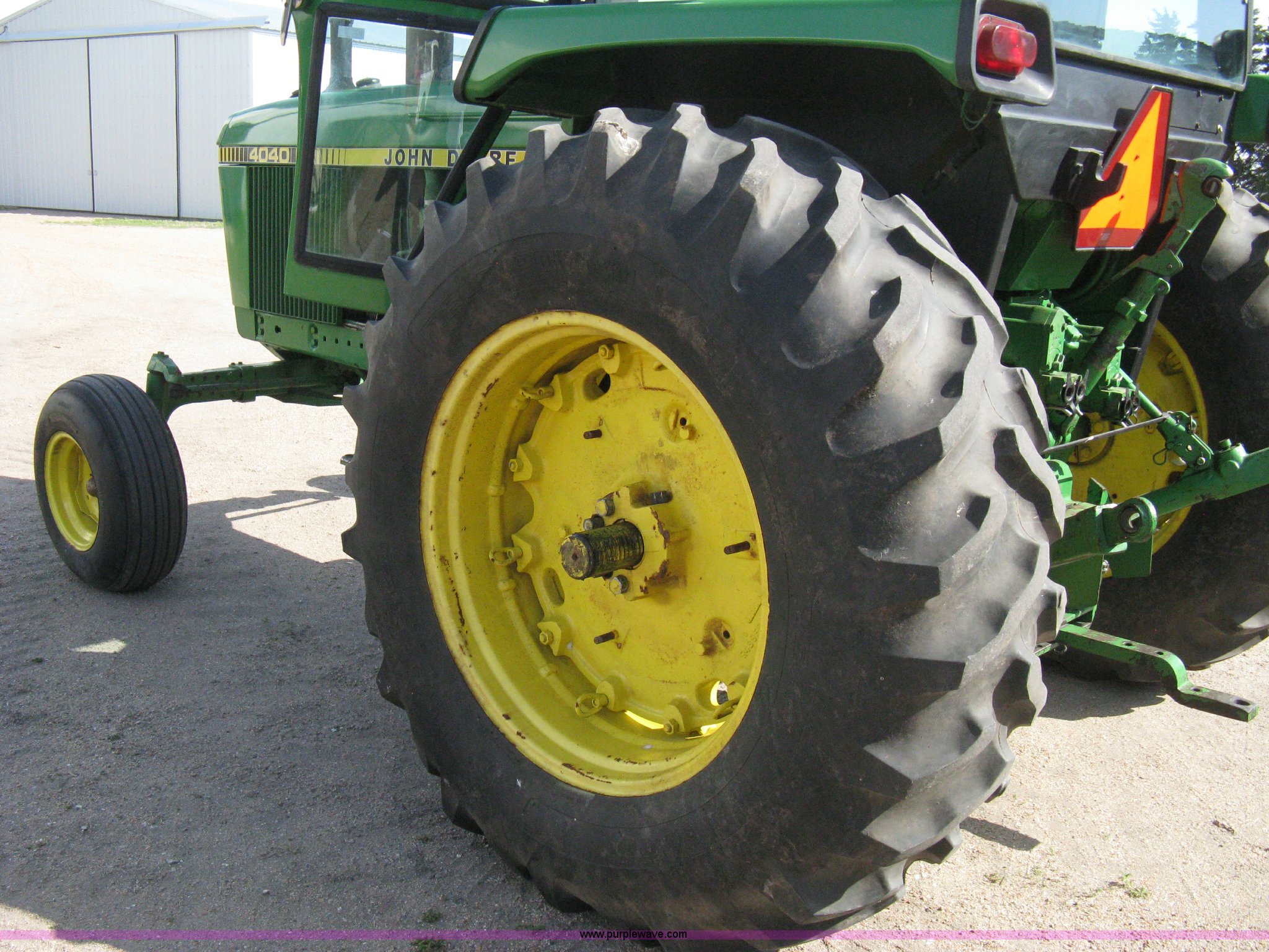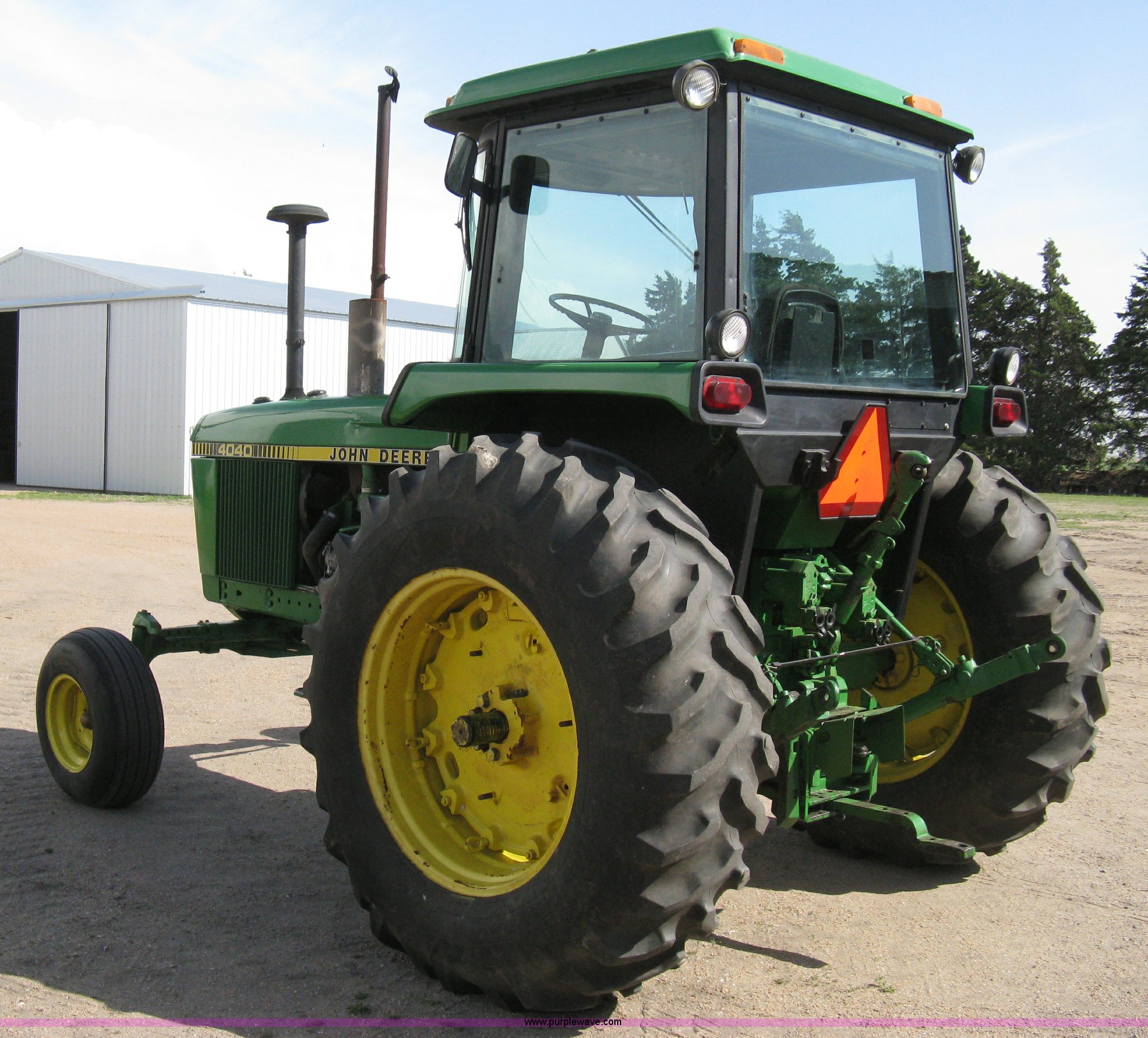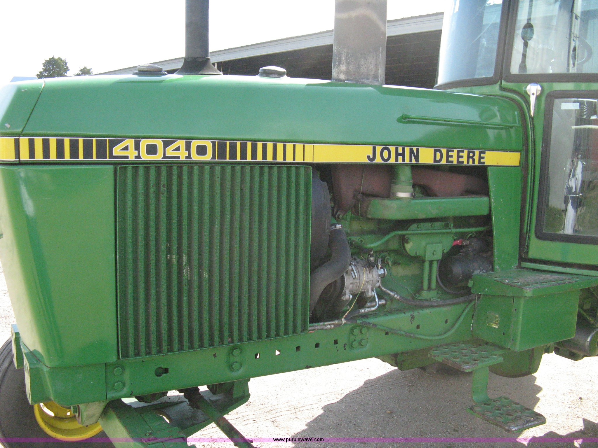 Purple Wave is selling a used Tractor in Kansas. This item is a John Deere 4040 tractor with the following: 2,267 hours on meter, John Deere six cylinder diesel engine, Serial 6404DR-25 581241RG, PowerShift transmission, Quad range transmission, 16 forward gears, Two reverse gears, AC and heat, Hydraulic seat, Tilt, AM/FM/Cassette, Windshield wipers, Tip-out windows, ROPS, Model SG, Serial 4-260560RW, Three point, Draw bar, 540/1000 PTO, (2) rear hydraulic remote sets, Recently replaced batteries, 11L-15SL front tires, 18.4-34 rear tires, Serial 4040H-007221R
