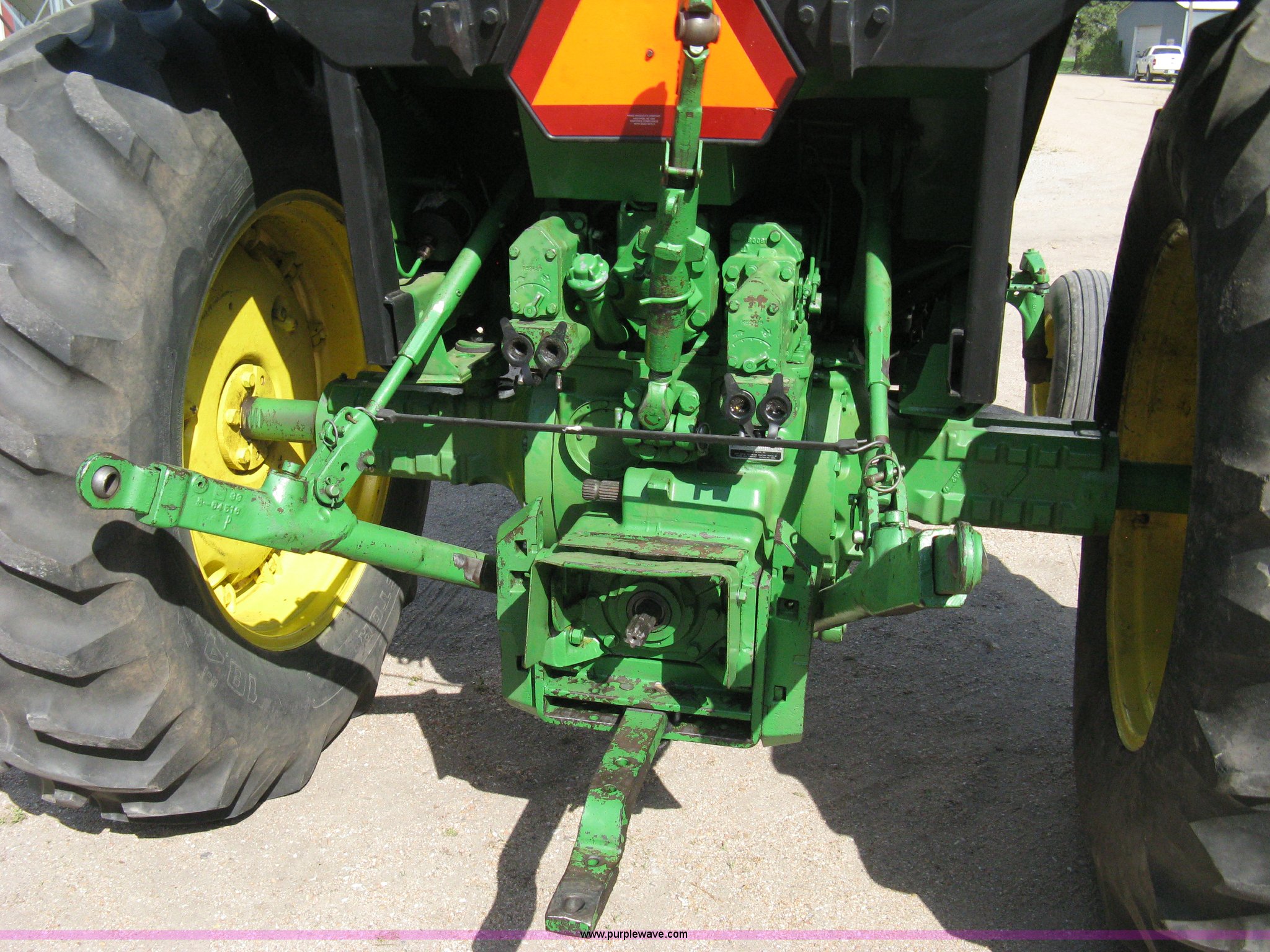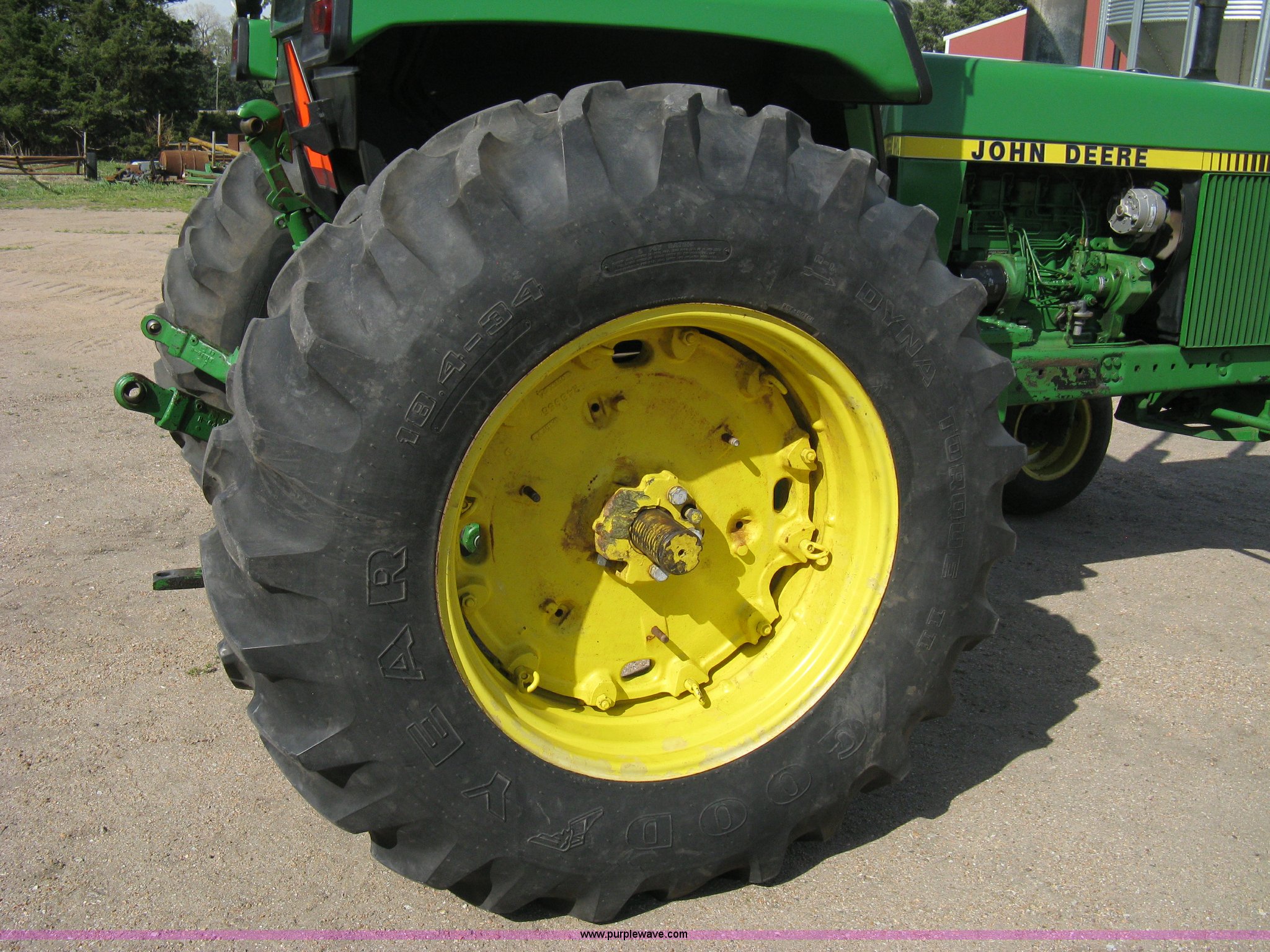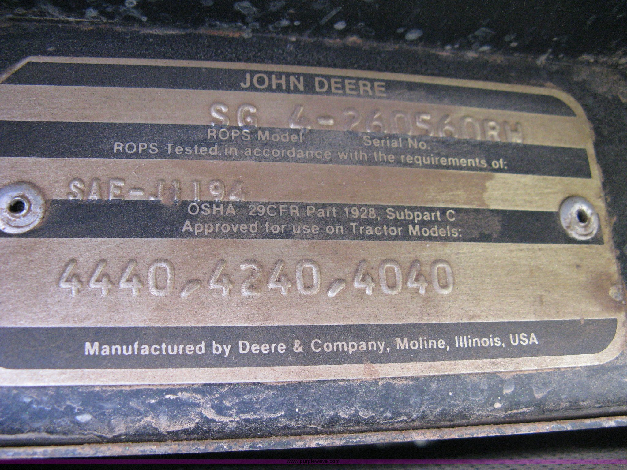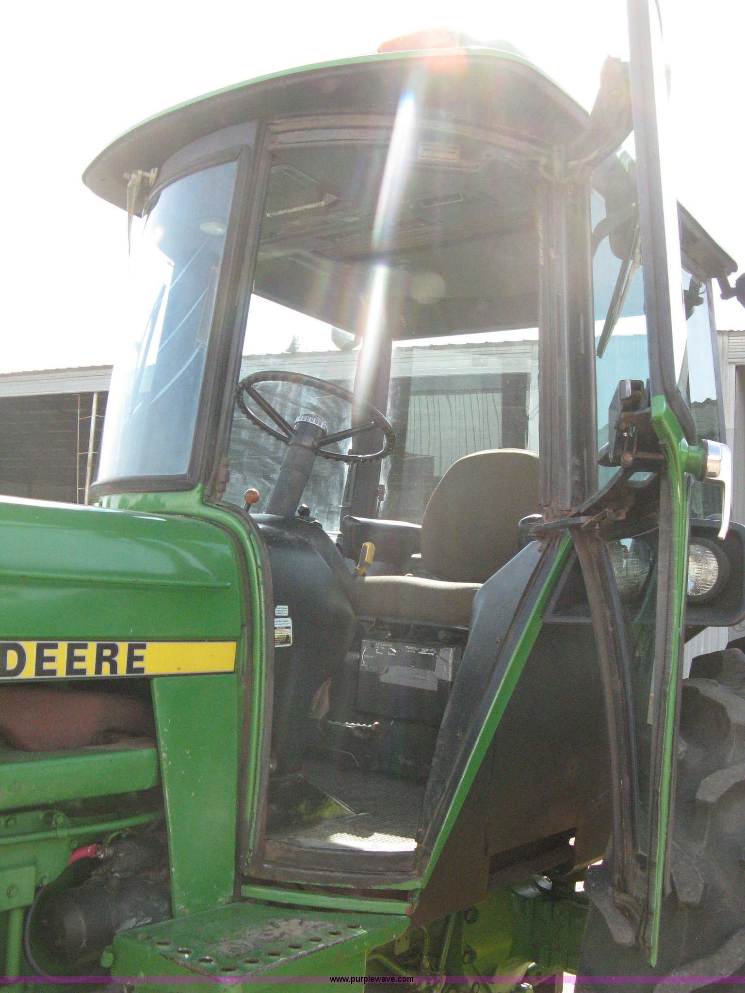 Purple Wave is selling a used Tractor in Kansas. This item is a John Deere 4040 tractor with the following: 2,267 hours on meter, John Deere six cylinder diesel engine, Serial 6404DR-25 581241RG, PowerShift transmission, Quad range transmission, 16 forward gears, Two reverse gears, AC and heat, Hydraulic seat, Tilt, AM/FM/Cassette, Windshield wipers, Tip-out windows, ROPS, Model SG, Serial 4-260560RW, Three point, Draw bar, 540/1000 PTO, (2) rear hydraulic remote sets, Recently replaced batteries, 11L-15SL front tires, 18.4-34 rear tires, Serial 4040H-007221R