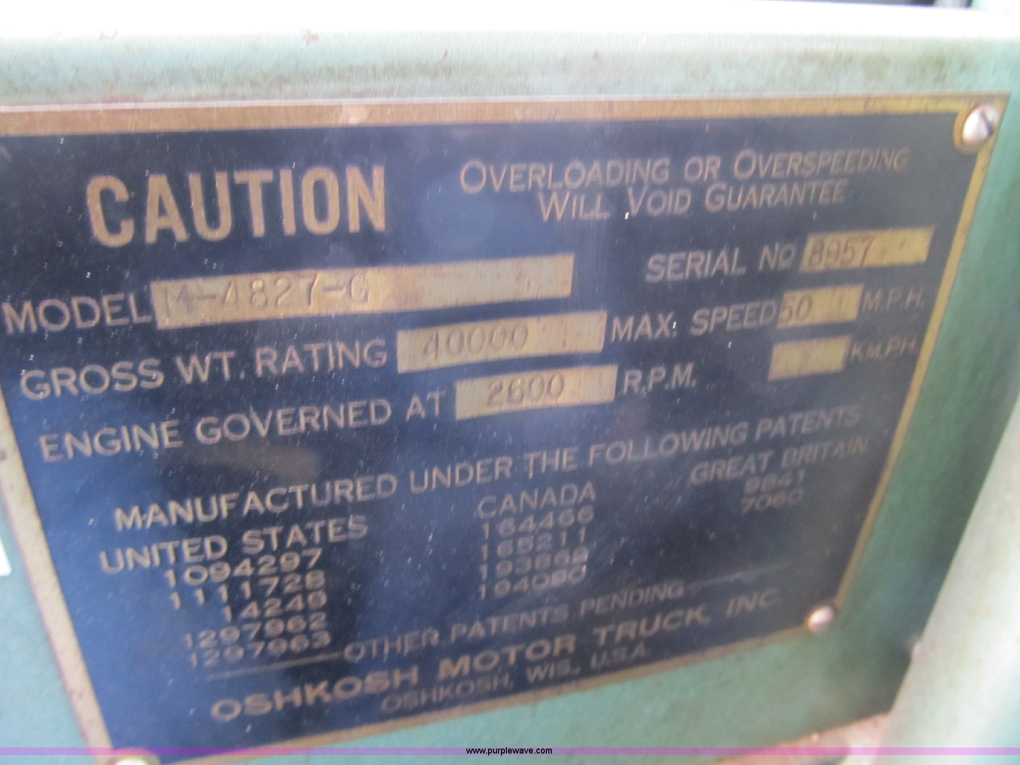 Purple Wave is selling a used Construction Dump Truck in Iowa. This item is a 1966 Oshkosh M 4827G snow plow/spreader truck with the following: 28,452 miles on odometer, 3,240 hours on meter, Continental gas engine, Oshkosh close step split shift manual transmission, Heater, AM/FM, Spring ride seat, Heated mirrors, Pintle hitch, Spreader bed, Salt spreader, Throttle control, Manual end gate, 50 gallon fuel tank, Spring suspension, PTO, Wing snow plow, Serial 8957