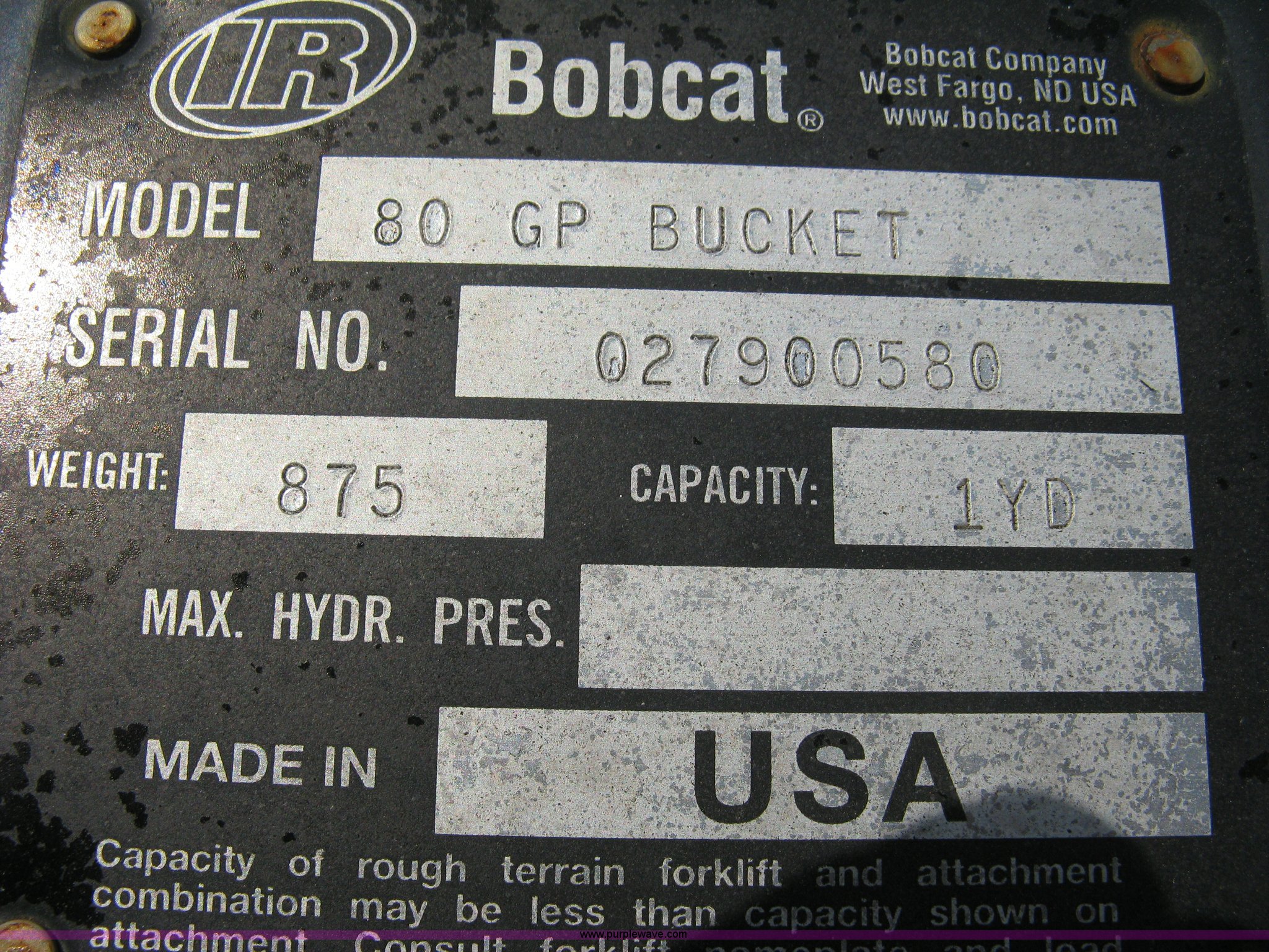 Purple Wave is selling a used Bucket or Loader Attach. in Texas. This item is a Bobcat V518 GP bucket with the following: 80"W, 1 cu. yd, New, Serial 0279900580, EIN 1027625