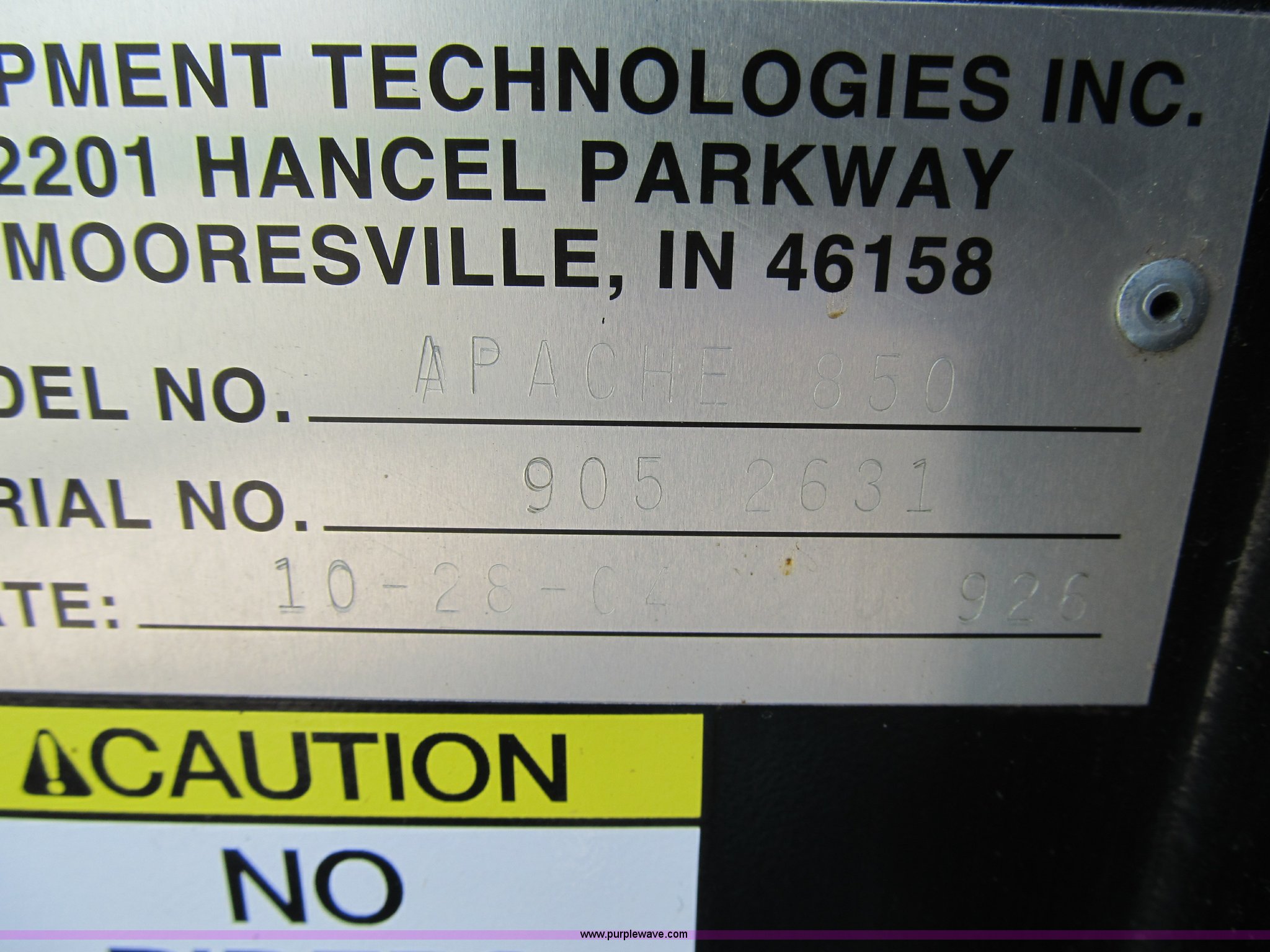 Purple Wave is selling a used Applicator Self Propelled in Indiana. This item is a 2005 Apache 850 self propelled sprayer with the following: 1,450 hours on meter, John Deere 150 HP diesel engine, Rebuilt engine, Manual transmission, 14.9x38 front tires, 380/90R46 rear tires, 850 gallon poly tank, 60' to 80' boom width, (5) boom sections, Triple nozzle bodies, 15" spacing, 50 gallon poly foam marker, Three gallon chemical eductor, 100 gallon poly rinse tank, Raven 460 monitor, Hydraulic transom, level, and fold, Hypro solution pump, 2" side fill, Manual tread adjust, Air ride seat, AC, Radio, Left boom is bent, Serial 9052631