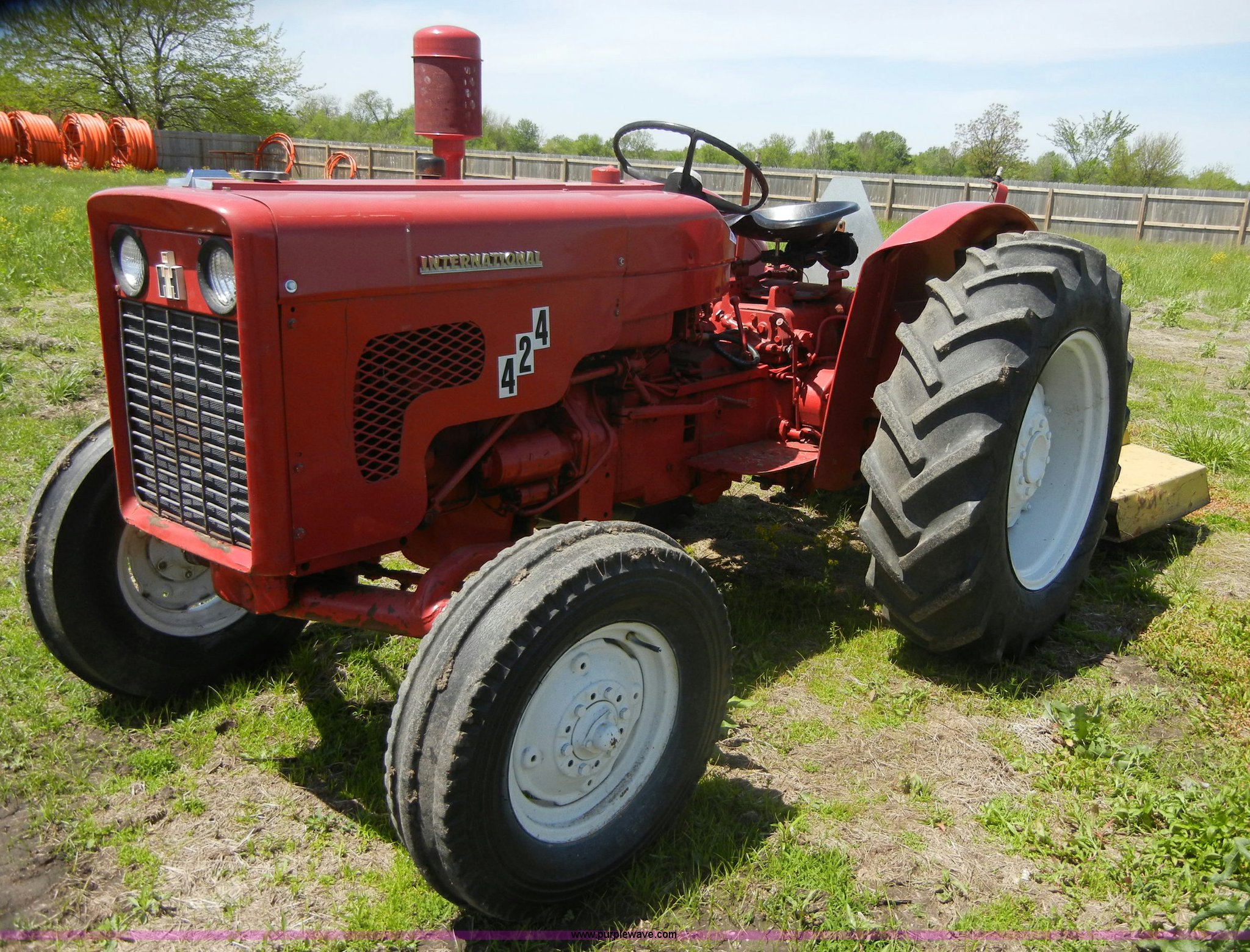 1964 International 424 tractor. 7,735 hours on meter, International diesel engine, Four forward and one reverse gears Hi/Low each gear, Three point, Draw bar, Auxiliary outlet, 540 PTO, 17 gallon fuel tank, New hydraulic pump in 2009, 7.50-16 front tires, 13.6-28 rear tires, four ply. Shipping quotes available. 4404 K33 Hwy. Wellsville, KS 66092