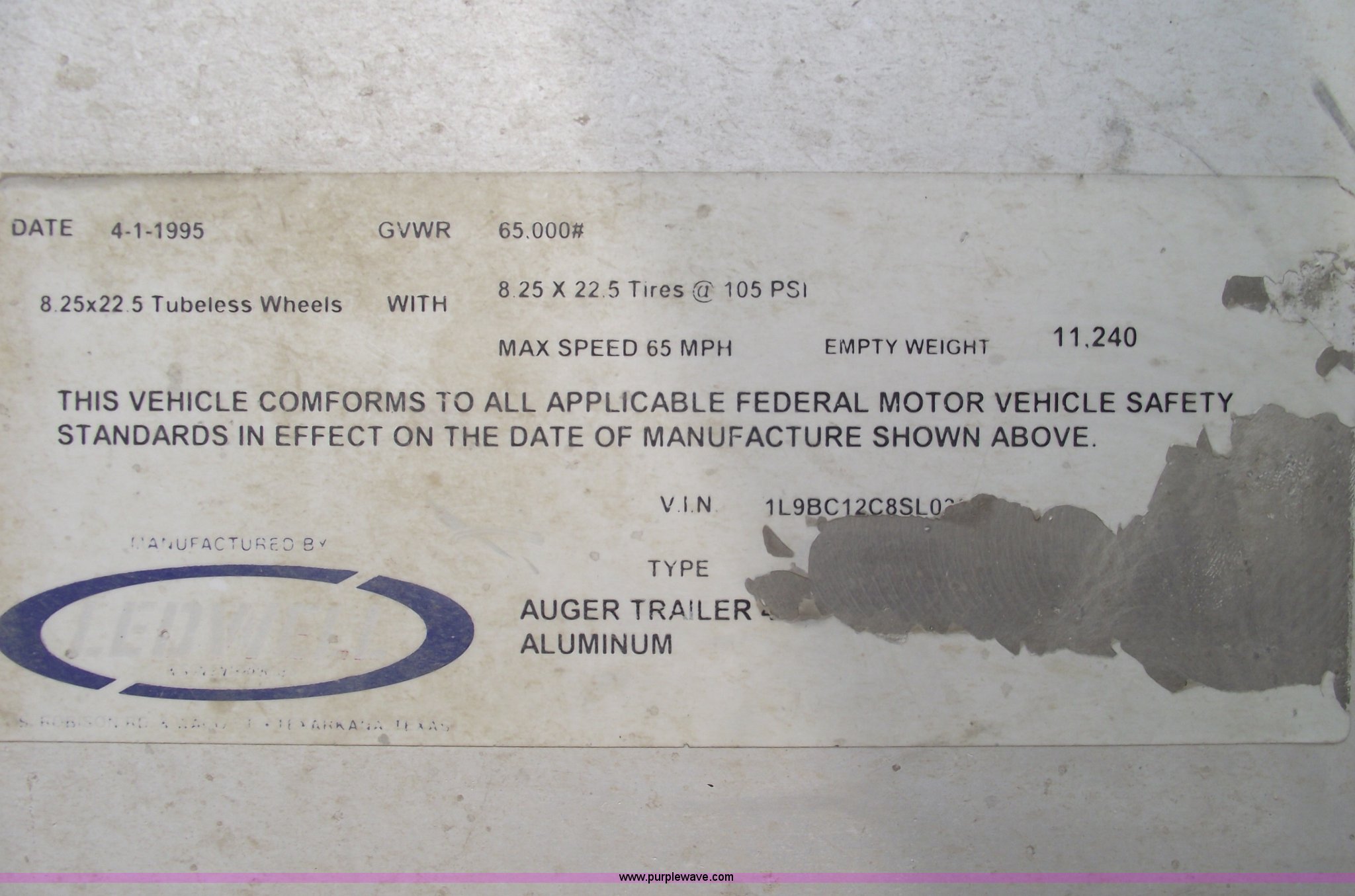 Purple Wave is selling a used Fertilizer or Feed Delivery Trailer in Missouri. This item is a 1995 Ledwell 40' bulk feed trailer with the following: Floor auger, (8) bins, 23' stinger, Damaged, Spring ride suspension, Aluminum air top doors, Aluminum catwalk, All aluminum body, Steel wheels, 11R22.5 tires, Unit 2223