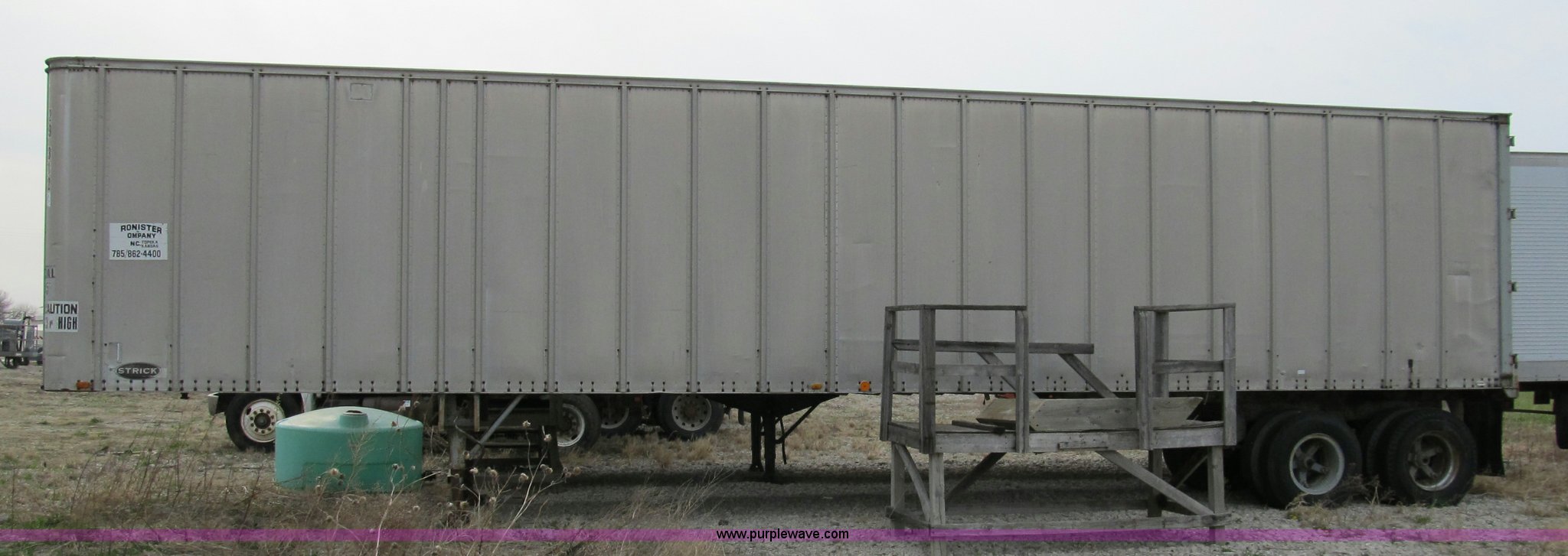 Purple Wave is selling a used Dry Van Trailer in Kansas. This item is a Strick 45' dry van trailer with the following: Sliding rear tandems, Wood floor, Swing out rear doors, 24' of shelves on right wall, 16" deep x 4'H, Dual front landing legs, 10.00-20 tires, Not moved in approx. five years