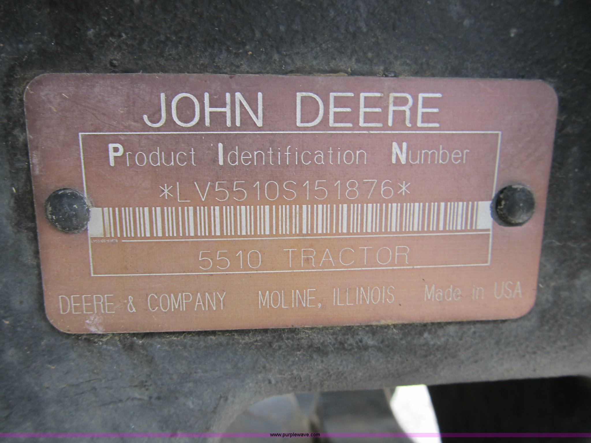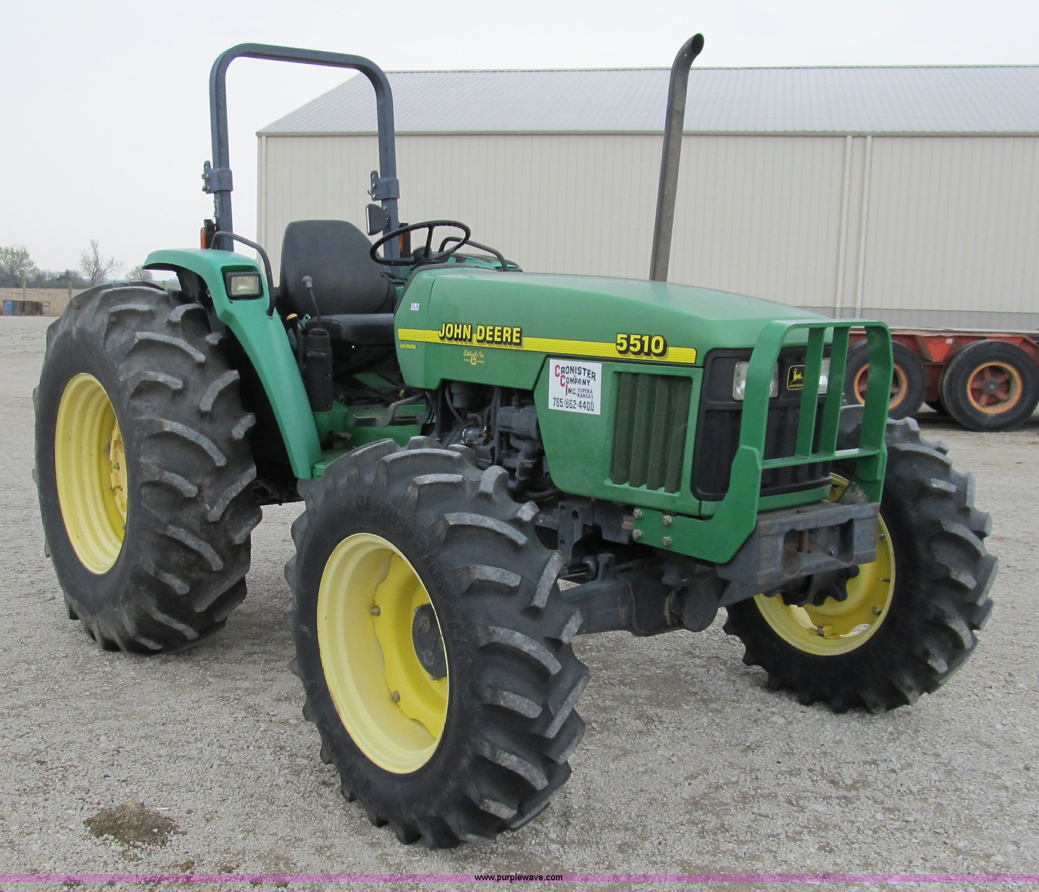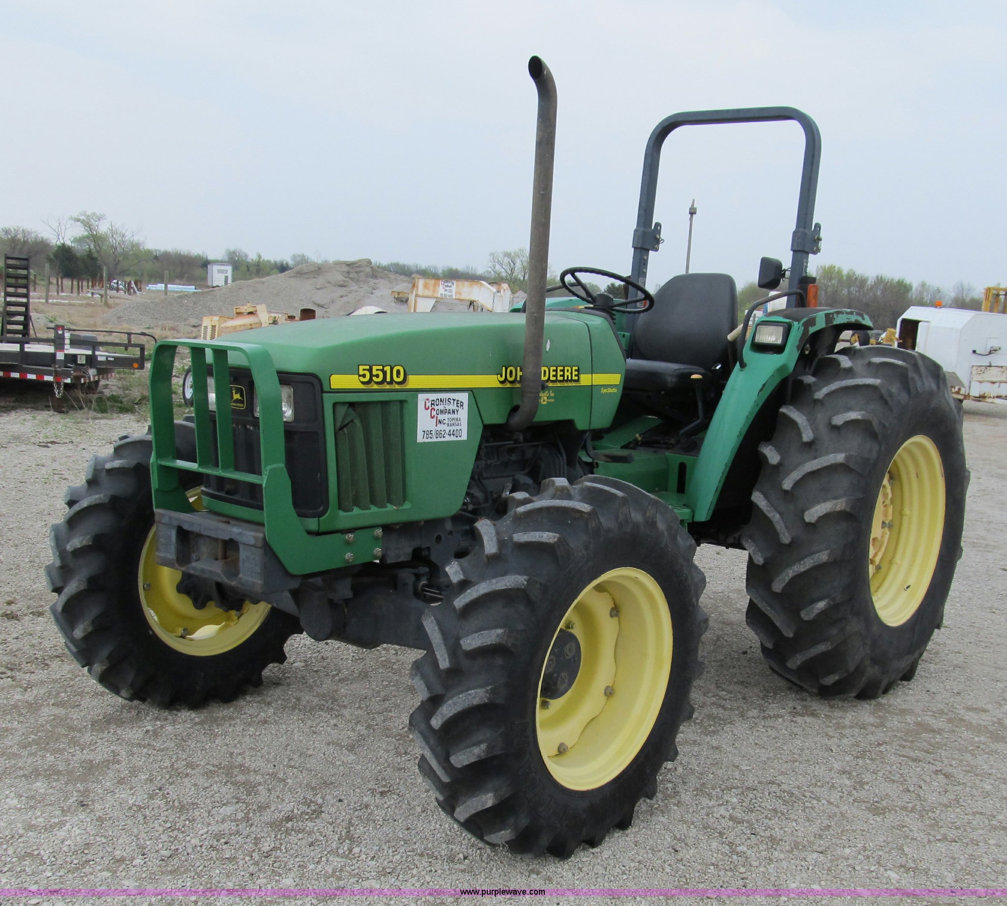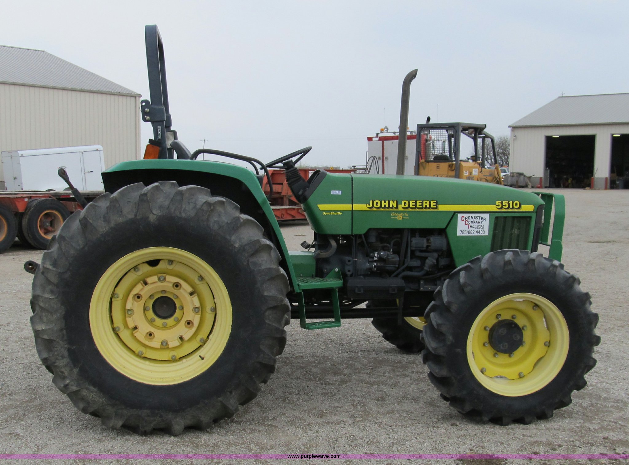 Purple Wave is selling a used Tractor in Kansas. This item is a 1998 John Deere 5510 tractor with the following: 225 actual hours, MFWD, Differential lock, John Deere four cylinder diesel engine, Serial PE4045T005070, Synchro manual transmission, Nine forward gears, Three reverse gears, Spring ride seat, Three point, 540 PTO, (2) rear hydraulic remotes, 12.5-24 front tires, 18.4-30 rear tires, Serial LV5510S151876
