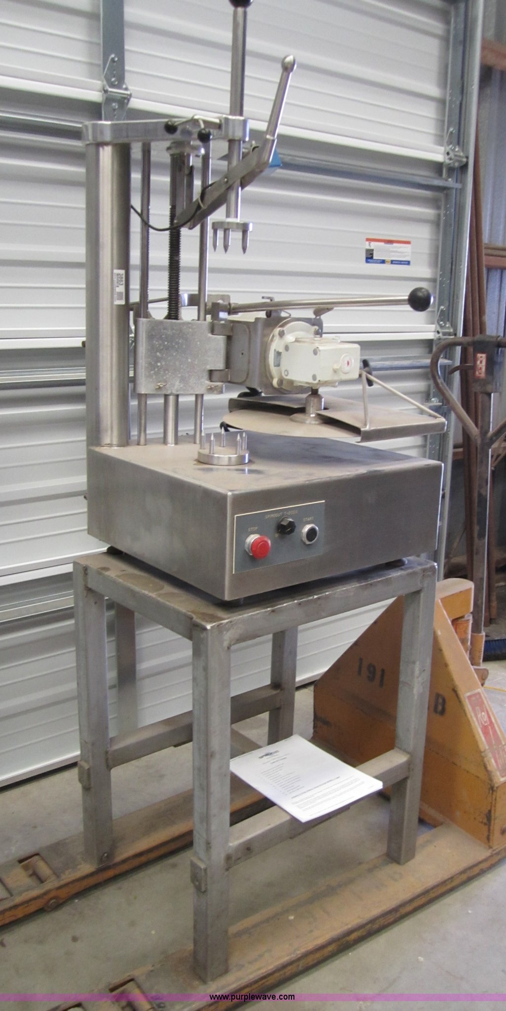 Purple Wave is selling a used Restaurant Equip. in Kansas. This item is a Spirocut T-2000 spiral meat slicer with the following: 110 volt, 1/2 HP, Stand included