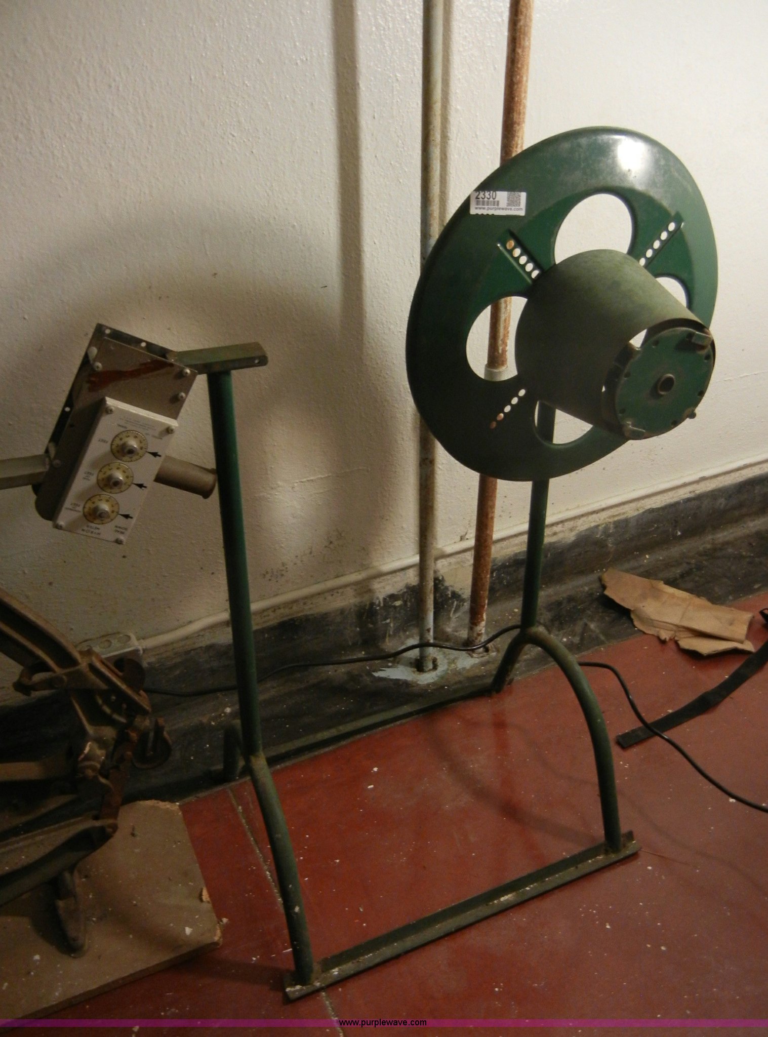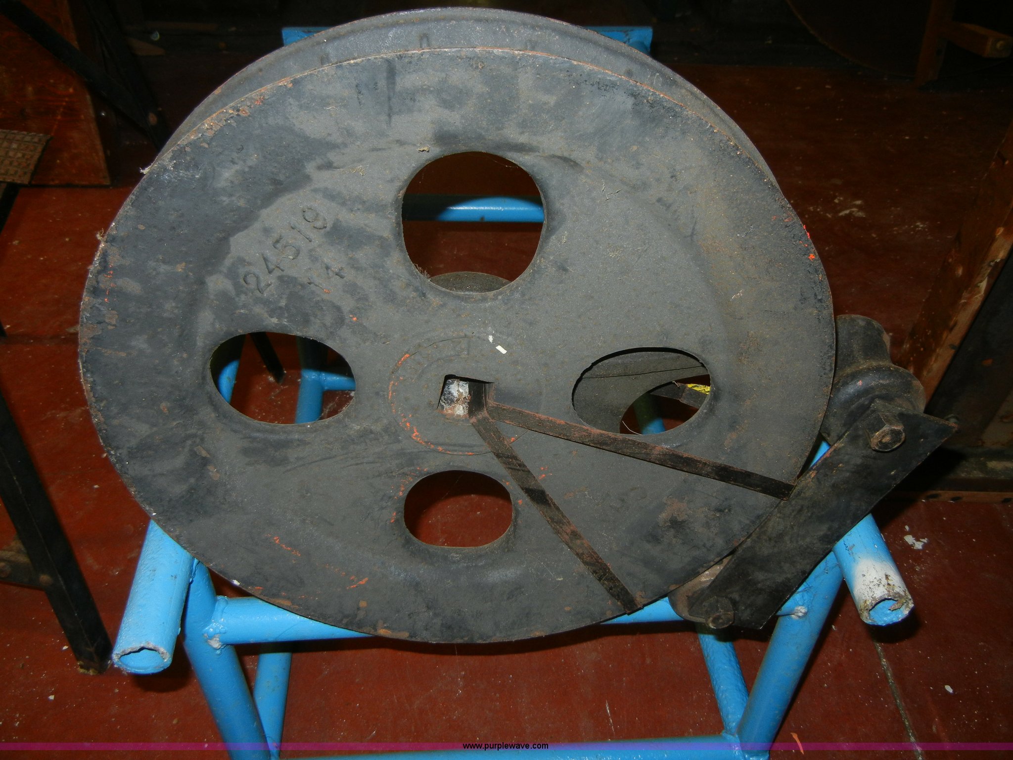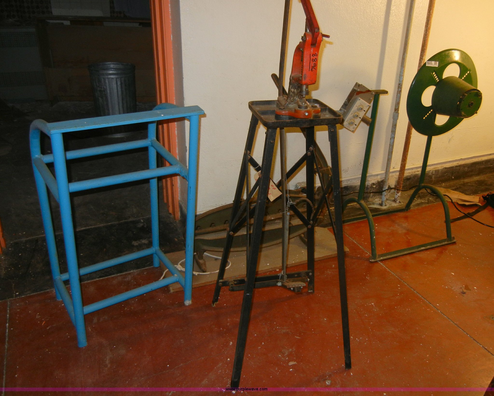 Purple Wave is selling a used Tools in Kansas. This item is a Assorted shop equipment with the following: Crane pulley, 55 gallon barrel brace, Astrup grommet punch, Improved Handy model F shingle cutter, Wire reel