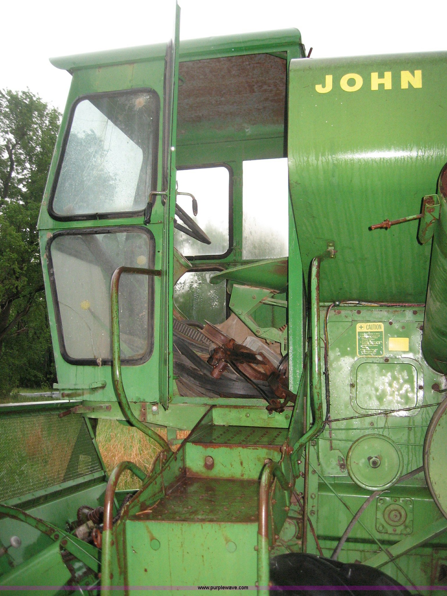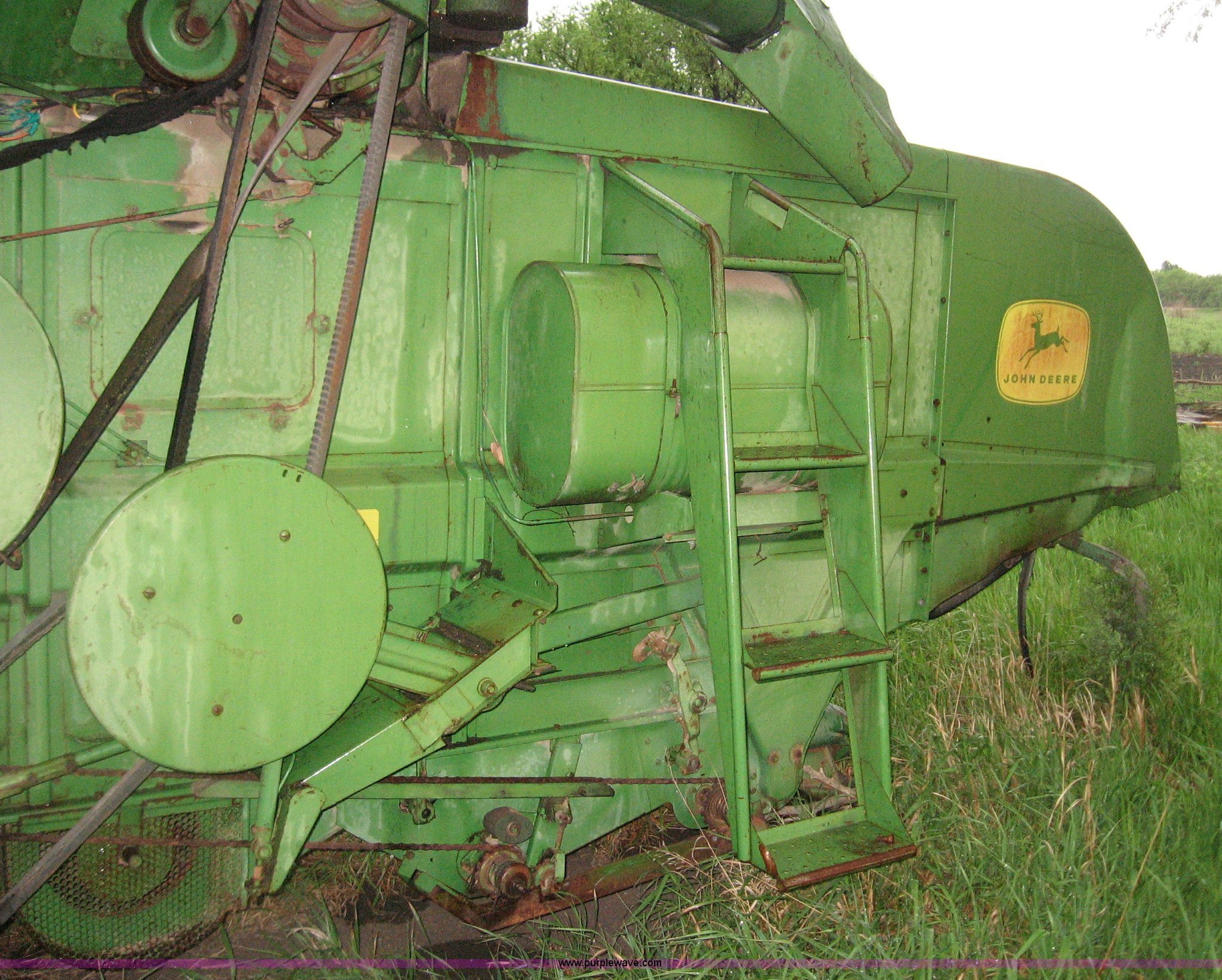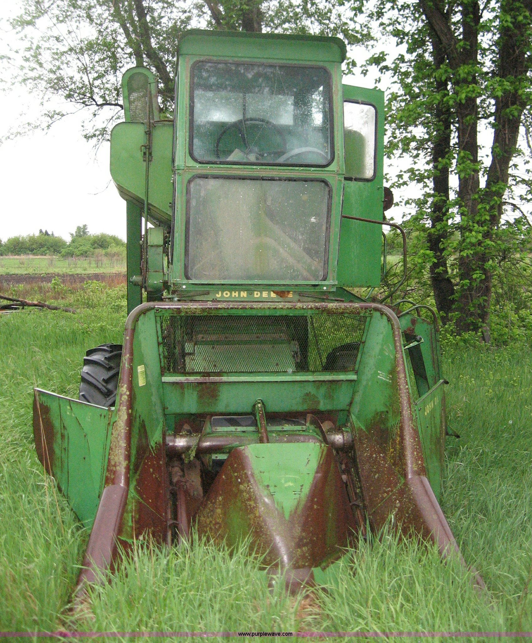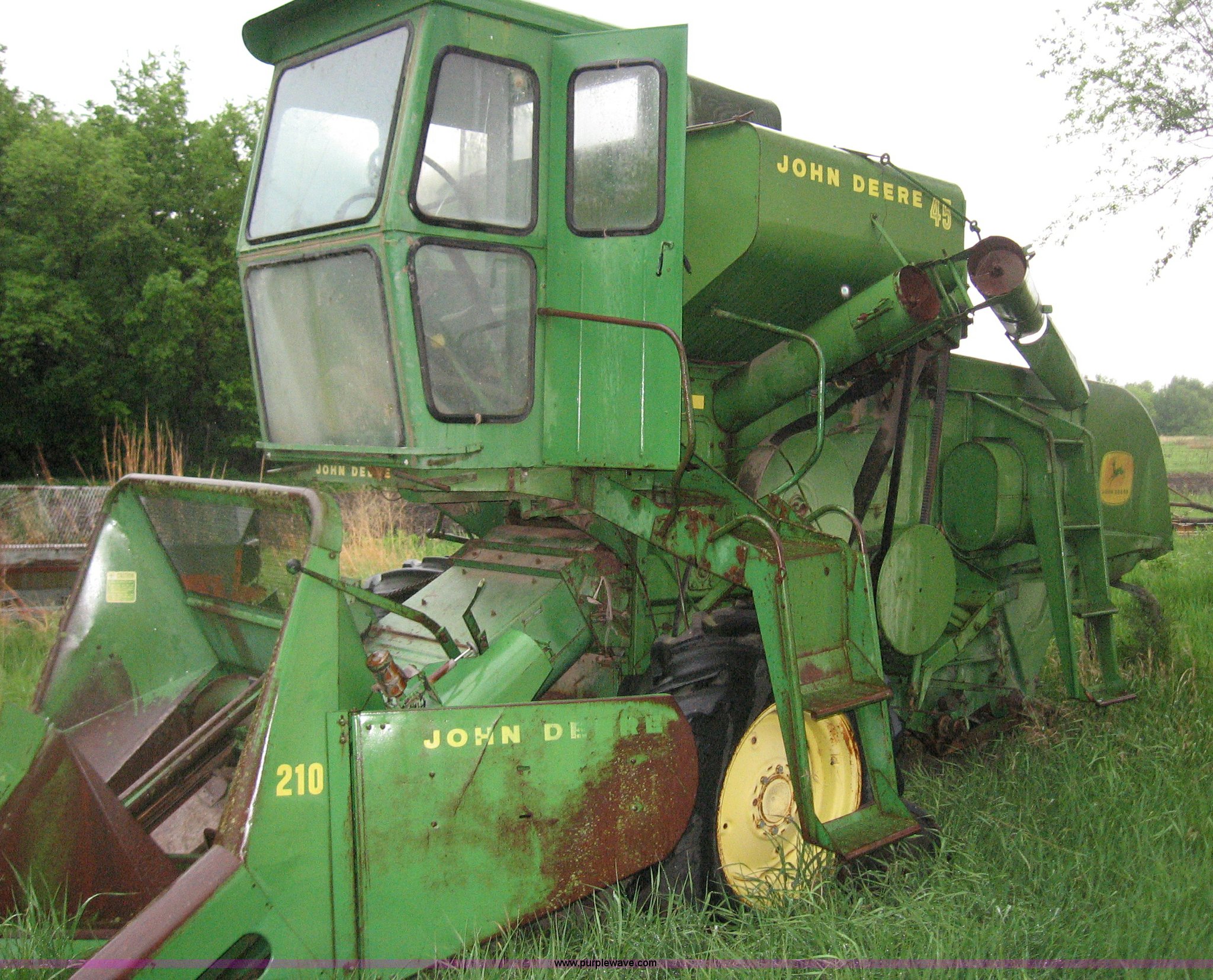 Purple Wave is selling a used Combine in Kansas. This item is a John Deere 45 combine with 210 two-row header with the following: Missing rear tires, Unknown working condition, Serial 17261