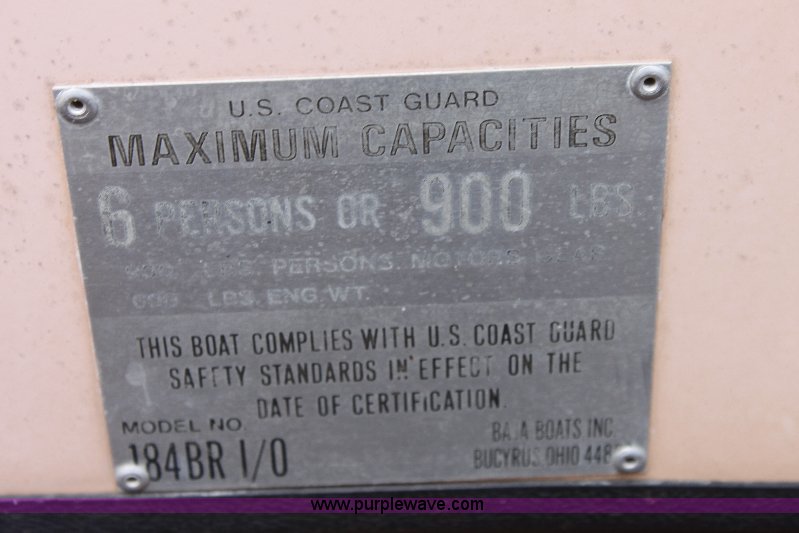Purple Wave is selling a used Boat in Kansas. This item is a 1984 Baja 18' ski boat with the following: Mercruiser 470 four cylinder gas engine, 170 HP, Serial 636892, Mercruiser out-drive, Six person or 900 lb capacity, Open bow, 19 degree three-blade prop, Boat cover included, Gimble bearings replaced, Water pump propeller replaced three years ago, Carburetor rebuilt last year, Fuel pump replaced six years ago, Battery replaced last year, 2" receiver, 195/70R14 tires, Serial BAA60126M84D