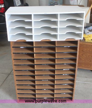 Purple Wave is selling a used Office Supplies and Equip. in Kansas. This item is a Assorted office items with the following: Laminate wood desk, 48" x 30", Fellows plastic storage unit, Wood office mailbox