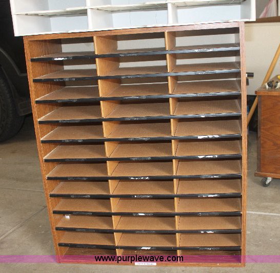 Assorted office items. Laminate wood desk 48" x 30", Fellows plastic storage unit, Wood office mailbox. City Of Colwich. 116 N 3rd. Colwich, KS 67030