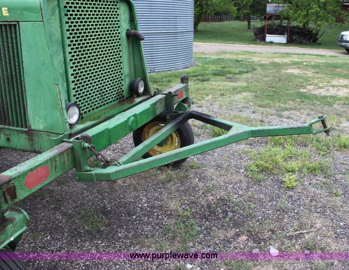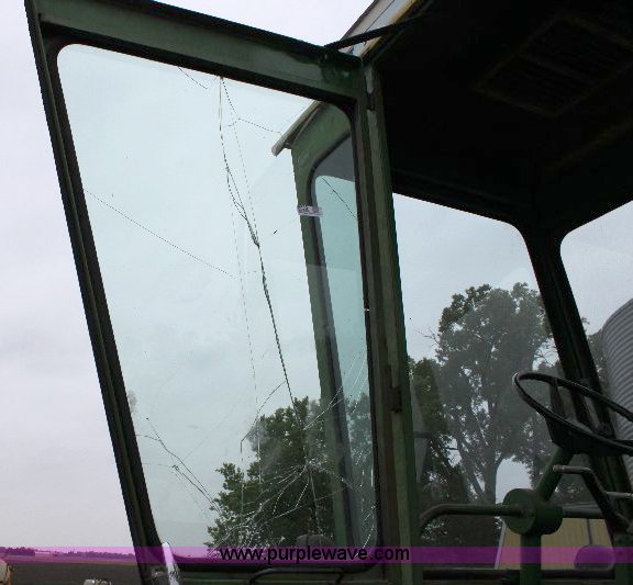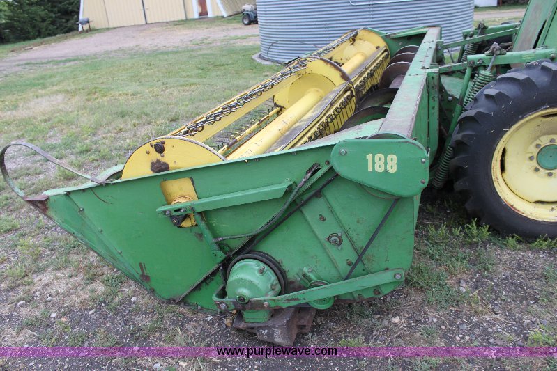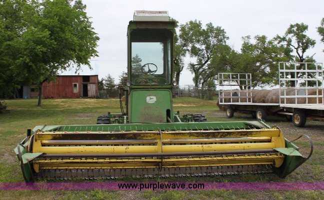 Purple Wave is selling a used Windrower Self Propelled in Kansas. This item is a John Deere 880 swather with the following: John Deere four cylinder diesel engine, Hydrostatic transmission, Bycool evaporator cab cooler, John Deere 188 14' header, Hydraulic platform raise, Auxiliary hydraulic couplers, Tow bar, Recently replaced rear wheel bearings and tires, 11.2-24 front tires, 5.90-15 rear tires, Radiator rebuilt two years ago, Retoothed, sickles, hold-downs, guards, and reel bearings replaced two years ago, Serial 050602