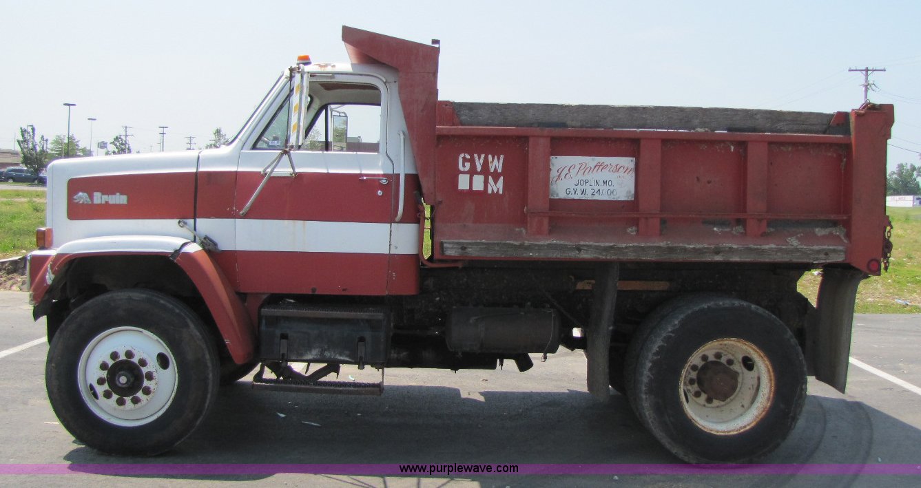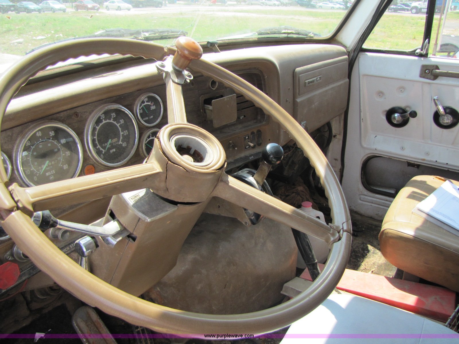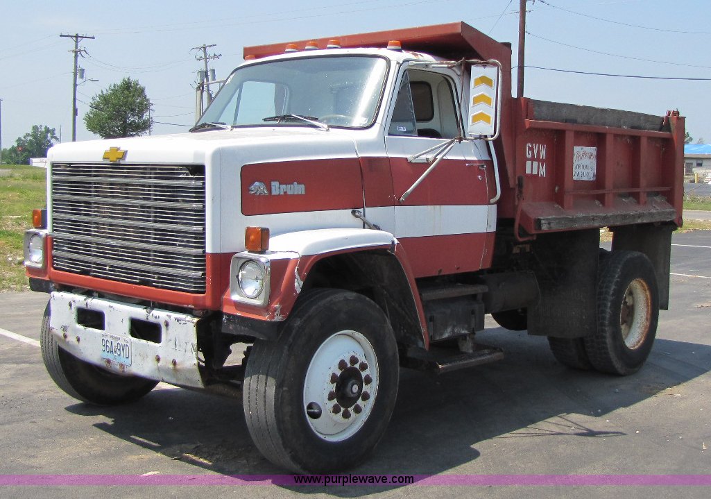 Purple Wave is selling a used Construction Dump Truck in Missouri. This item is a 1979 Chevrolet Bruin dump truck with the following: 184,963 miles on odometer, Detroit DW-15 diesel engine, Four speed automatic transmission, Heater, Tilt, Spring ride seat, 9' dump bed, Manual end gate, Single 80 gallon fuel tank, Bumper, Block heater, Pintle hitch, Spring suspension, PTO, Air brakes, 295/75R22.5 tires, GVWR 33,200 lbs, FAWR 12,000 lbs, RAWR 21,200 lbs, Broken windshield