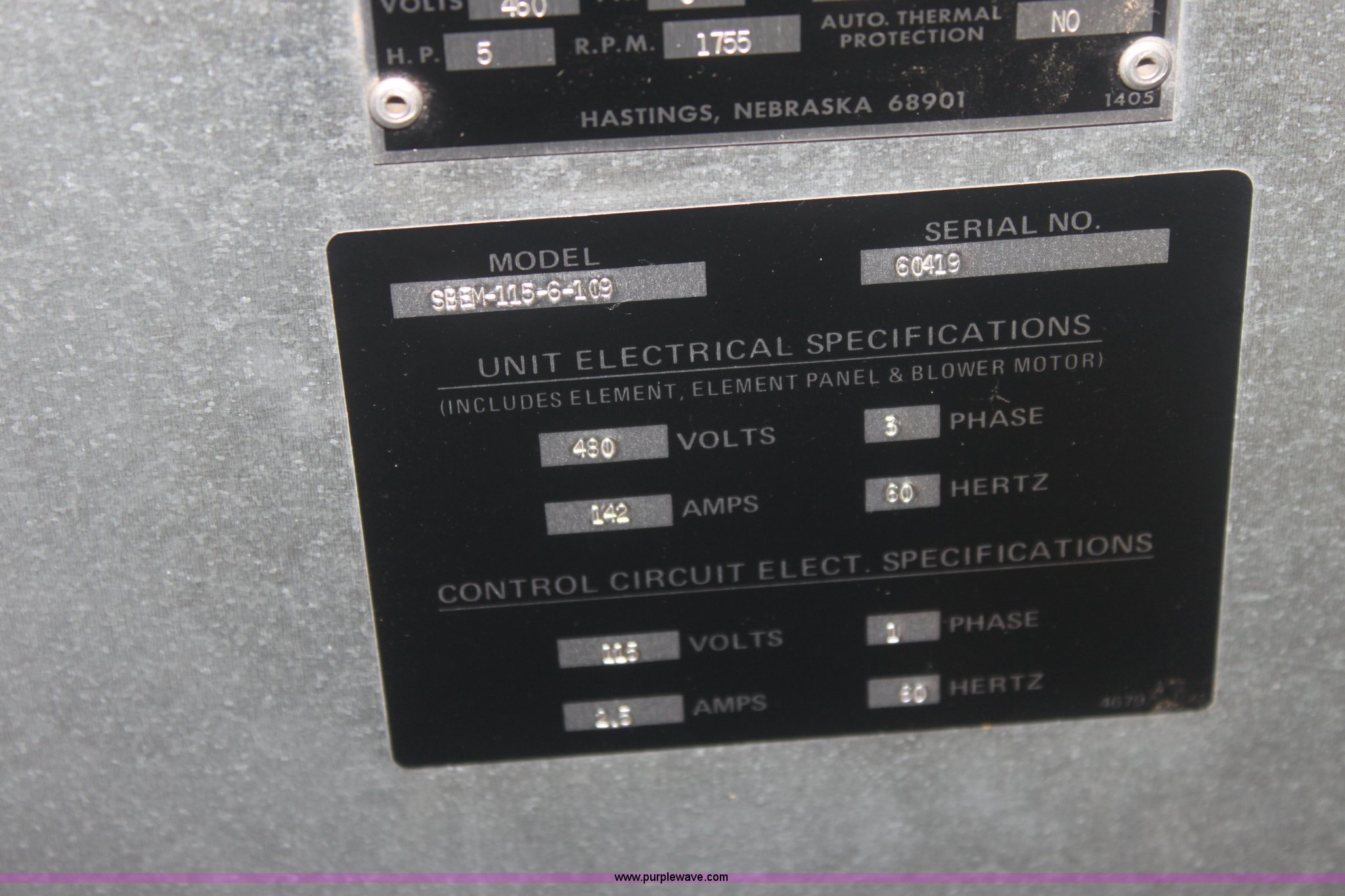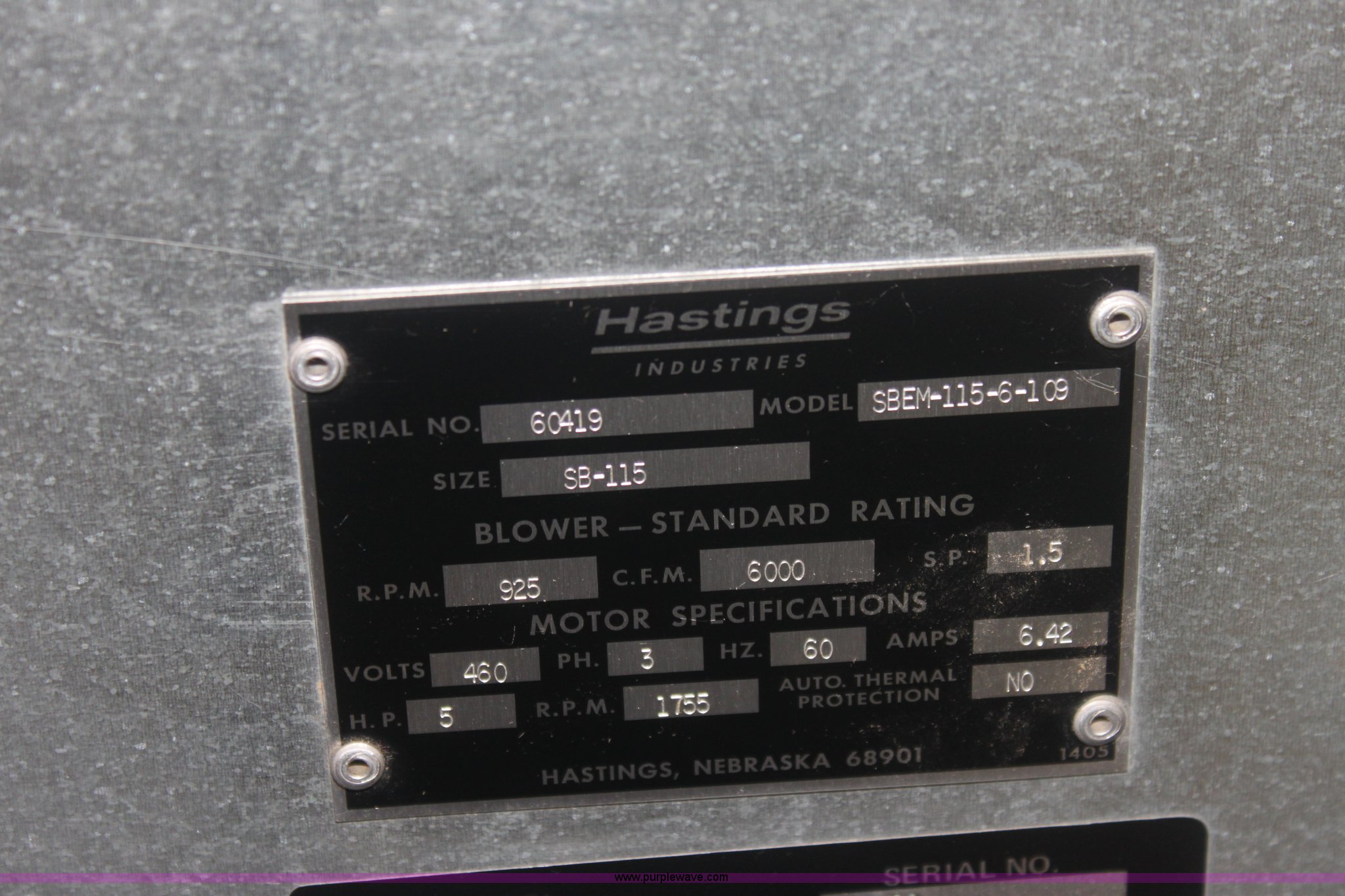 Purple Wave is selling a used Other Industrial or Business in Kansas. This item is a Hastings Forced air furnace with the following: Model SBEM-115-6-109, 925 RPM, Three phase, 5 HP, Never used