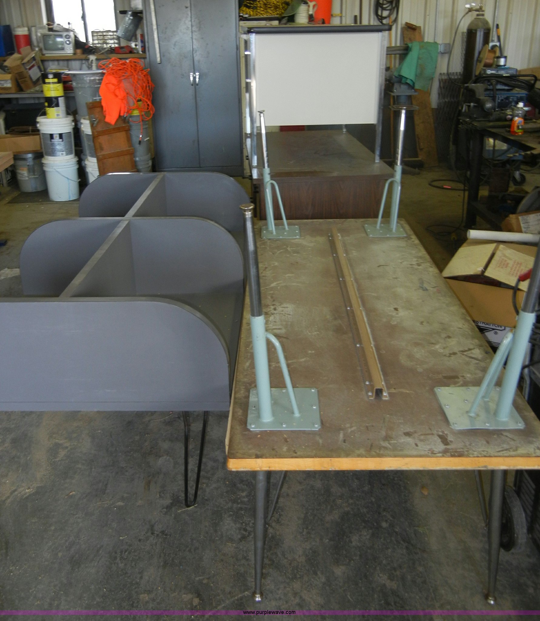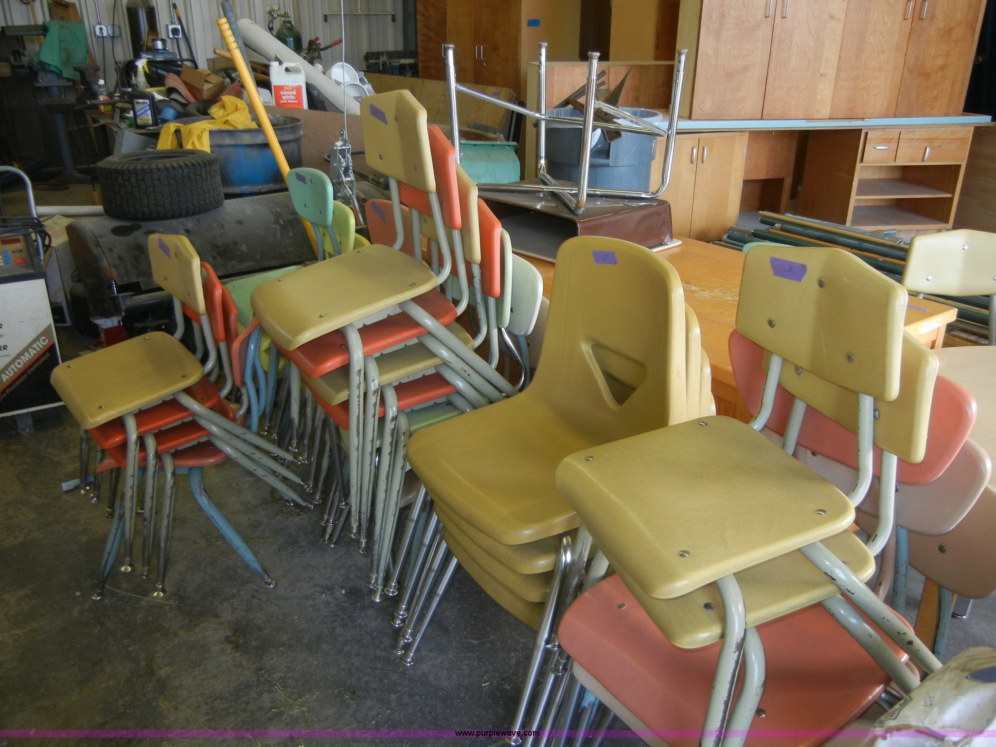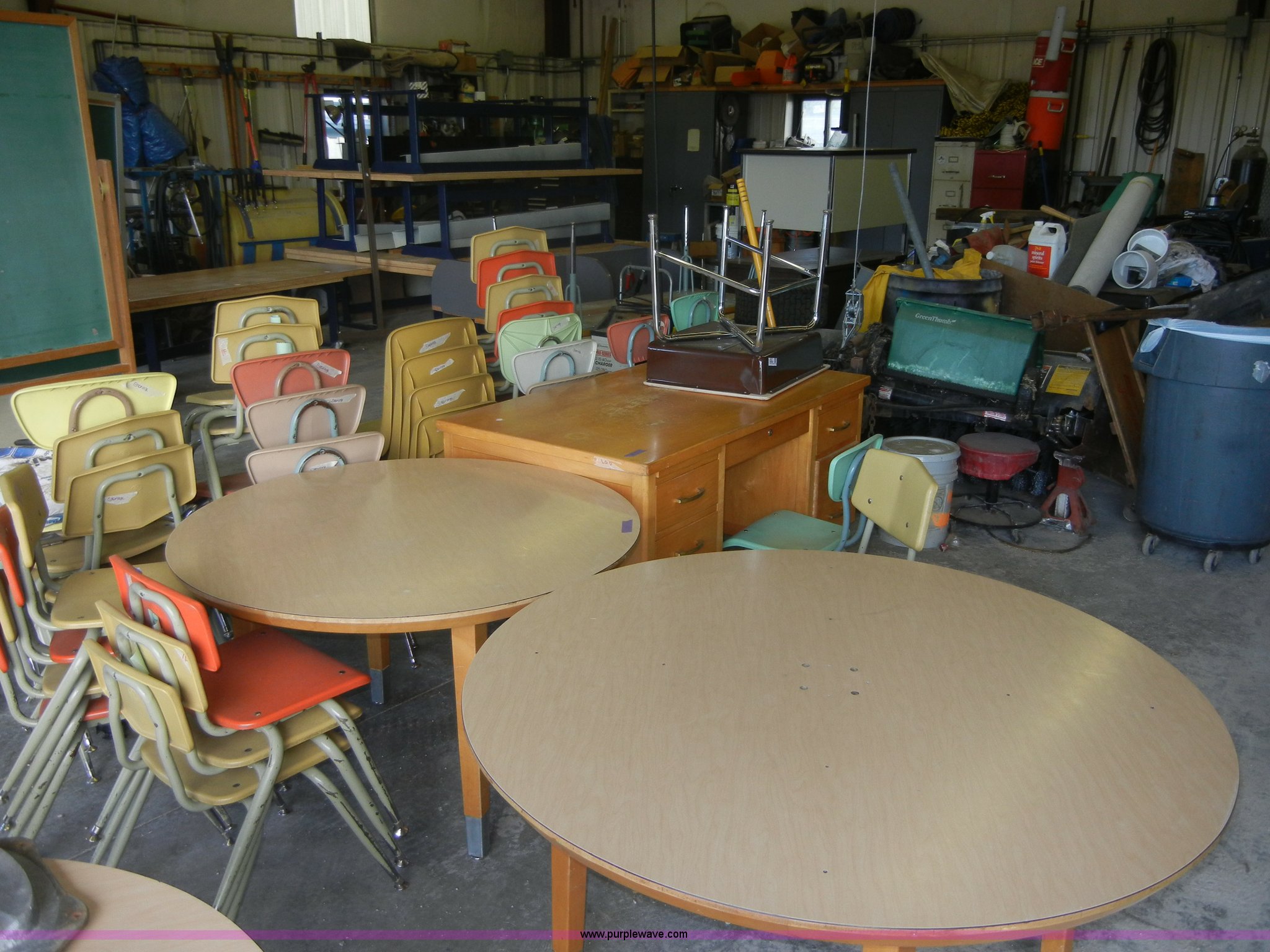 Purple Wave is selling a used Furniture in Kansas. This item is a Assortment of tables and chairs with the following: (17) desks and tables, (36) chairs