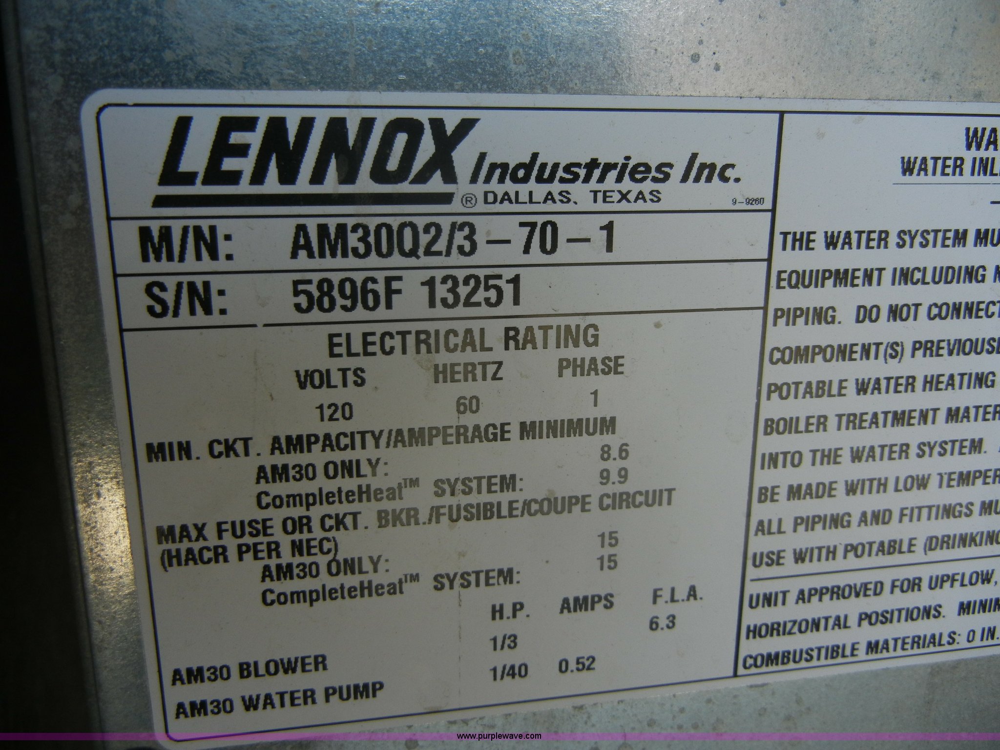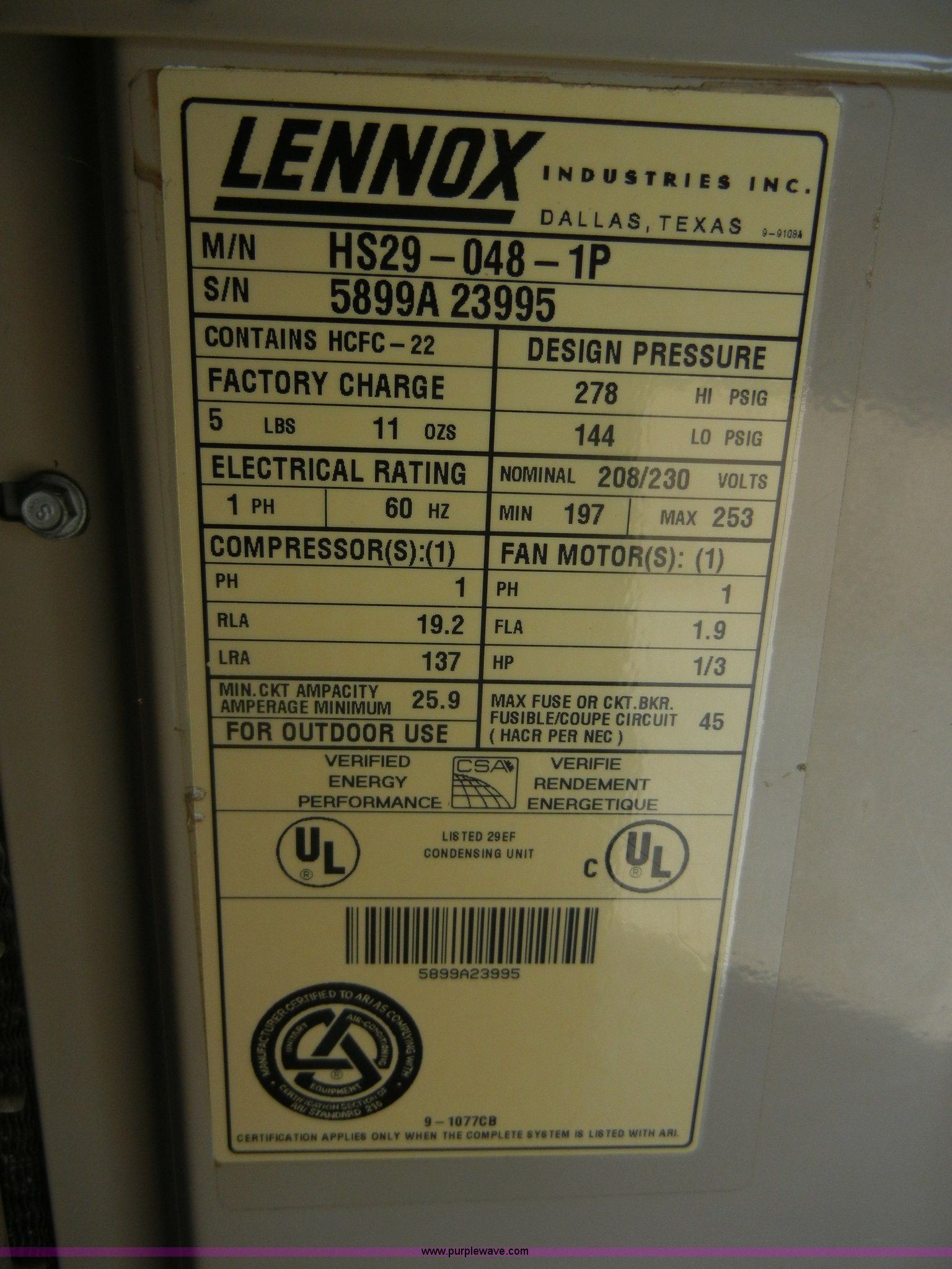 Purple Wave is selling a used All Other Household Items in Kansas. This item is a Lennox AC and Handler units with the following: AC, Single phase, 208/230 volts, Model HS290481P, Serial 5899A23995, Handler, Single phase, 1/3 HP, 120 volt, Model AM30Q213701, Serial 5896F13251, Unknown working conditions