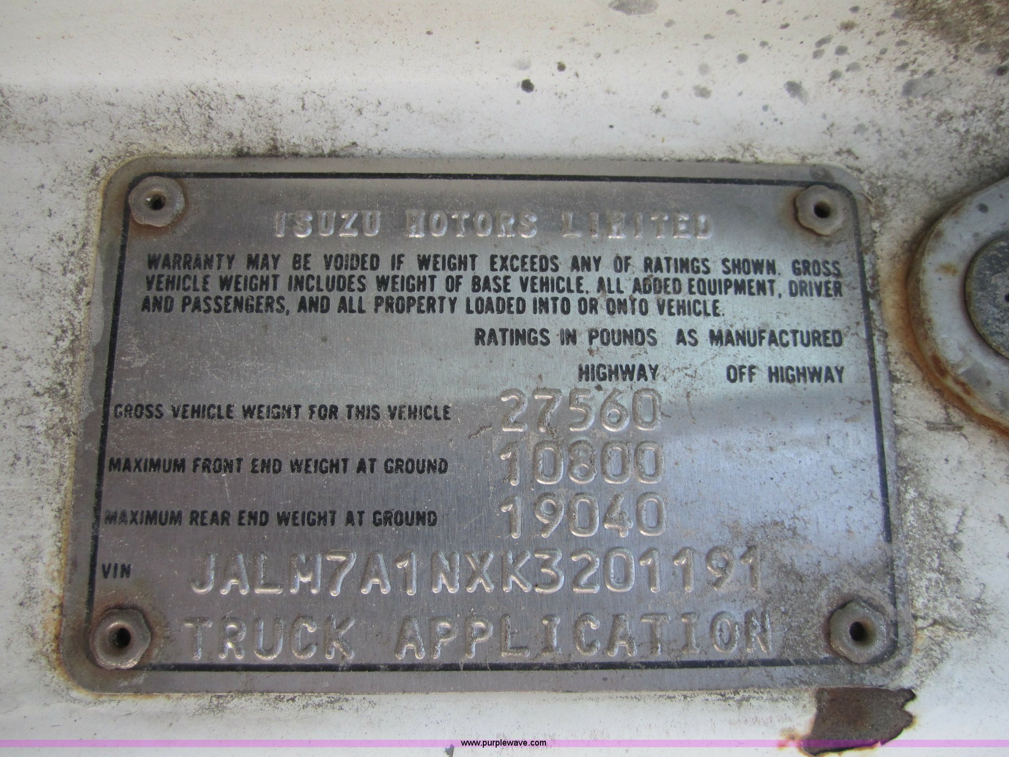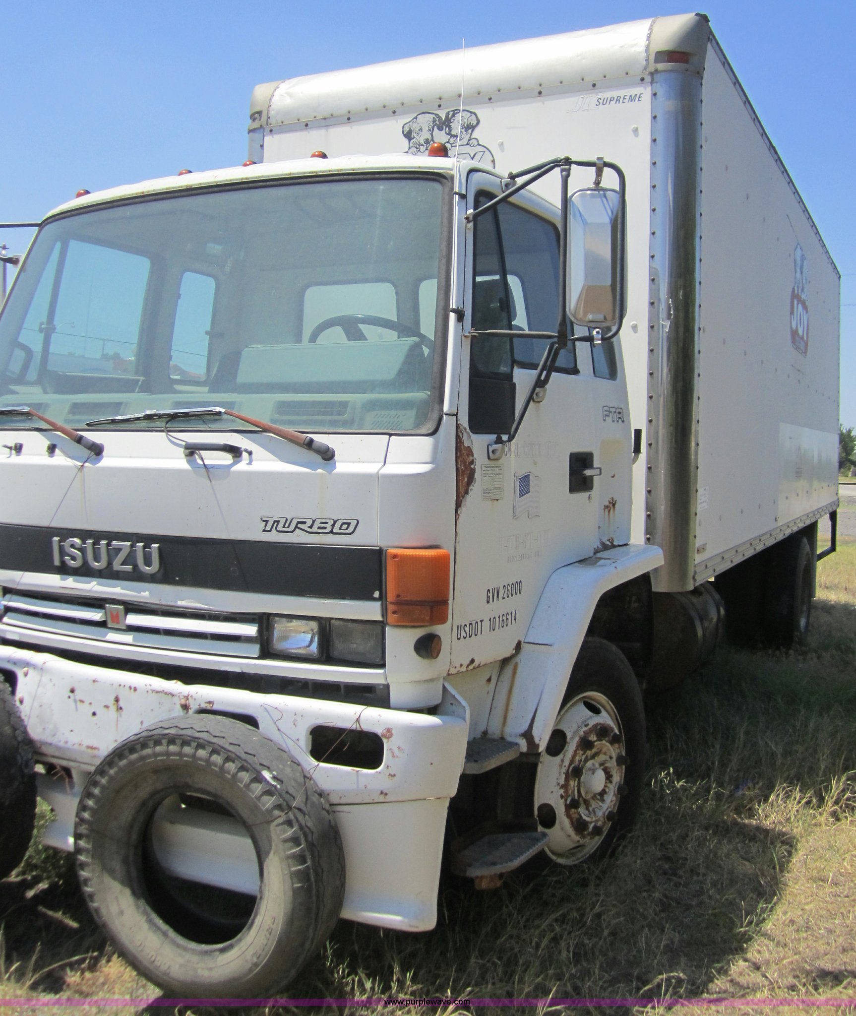 Purple Wave is selling a used Box Truck in Oklahoma. This item is a 1989 Isuzu FTR box truck with the following: 266,073 miles on odometer, Isuzu 6BD1 5.8L engine, Engine blown, Automatic transmission, 24'L cargo body, Maxon rear tailgate lift, GVWR 27,560 lbs, FAWR 10,800 lbs, RAWR 19,040 lbs, No batteries