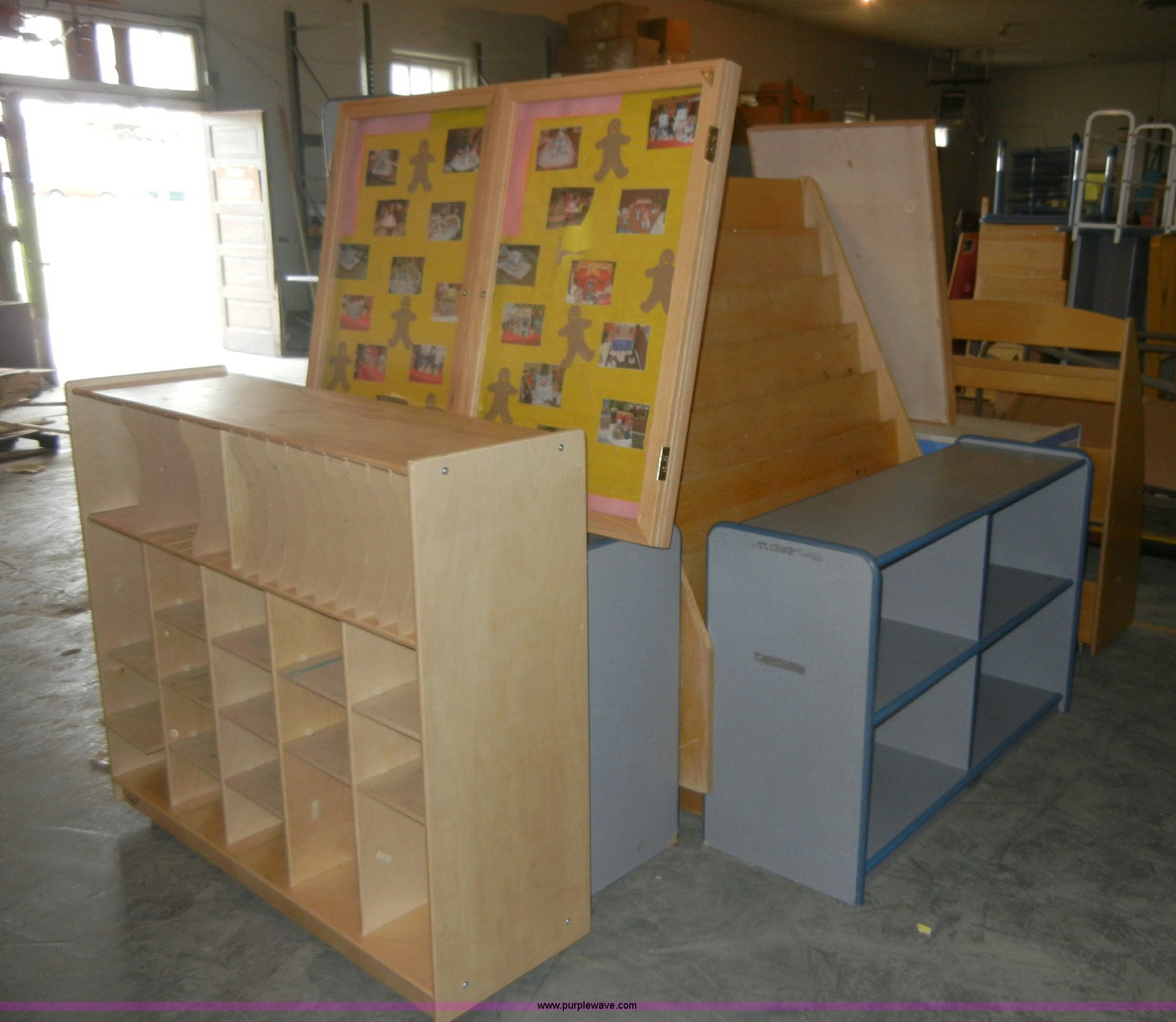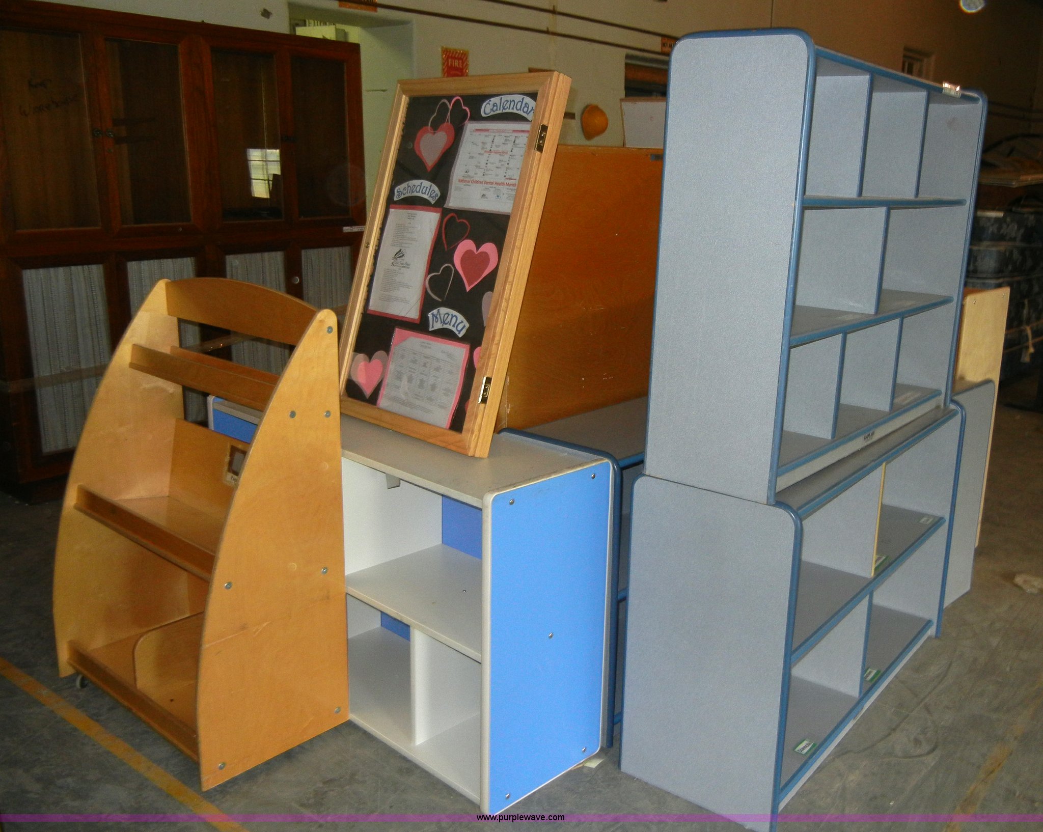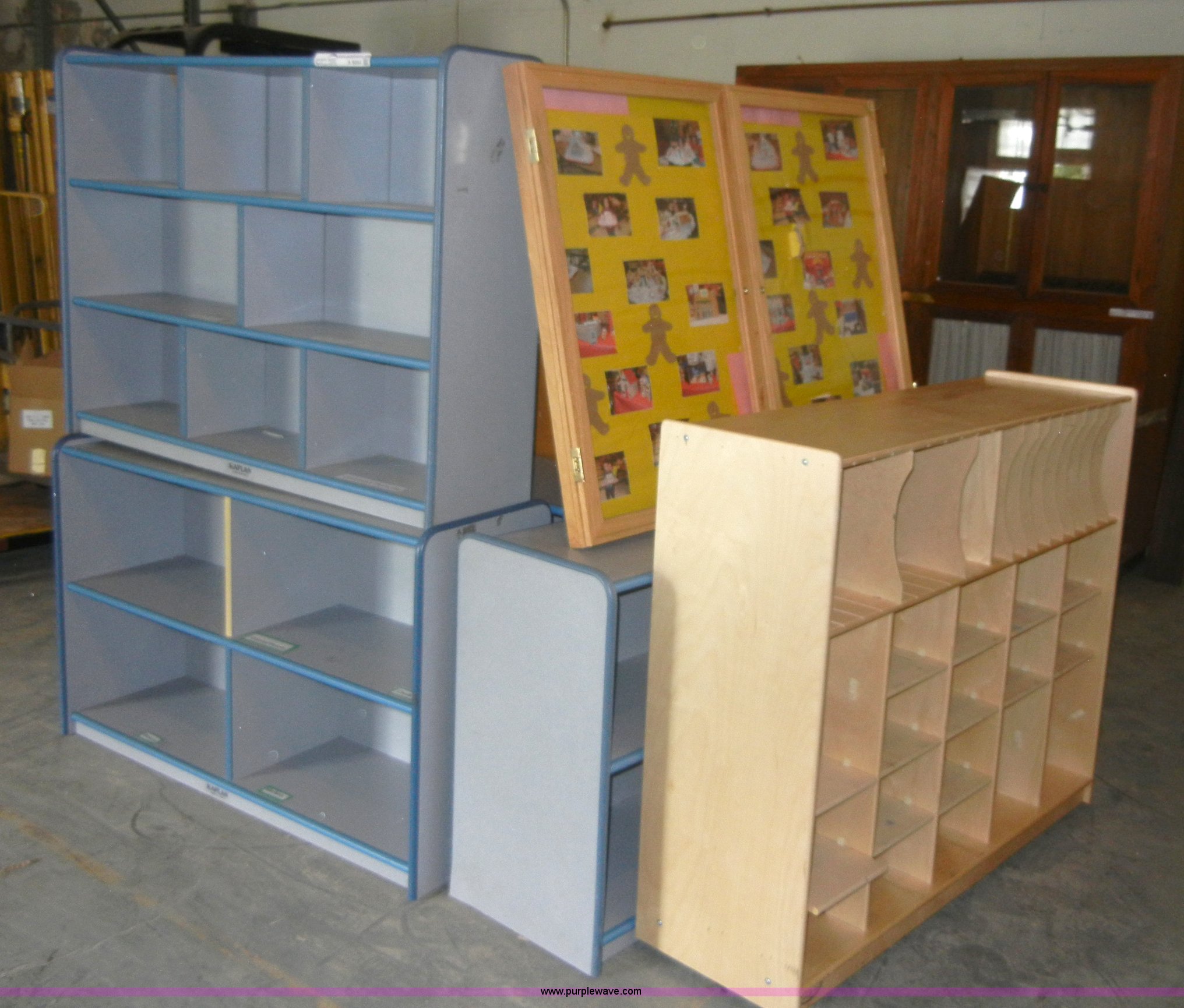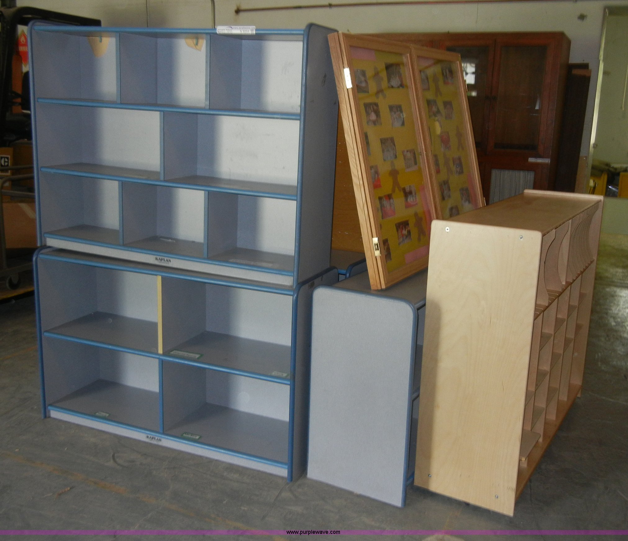 Purple Wave is selling a used Furniture in Kansas. This item is a Assorted children's furniture with the following: (7) storage units, (2) glass display cases, Bookshelf on casters