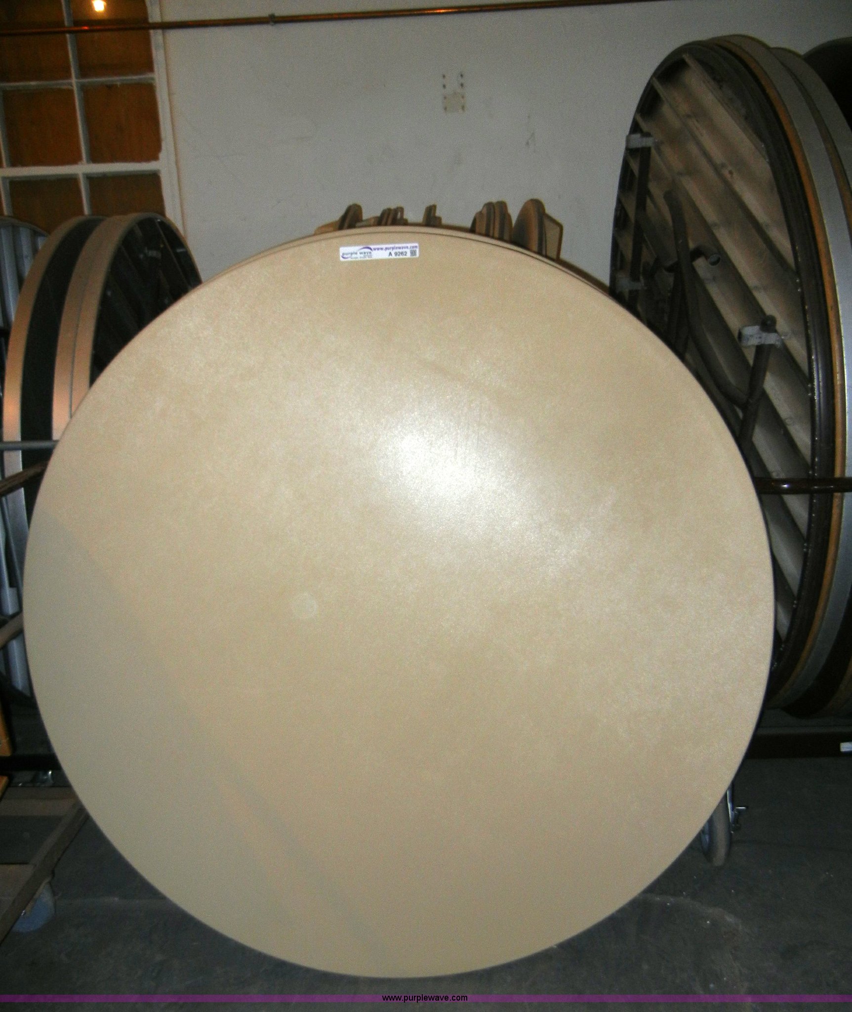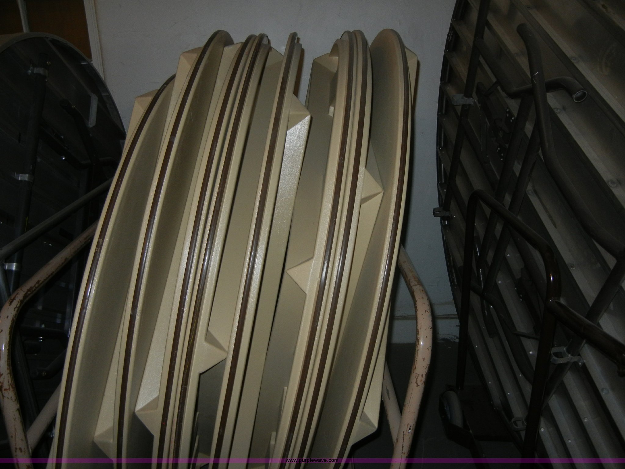 Purple Wave is selling a used Furniture in Kansas. This item is a (10) plastic round top tables with the following: 5' diameter, Includes storage rack