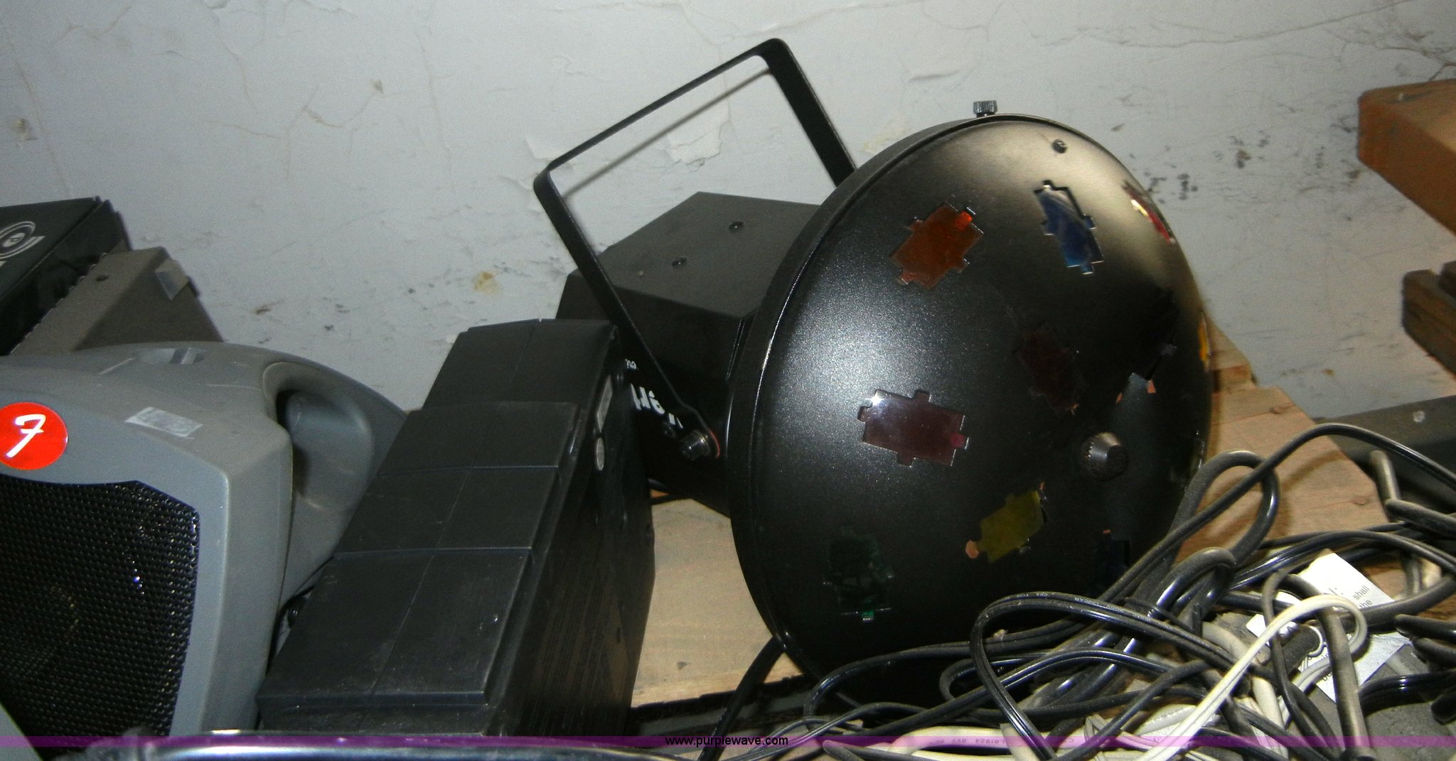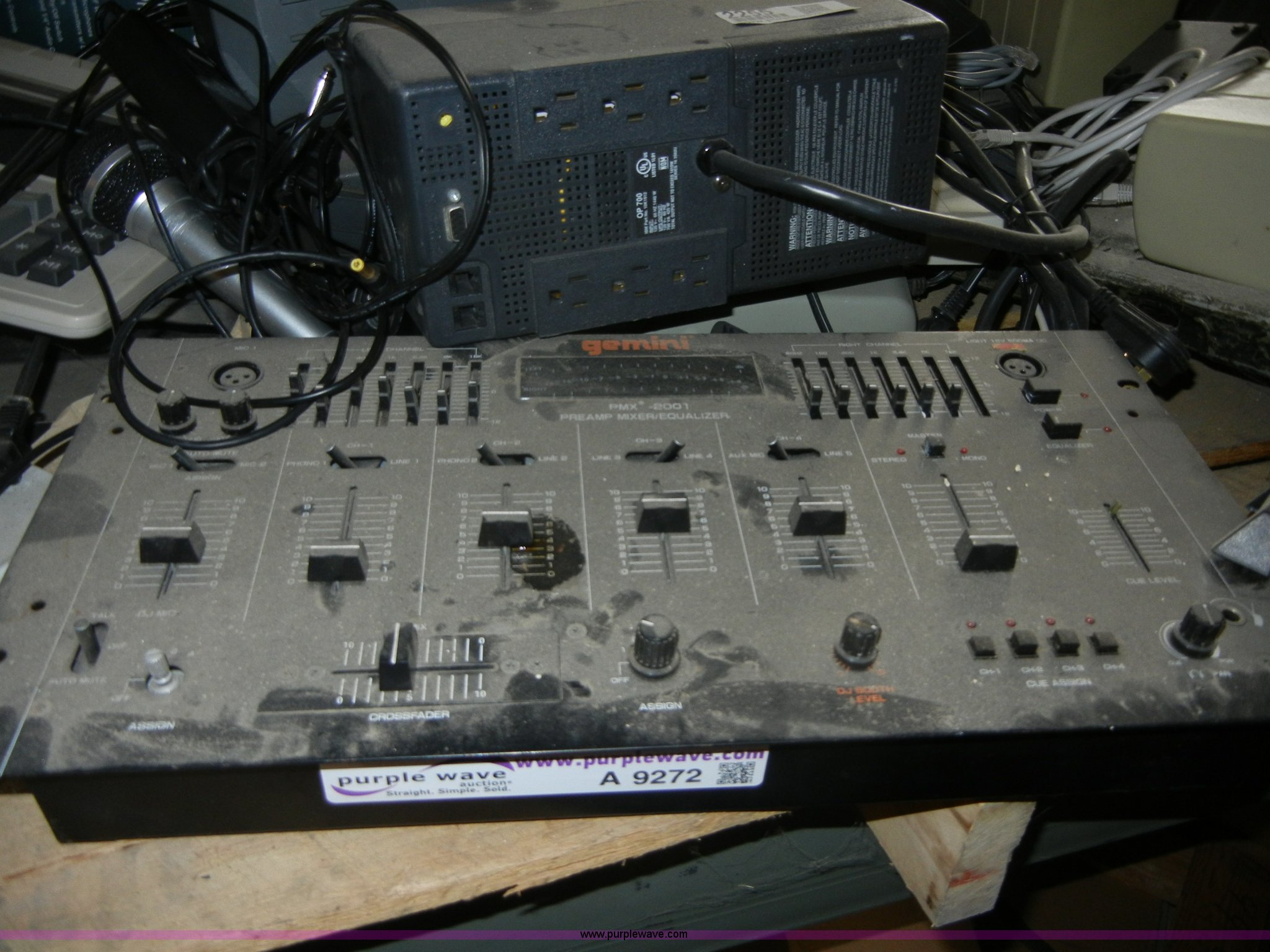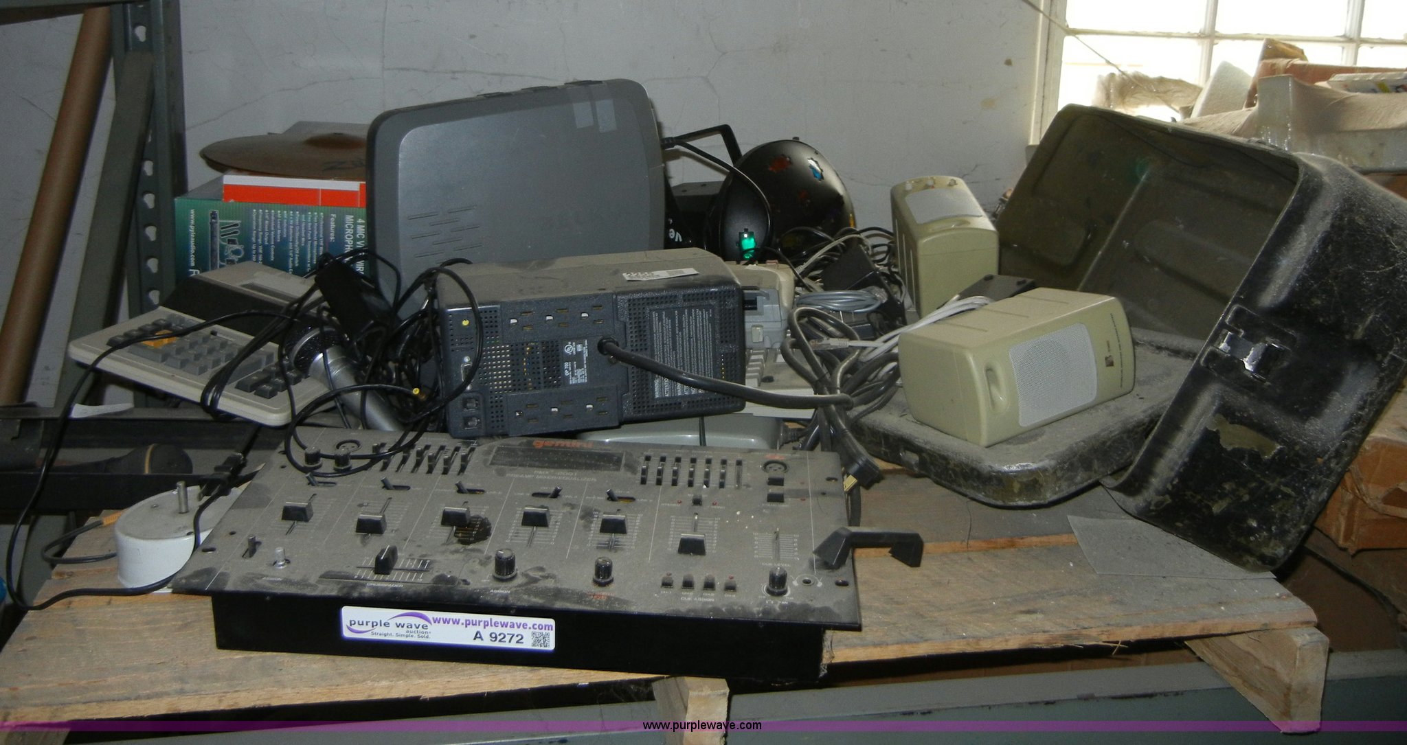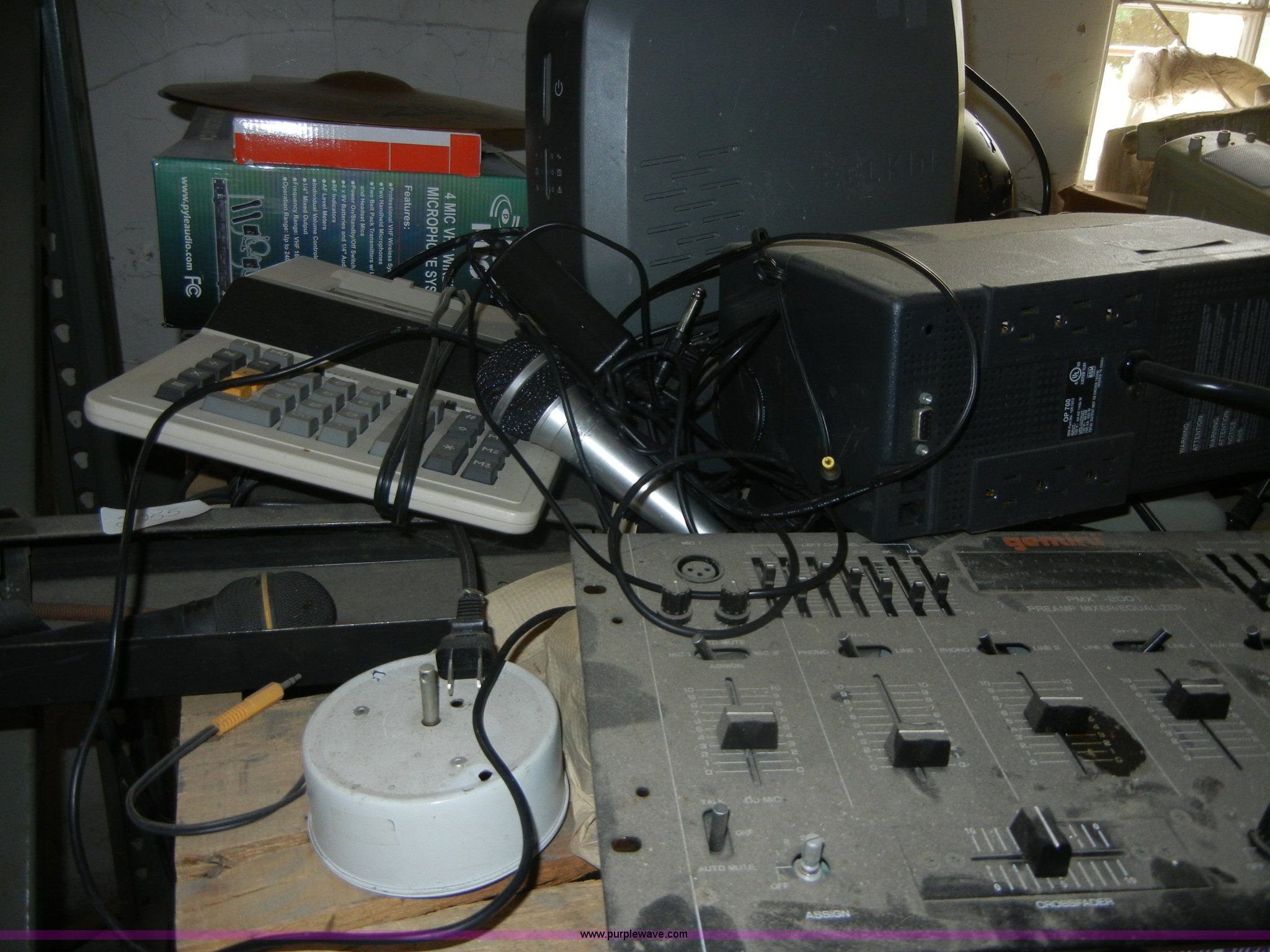 Purple Wave is selling a used Electronics in Kansas. This item is a Assorted electronics with the following: Gemini PMX2001 mixer, Passport P10W speaker, Spot light, Bekin surge protector, And more