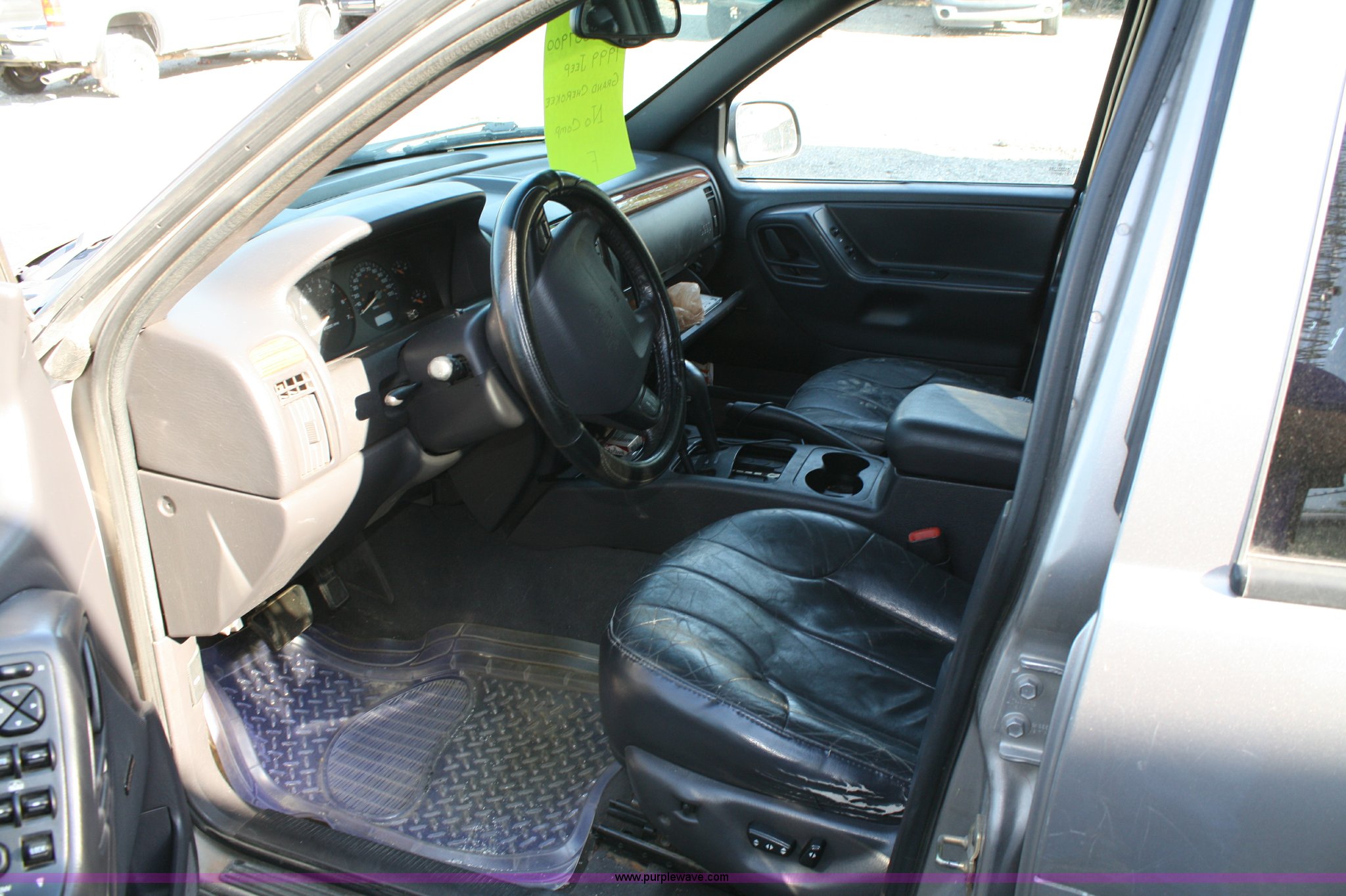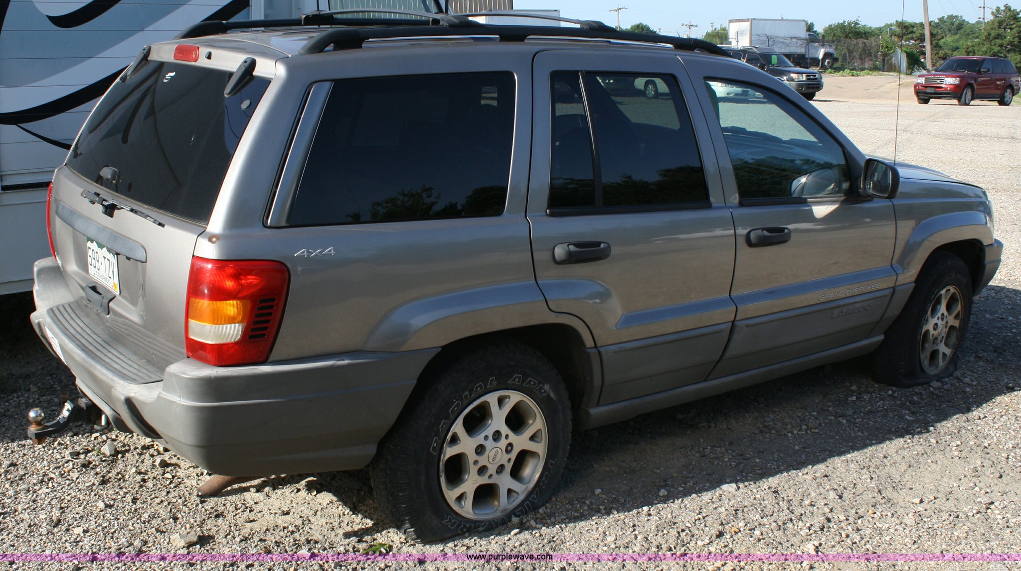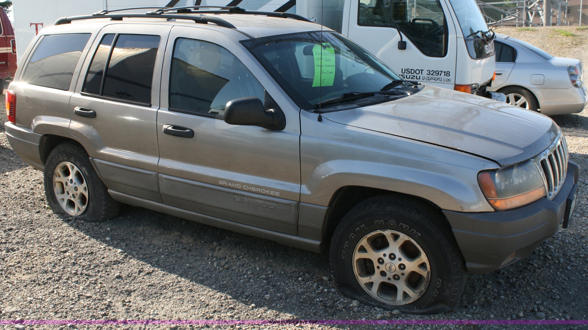 Purple Wave is selling a used Passenger Vehicle in Kansas. This item is a 1999 Jeep Grand Cherokee Laredo SUV with the following: Mileage unknown, 4.0L I6 SFI engine, Automatic transmission, Four wheel drive, AC and heat, Tilt, Cruise, AM/FM/CD, Power windows, locks, mirrors, and seats, Vinyl seats, cracked, Receiver hitch, Trailer wiring, 235/75R16 tires, flat, Rust spots, Exterior cosmetic damage, Battery dead, Unit# 16