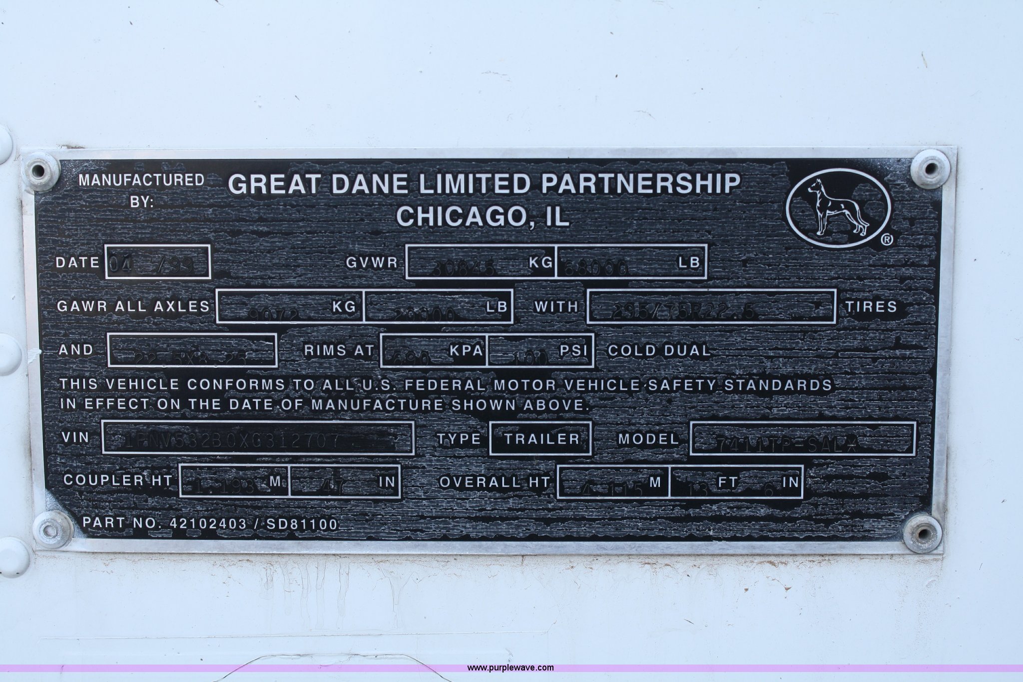 Purple Wave is selling a used Dry Van Trailer in Kansas. This item is a 1999 Great Dane 53' van trailer with the following: Air ride suspension, 13'6" overall height, 275/80R22.5 tires, GVWR 68,000 lbs, GAWR 20,000 lbs, Model 7411TP-SAL, Unit# 14