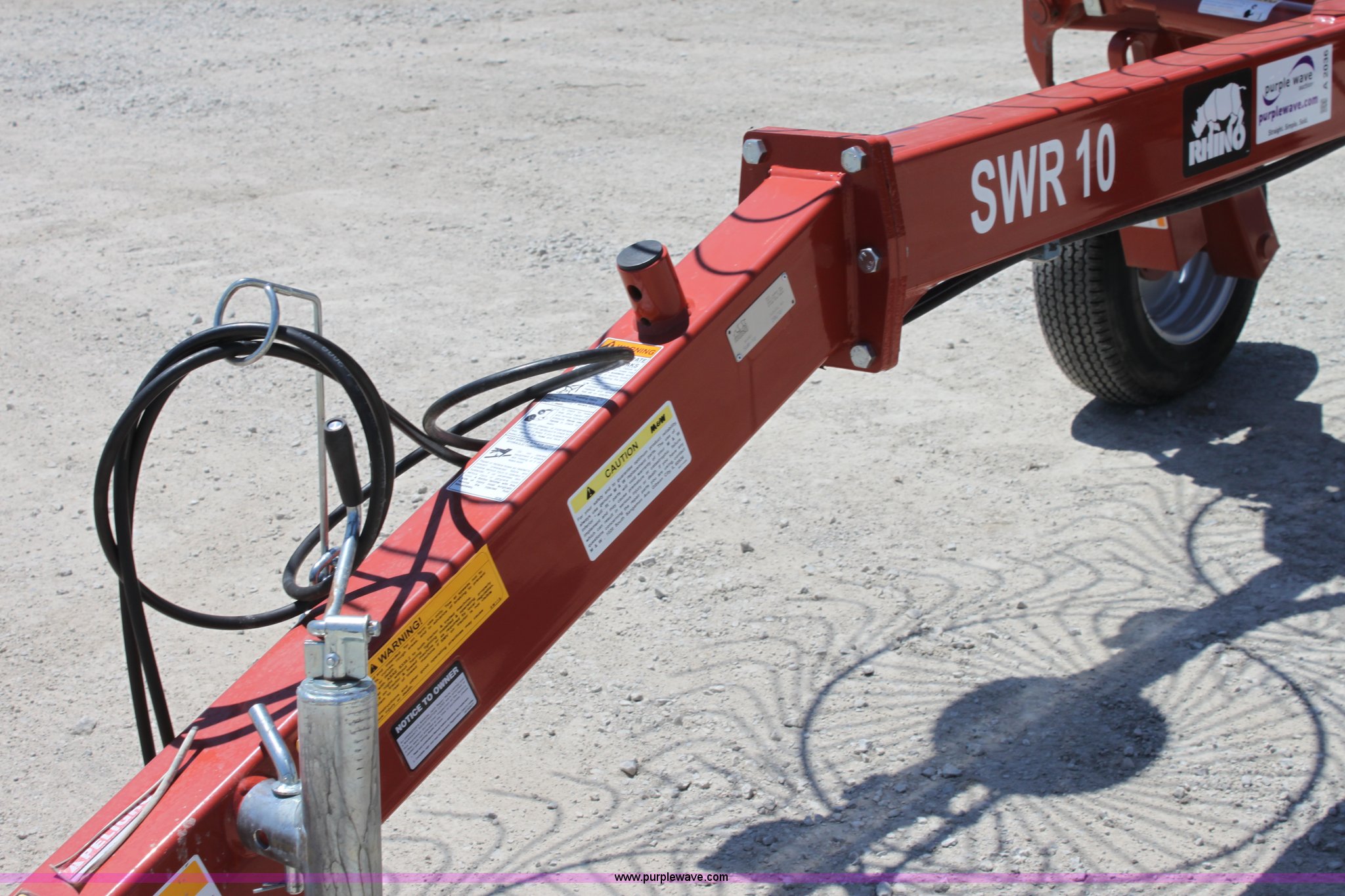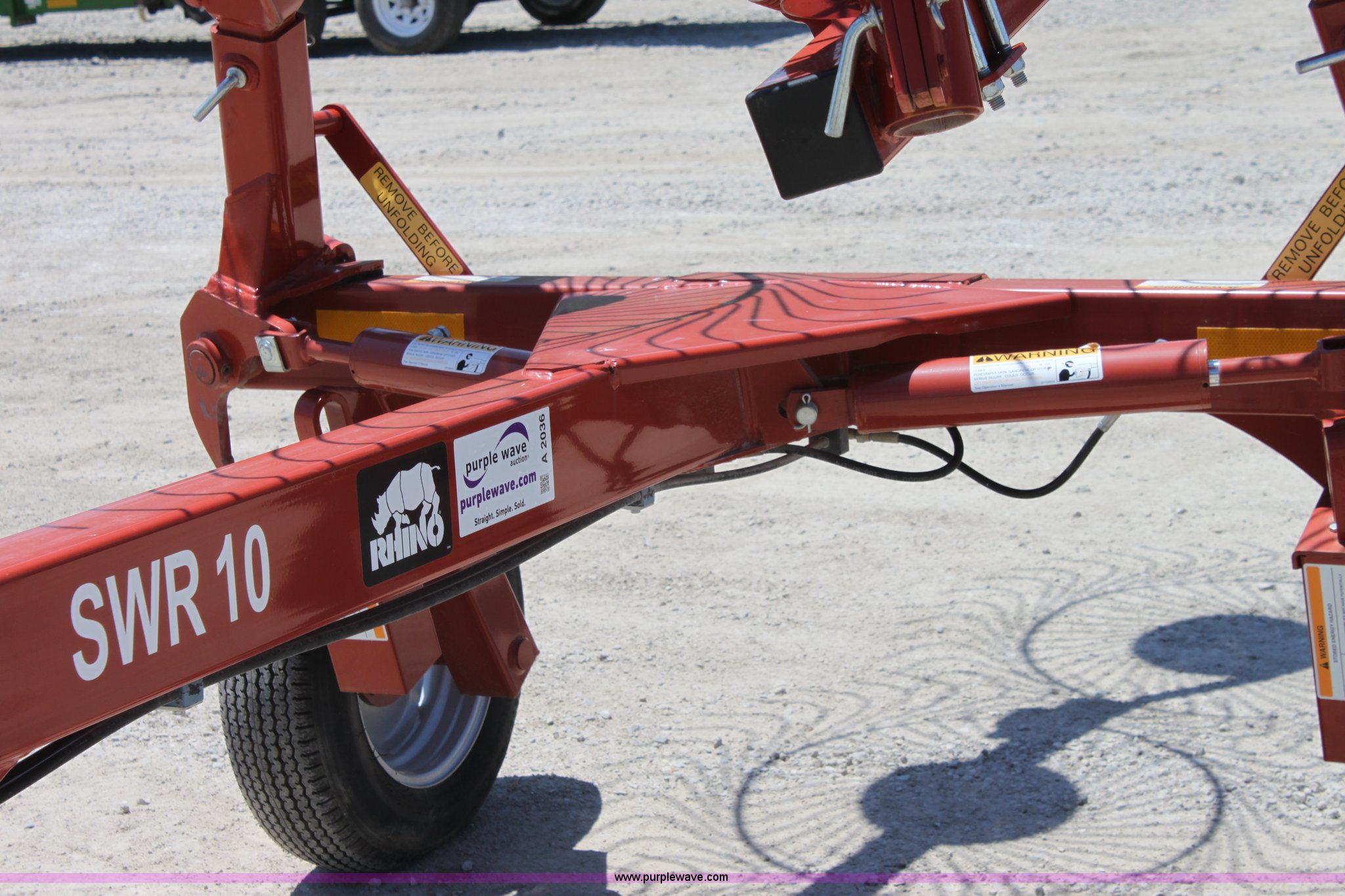 2009 Rhino SWR10 hay rake. 10 wheels, Hydraulic fold, Two wheel carriage, Pin hitch, Serial 206701, ID 08F765. Shipping quotes available. Dean Ag Services. Hwy 36 East. Chillicothe, MO 64601