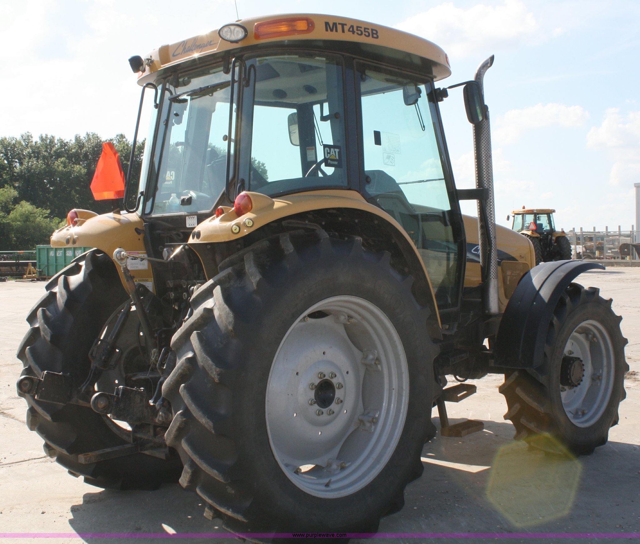 Purple Wave is selling a used Tractor in Missouri. This item is a 2006 Challenger MT455B MFWD tractor with the following: 1,238 hours on meter, Caterpillar 3054C four cylinder diesel engine, 85 PTO HP, Powershift/Shuttle transmission, 16 Forward and Reverse gears, AC and heat, AM/FM/CD, Three point, 540/1000 PTO, (4) hydraulic remote sets, Front fenders, 16.9R38 rear tires, 13.6R28 front tires, Serial R304051, ID 10S194