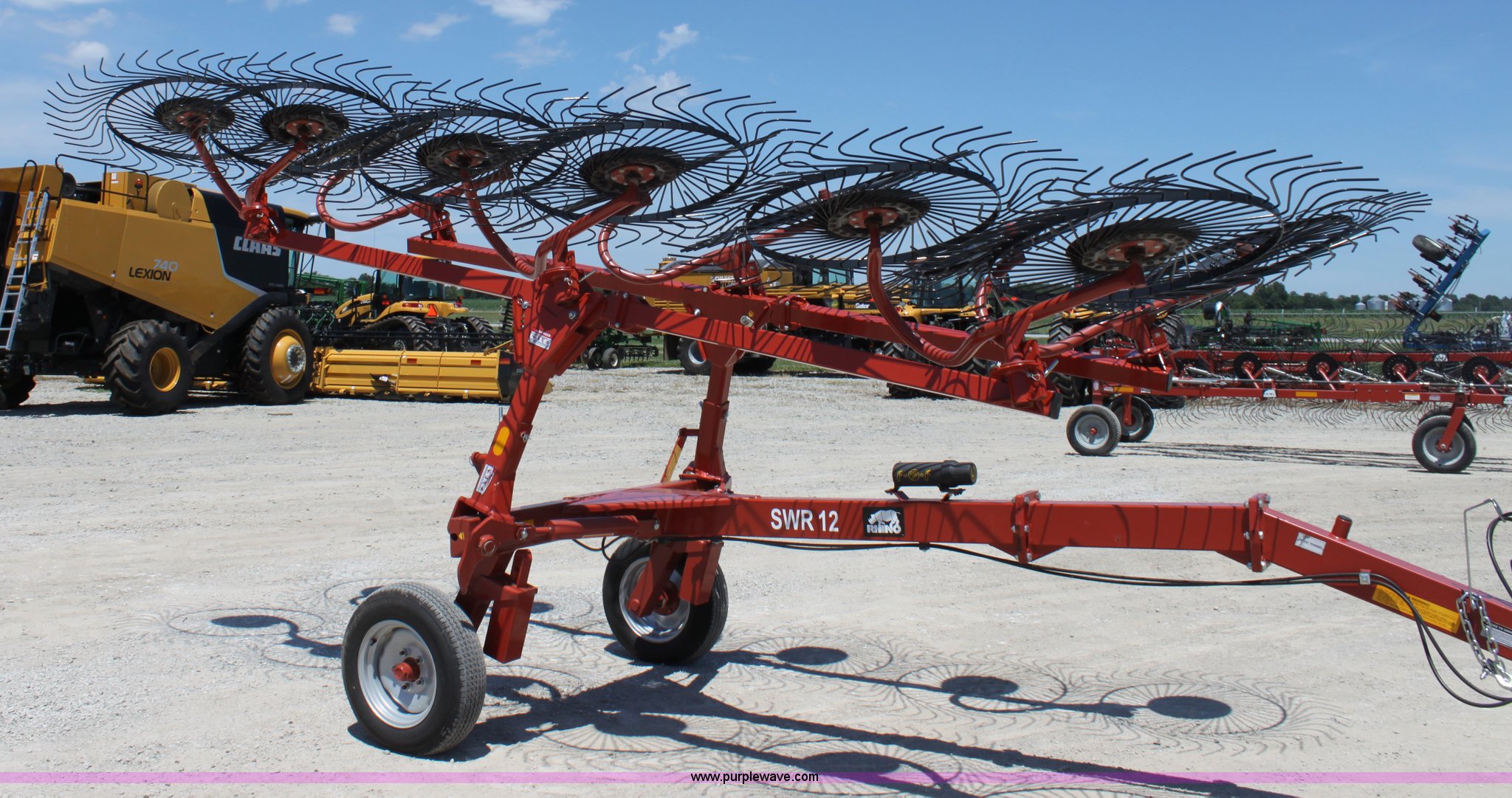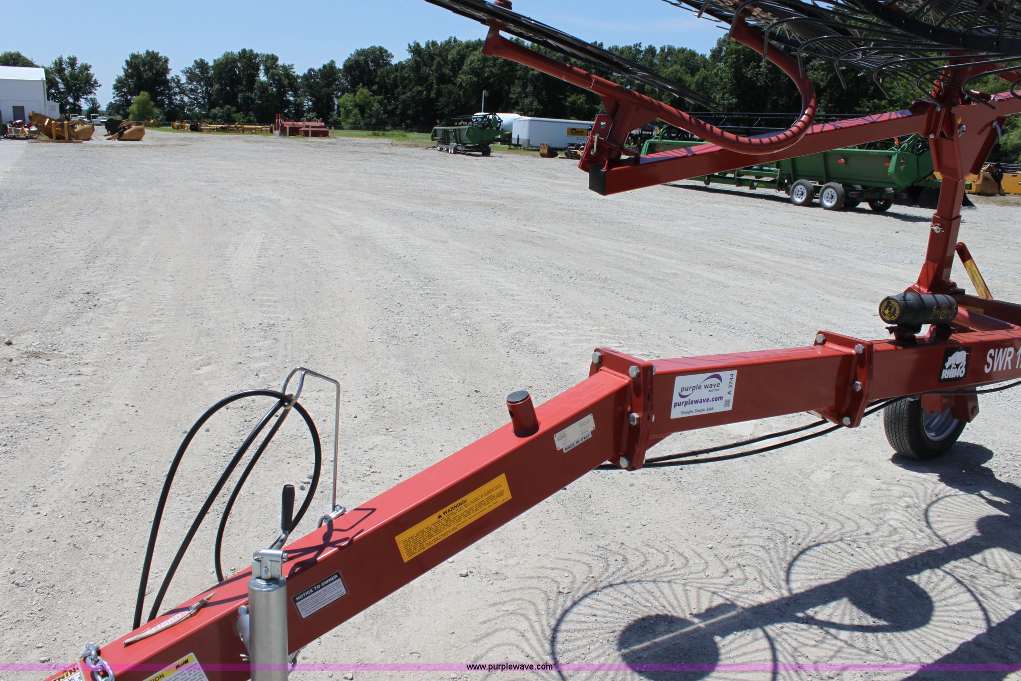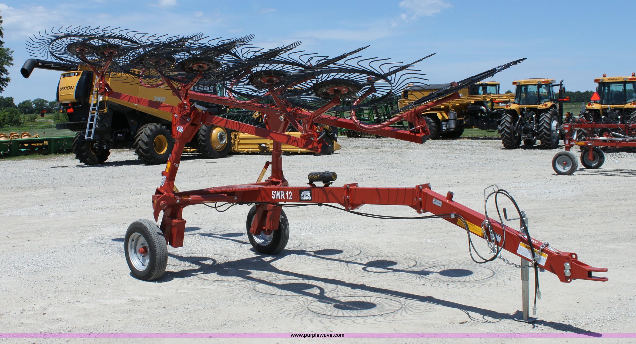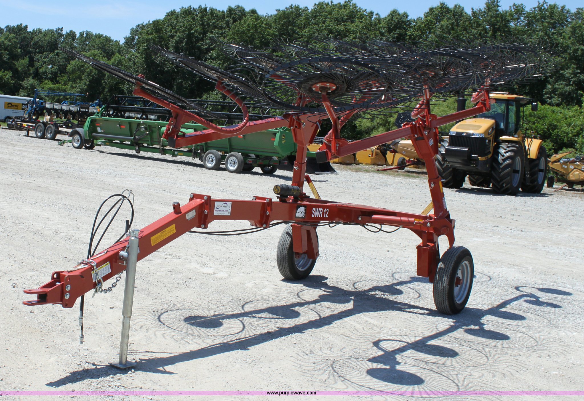 Purple Wave is selling a used Hay Rake in Missouri. This item is a 2009 Rhino SWR12 hay rake with the following: 12 wheels, Hydraulic lift, Two wheel carriage, Pin hitch, 205/75D15 tires, Serial 209922, ID 08F770