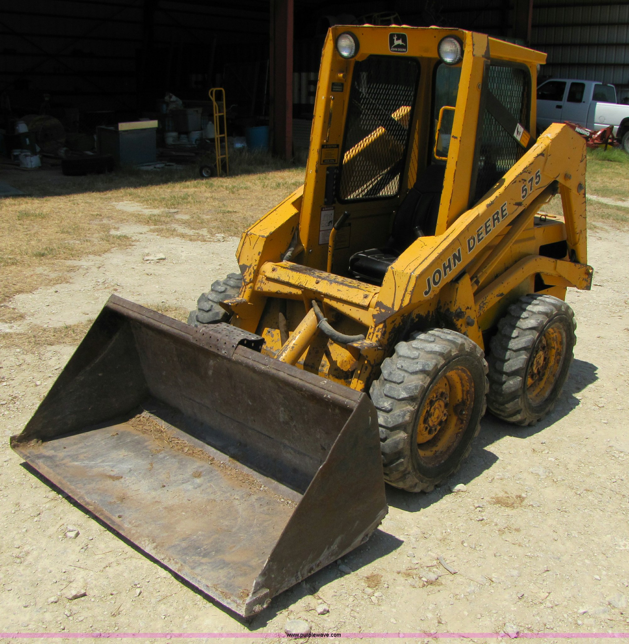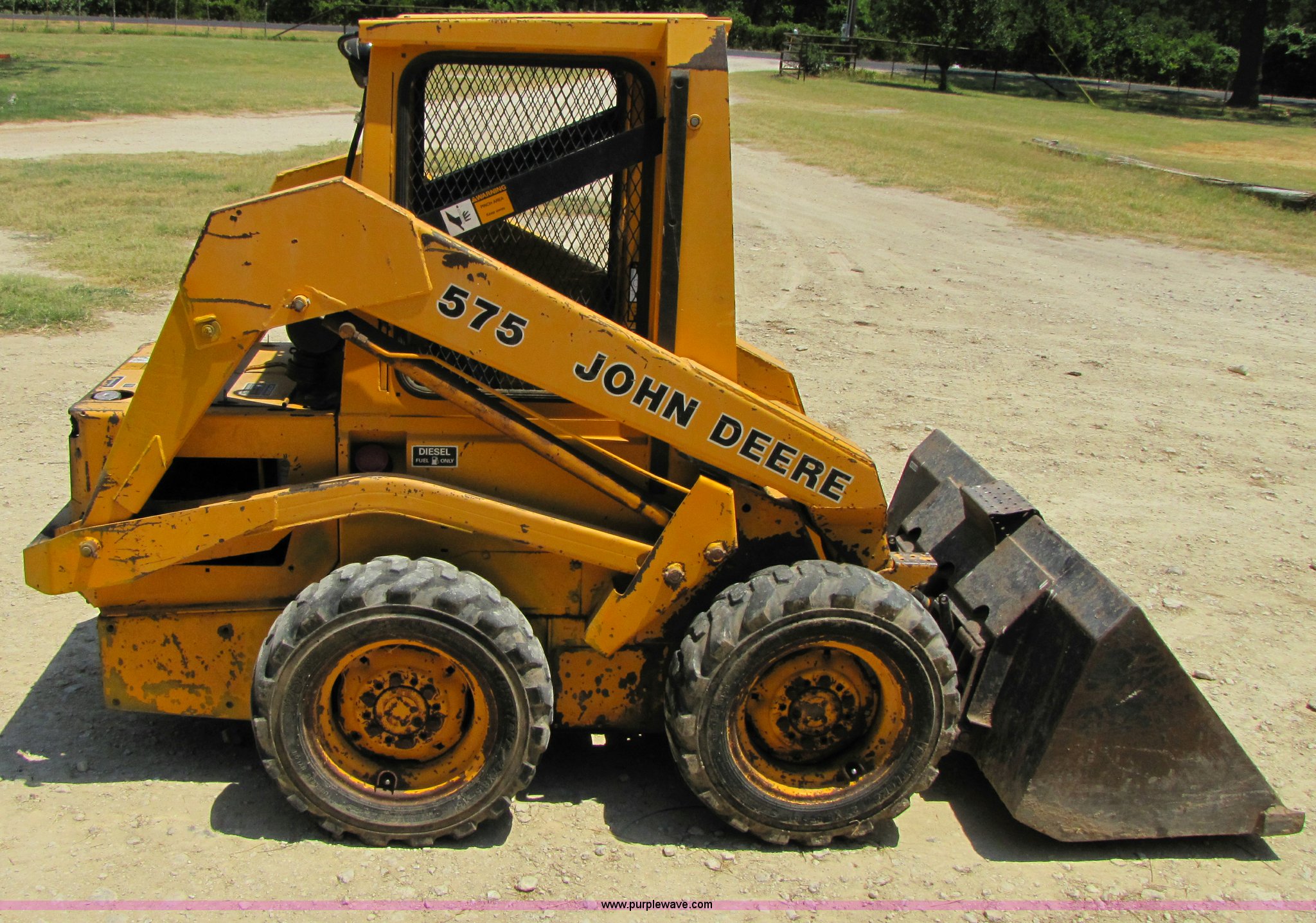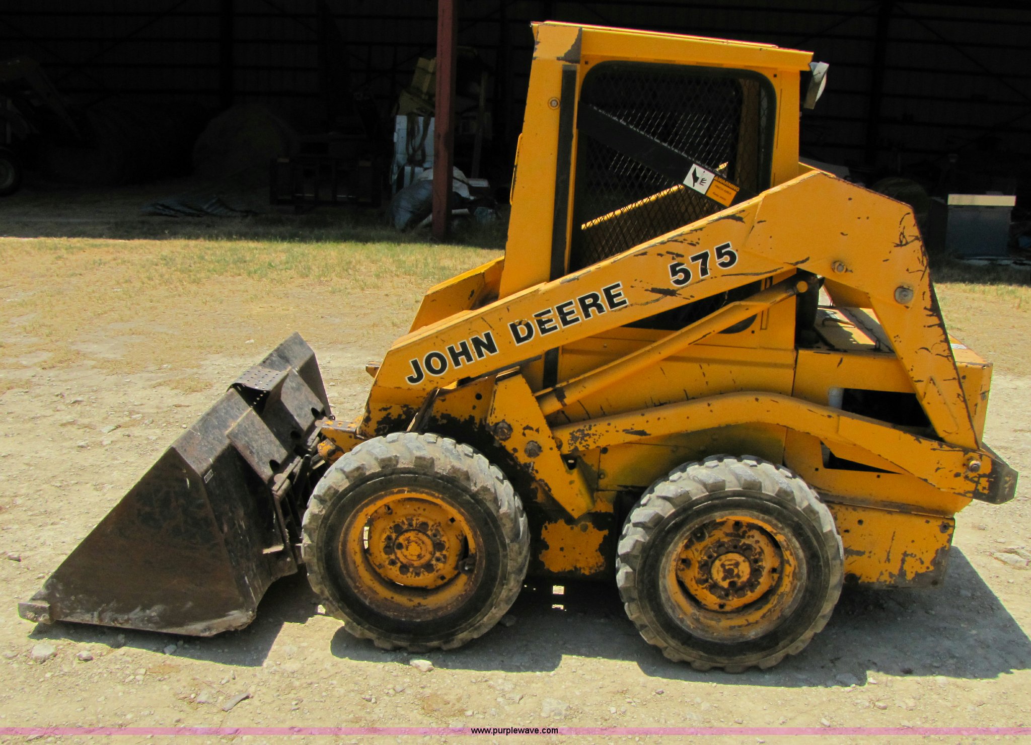 Purple Wave is selling a used Skid Steer Loader in Texas. This item is a 1987 John Deere 575 skid steer loader with the following: 1,737 hours on meter, Yanmar three cylinder diesel engine, 33 HP, Model 3TN82E-SP, Serial C83045D000356, Hydrostatic transmission, 54" bucket, Quick coupler adapter, 27x8.50-15 tires, 3,340 lbs. base operating weight, Serial M00575X370126