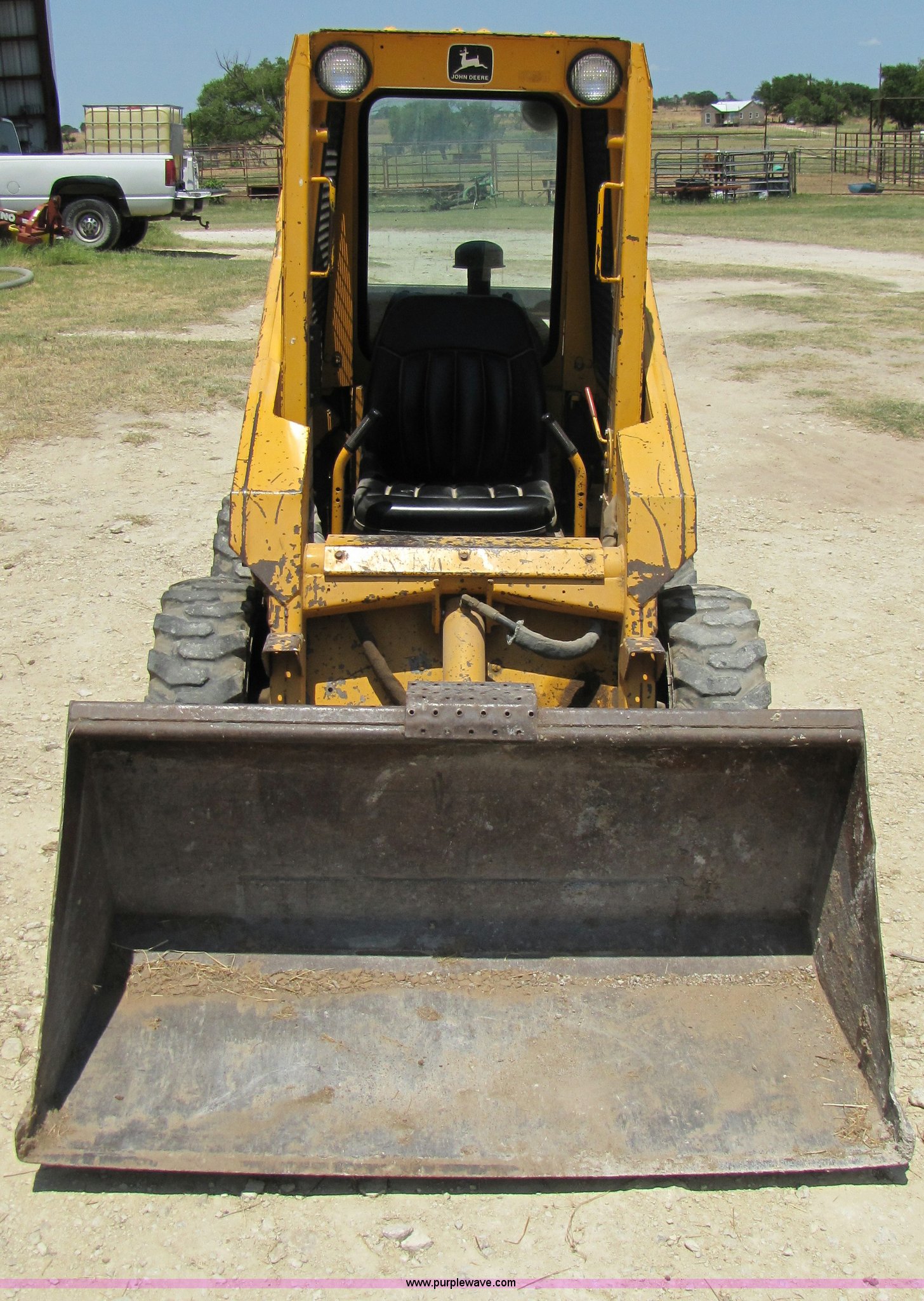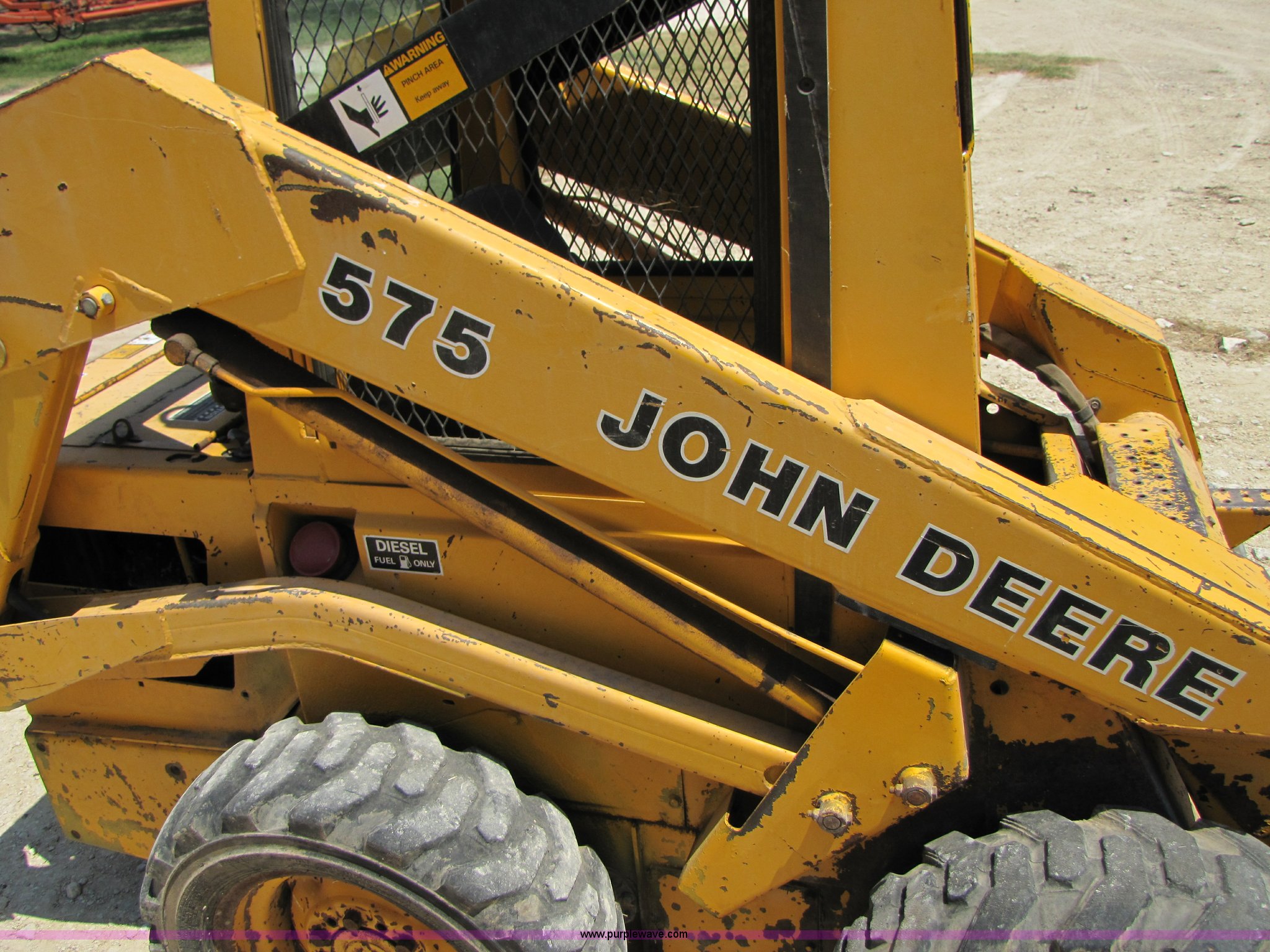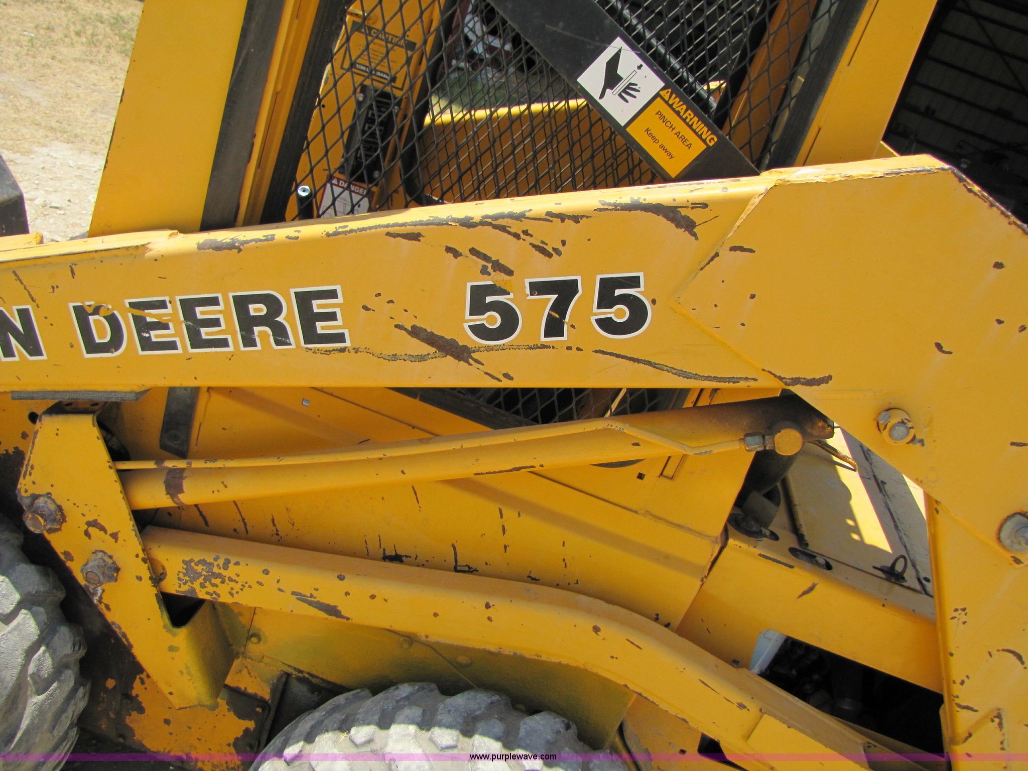 Purple Wave is selling a used Skid Steer Loader in Texas. This item is a 1987 John Deere 575 skid steer loader with the following: 1,737 hours on meter, Yanmar three cylinder diesel engine, 33 HP, Model 3TN82E-SP, Serial C83045D000356, Hydrostatic transmission, 54" bucket, Quick coupler adapter, 27x8.50-15 tires, 3,340 lbs. base operating weight, Serial M00575X370126