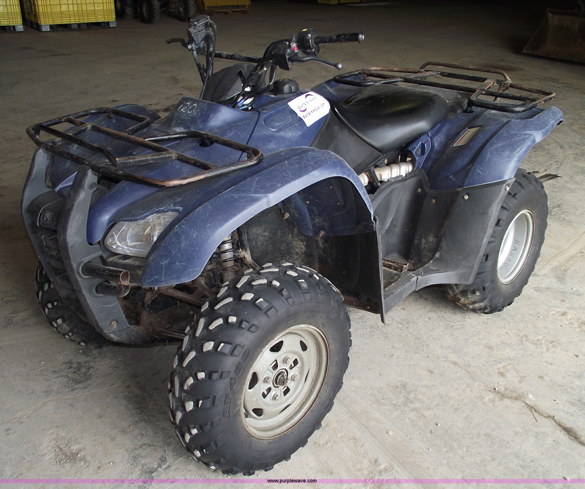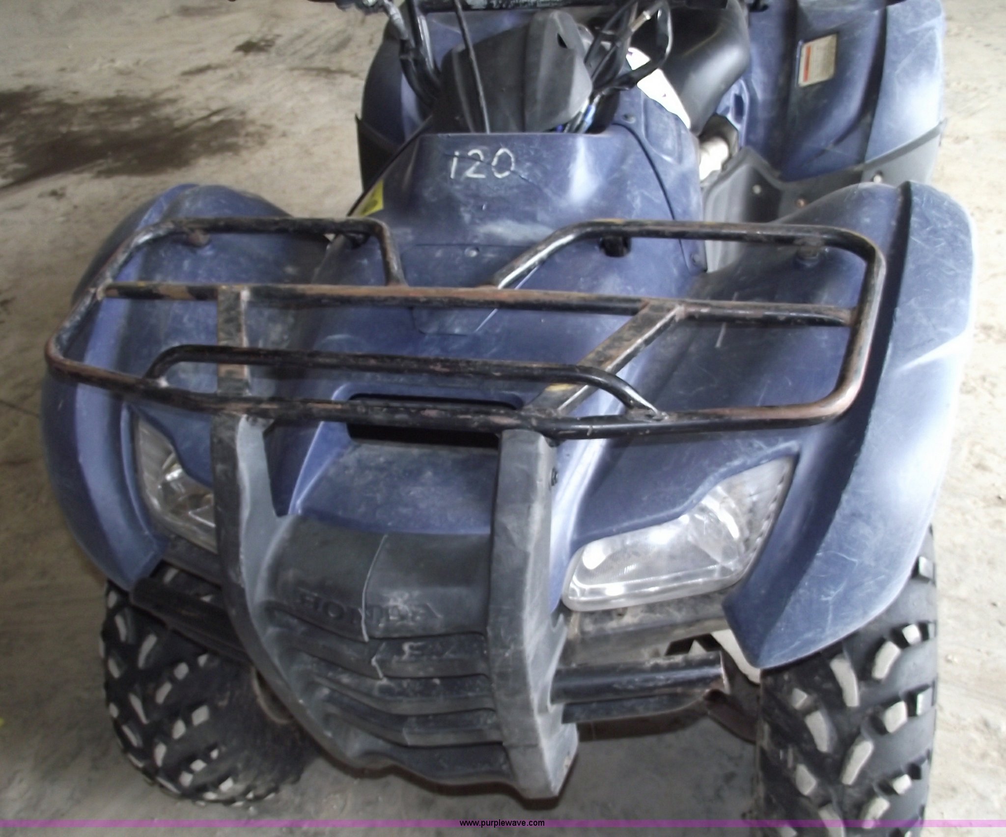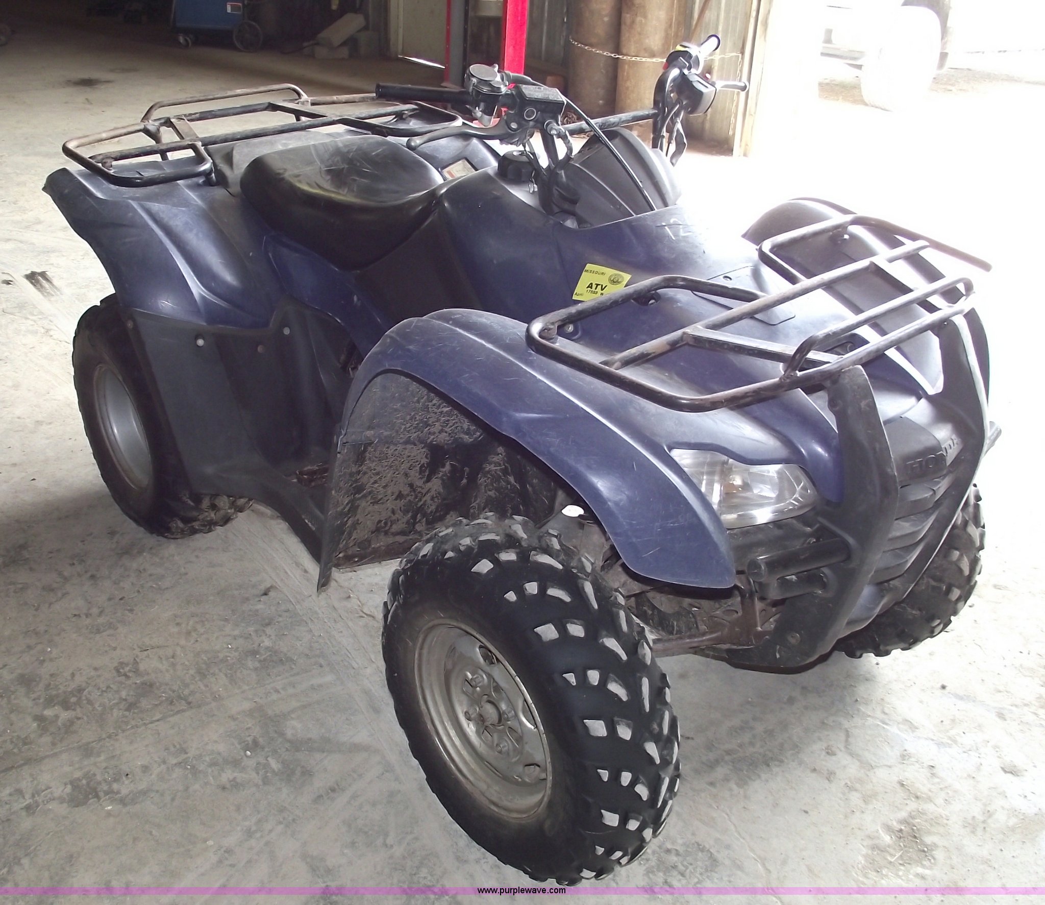 Purple Wave is selling a used ATV in Missouri. This item is a 2007 Honda TRX420 Rancher four wheeler with the following: Five speed transmission with reverse, Shaft driven, Liquid cooled, Electric start, Front and rear racks, Two wheel drive, 24x10-11 rear tires, 24x8-12 front tires, Does not run, Cust.# 120