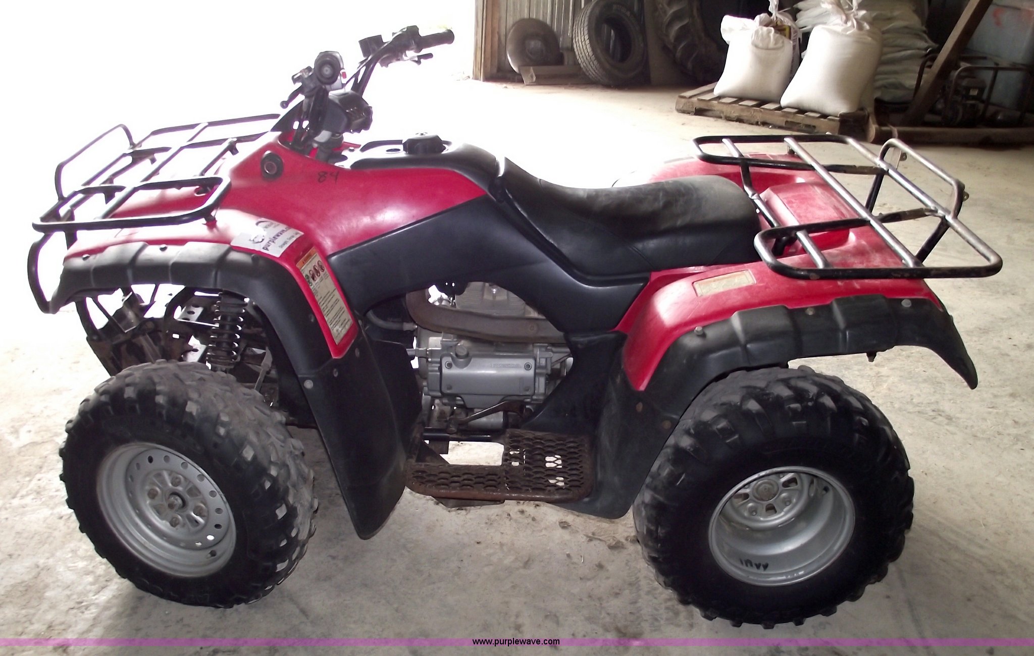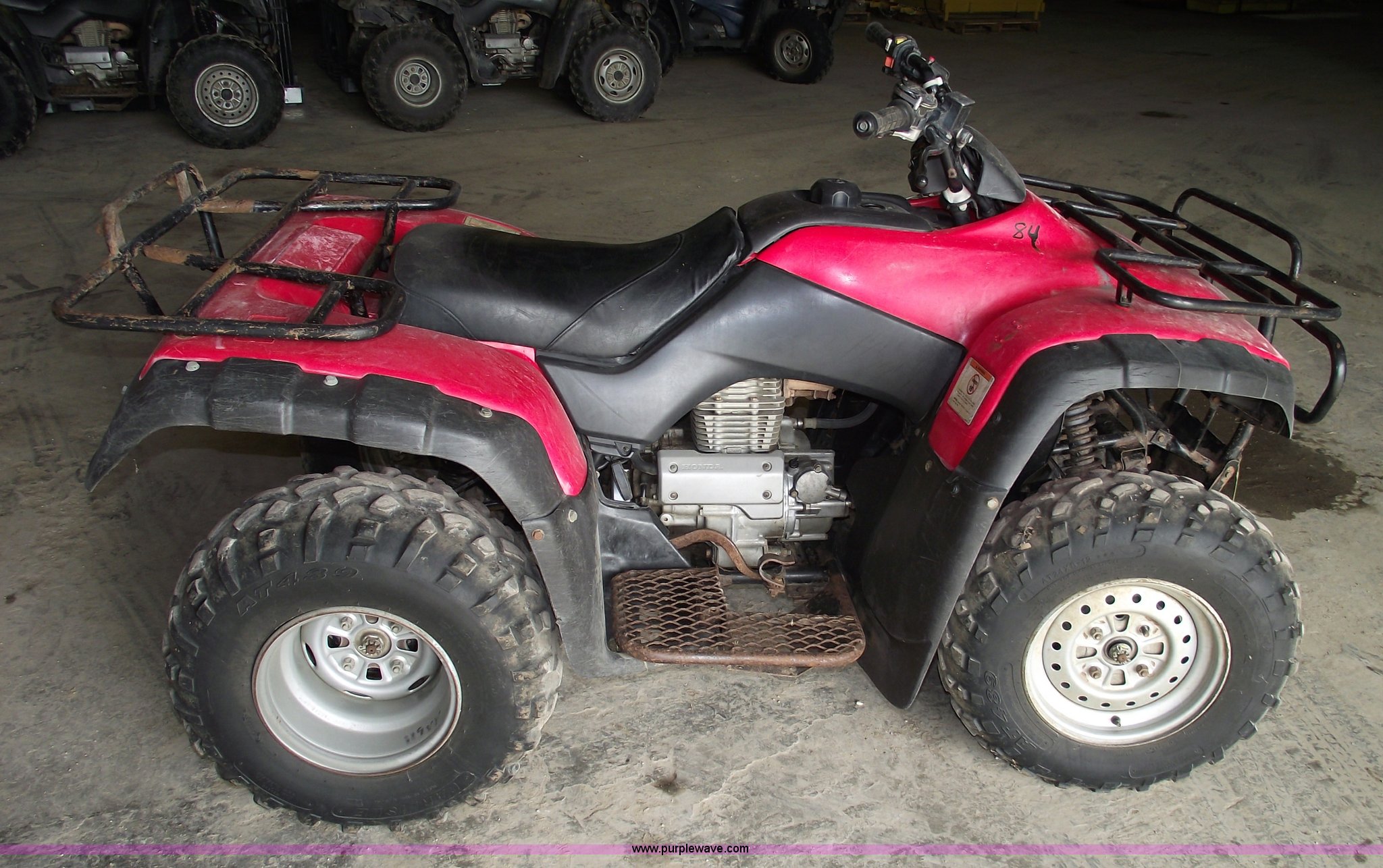 Purple Wave is selling a used ATV in Missouri. This item is a 2003 Honda TRX350 Rancher four wheeler with the following: Five speed manual transmission with reverse, Shaft driven, Electric start, Two wheel drive, Front and rear racks, 24x10-11 rear tires, 24x8-12 front tires, Cust.# 84